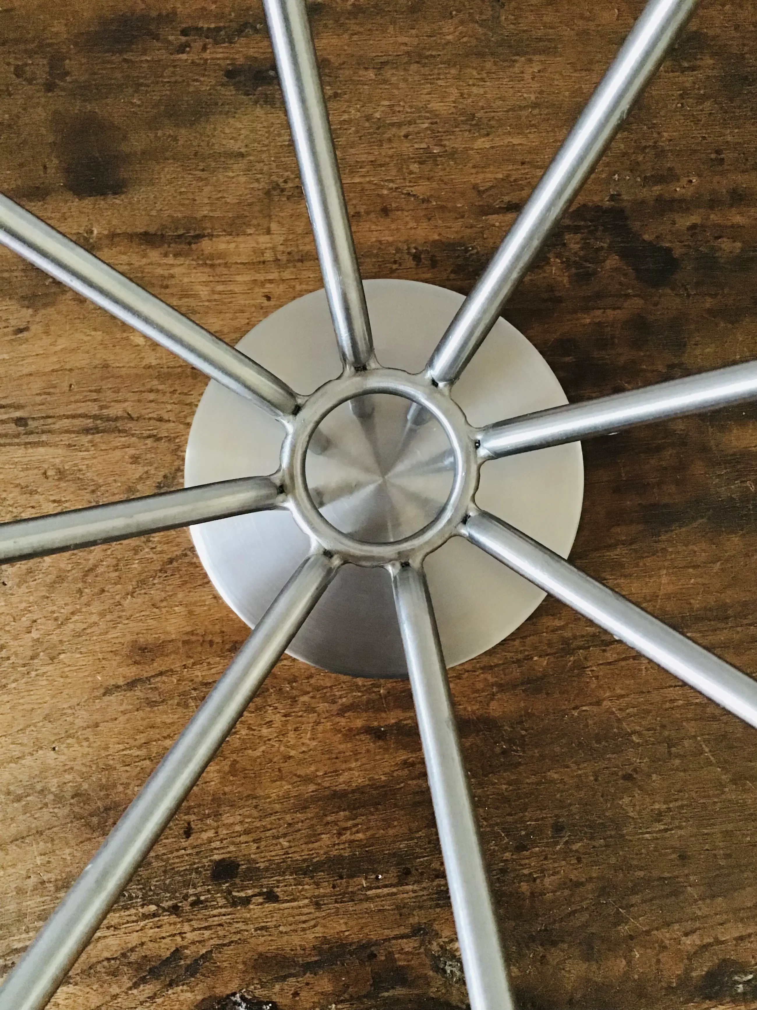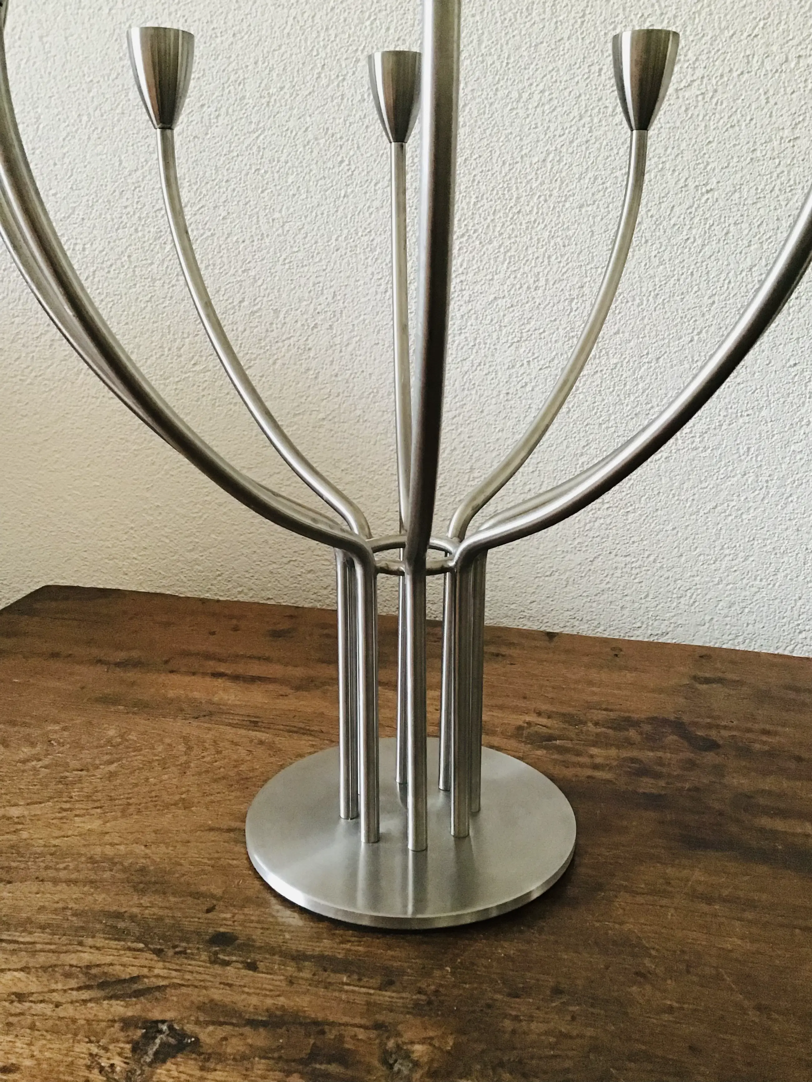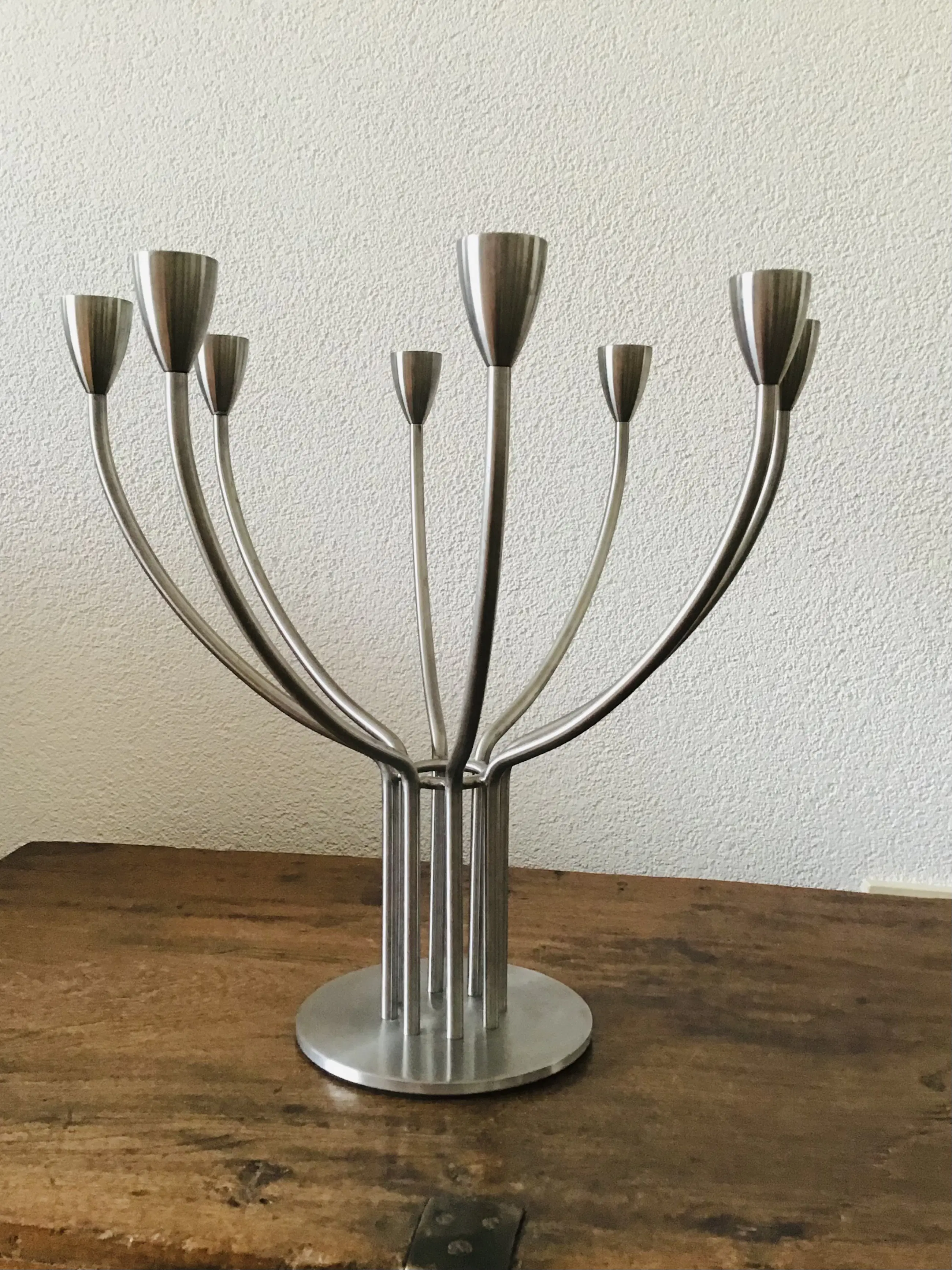 Zeer mooie vintage 8-armige kandelaar, designers Knut en Marianne Hagberg in een geweldige vormgeving en uitstraling Mooi Scandinavisch design Afmeting : H 33 cm en 13,5 cm diameter Gewicht : 2,2 kg Materiaal : RVS Conditie zeer goed Wordt aangetekend verzonden