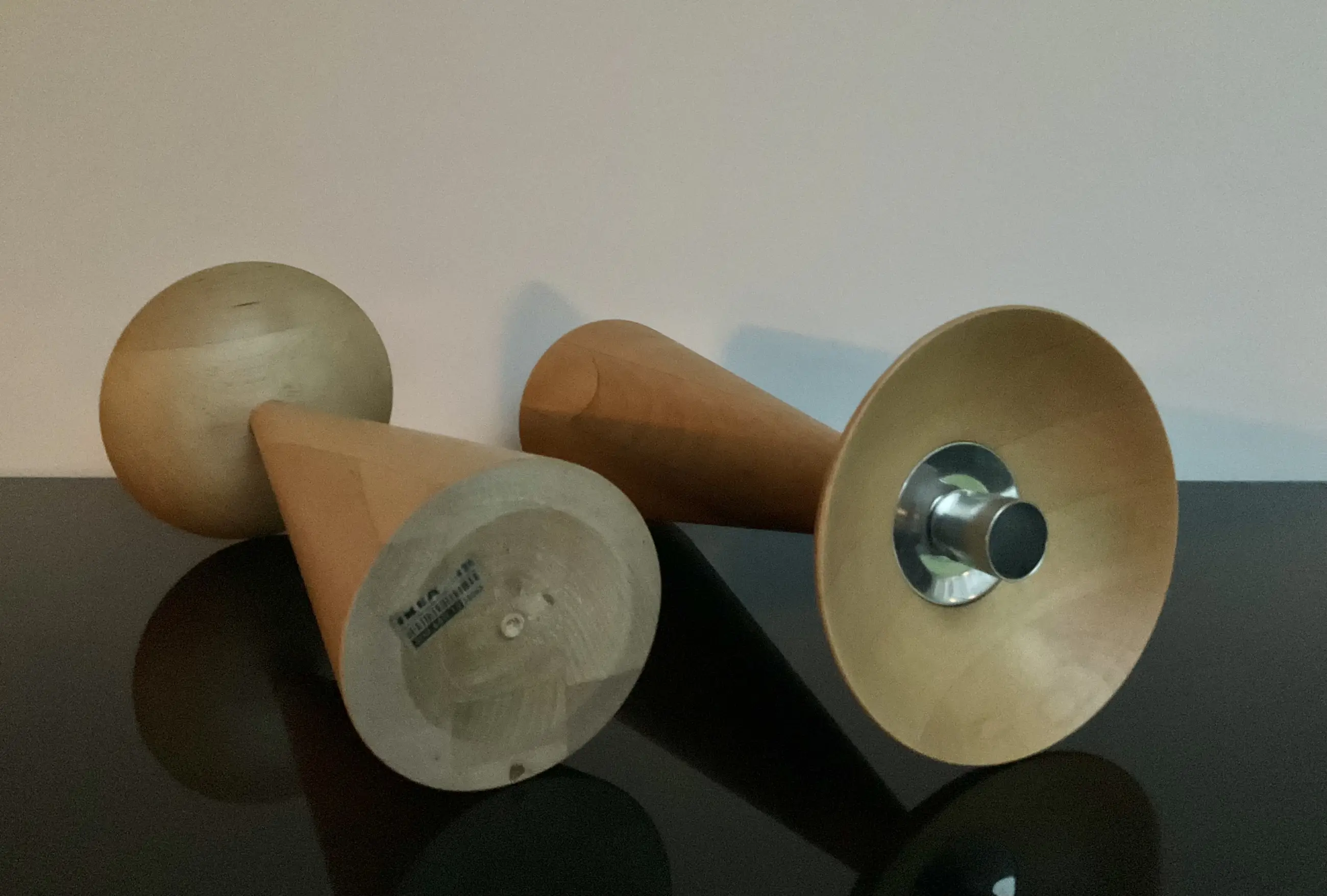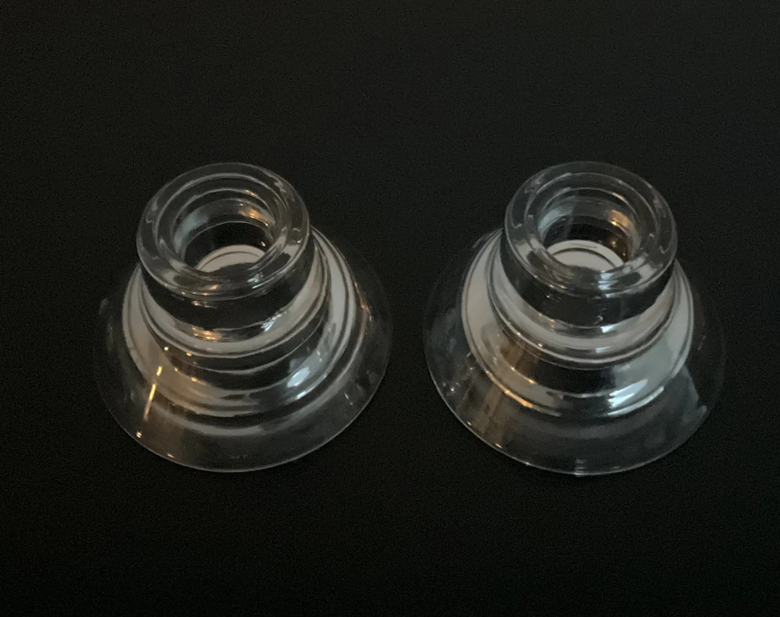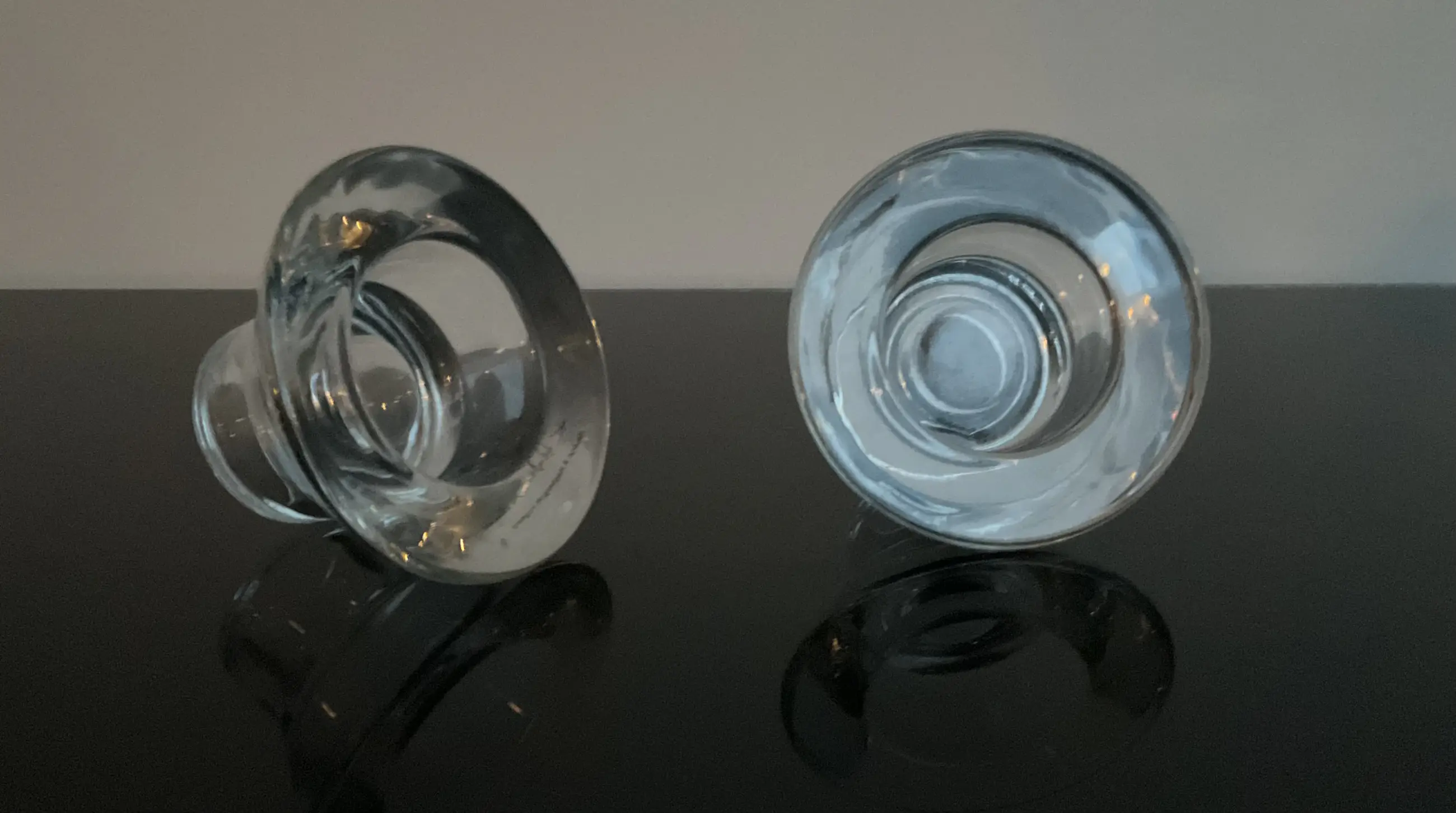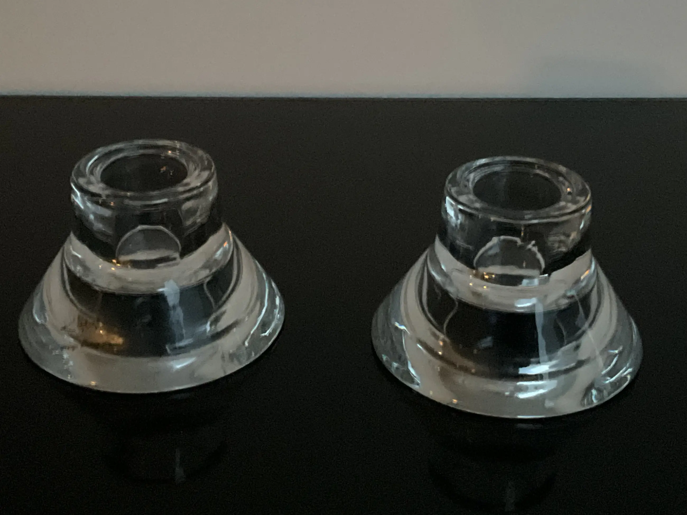 Twee glazen omkeerbare waxinelichthouders-kandelaars van Knut en Marianne Hagberg, waarvan één een sticker heeft. De twee Scandinavisch houten design kandelaars zijn 28 cm hoog.