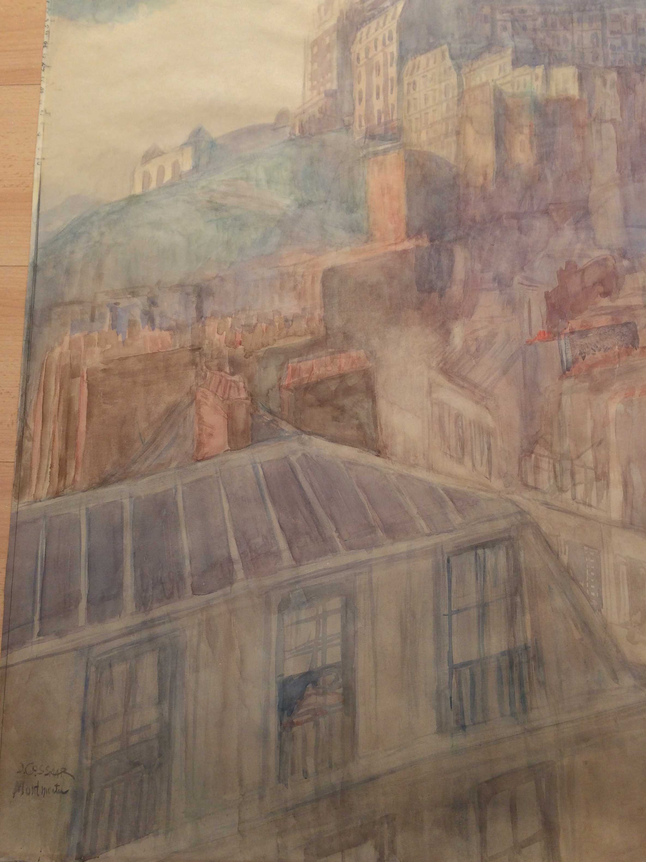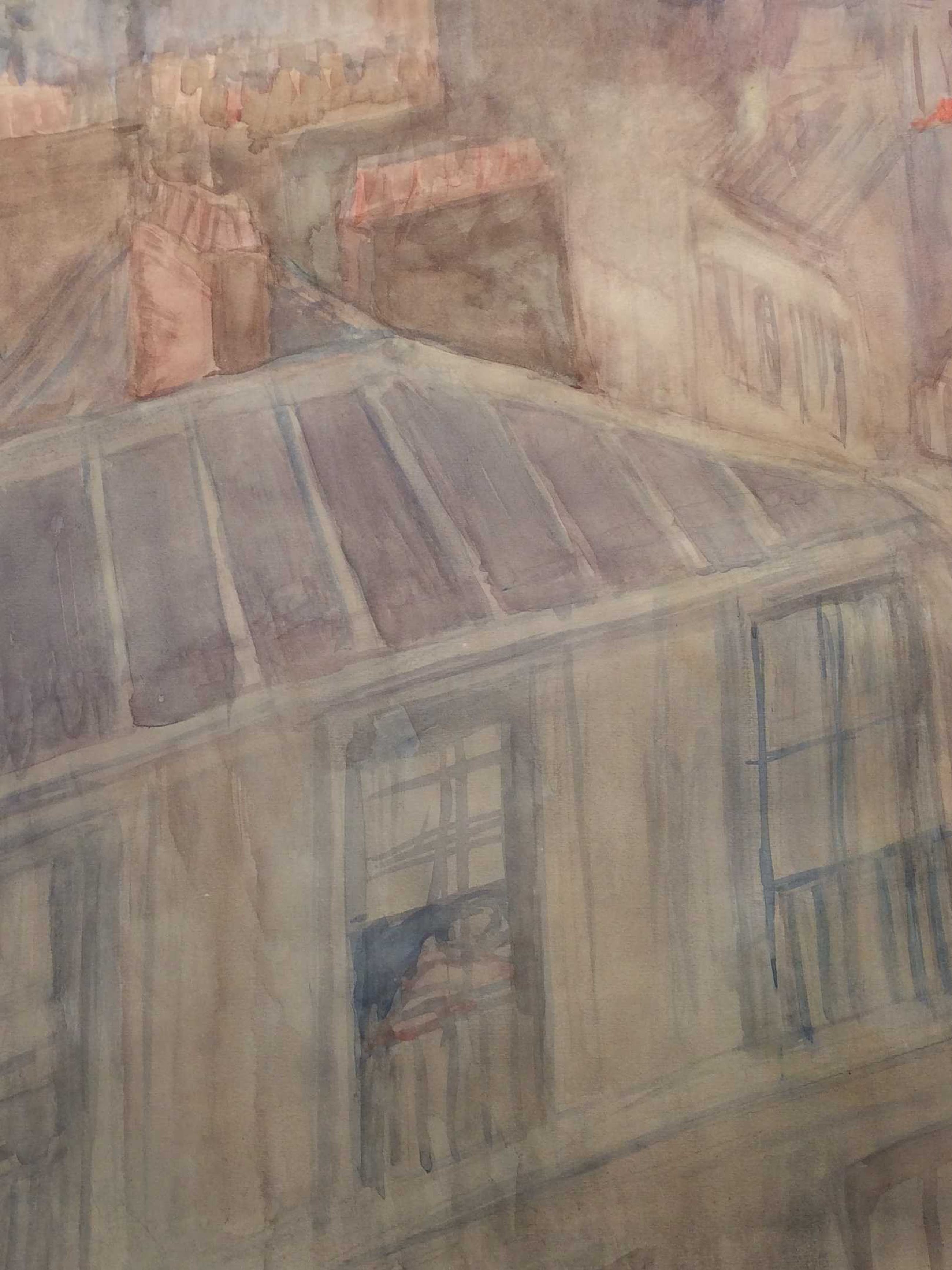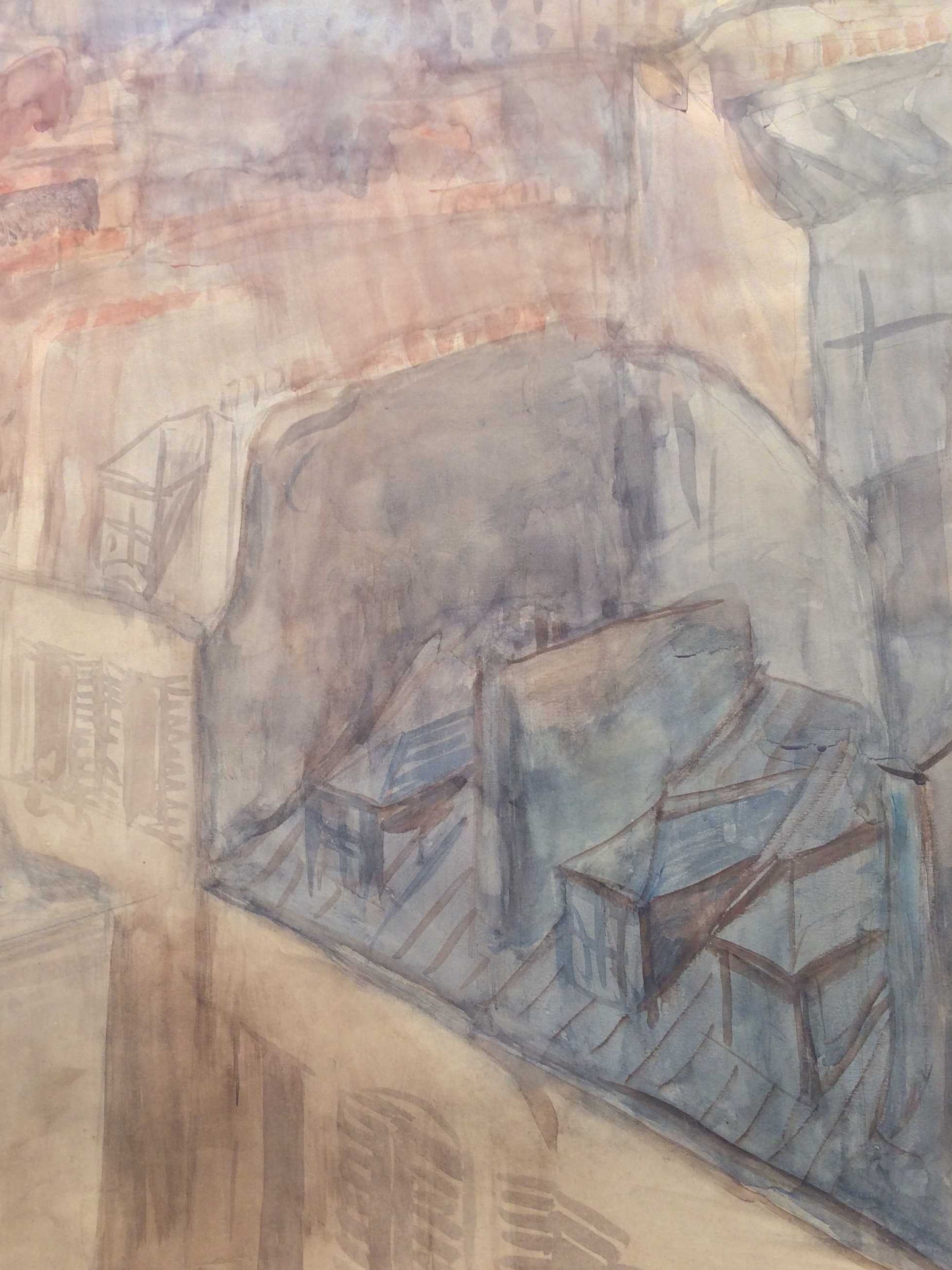 Vroeg werk van de kunstenaar, gemaakt op zijn hotelkamer vanaf zijn balkon.Toen hij op studiereis was. Een zeer uniek werk qua grootte. En natuurlijk ook des te meer dat het was afgebrand.