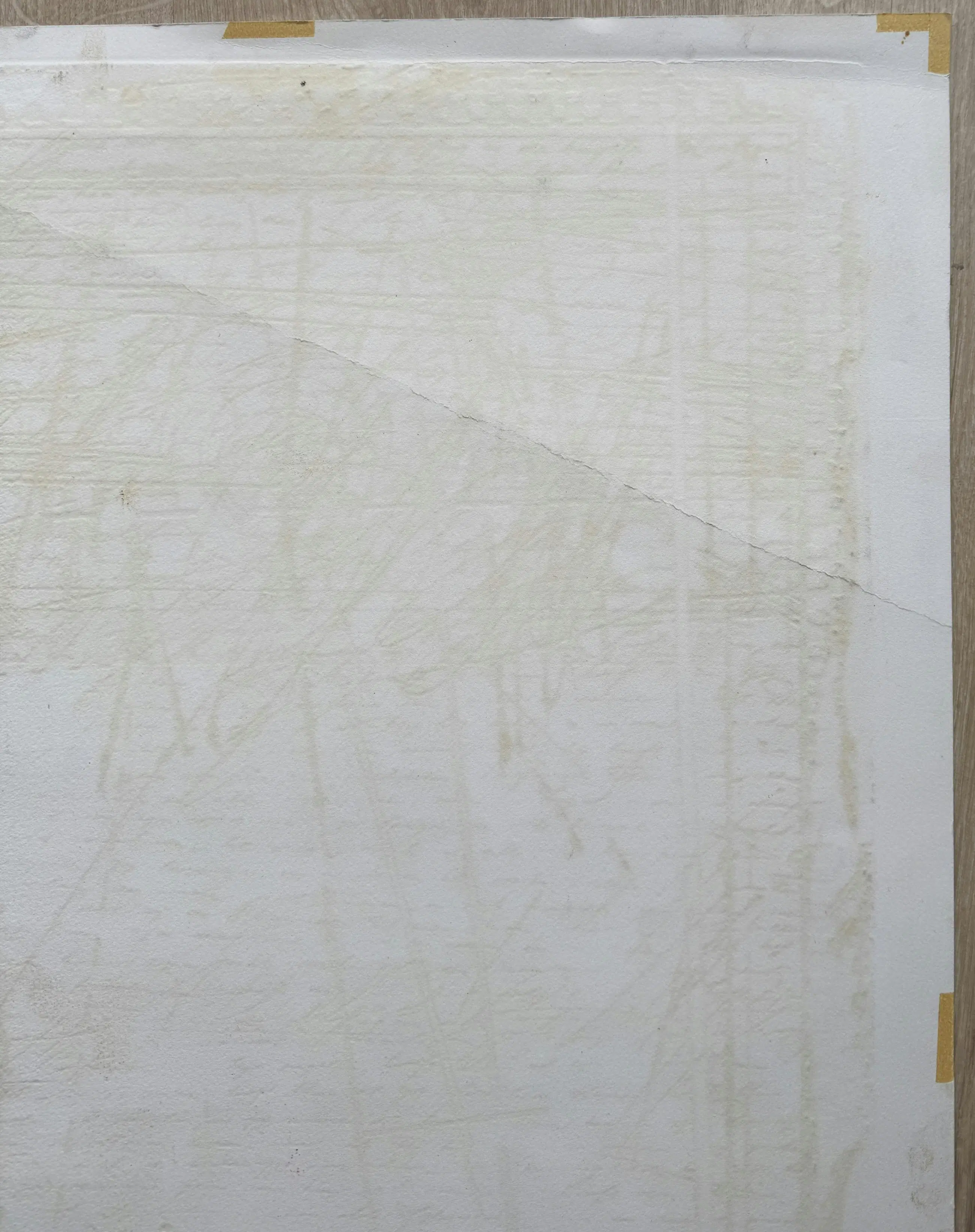 Vouwlijn op de achterzijde rechtsboven, maar deze is amper zichtbaar aan de voorkant. Plekken van verkleuring in de marges van een eerdere inlijsting. Lichte plekjes van foxing in de marges. Op verzoek kunnen extra foto’s toegestuurd worden.