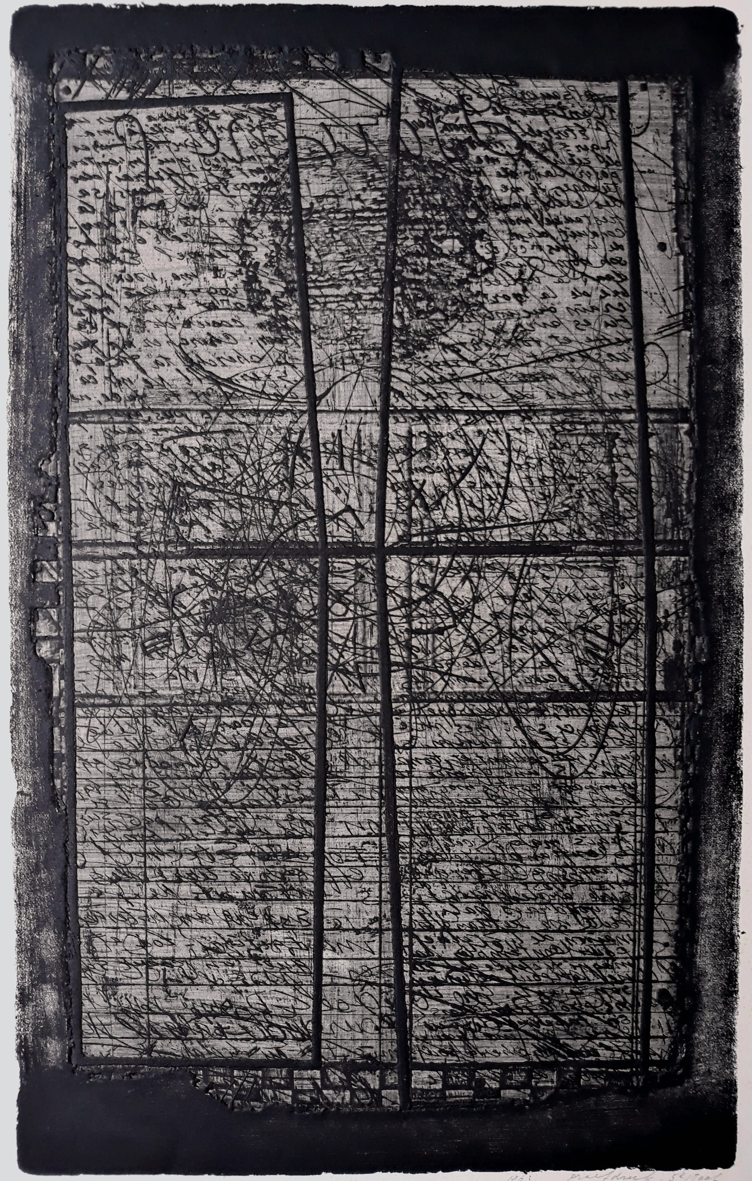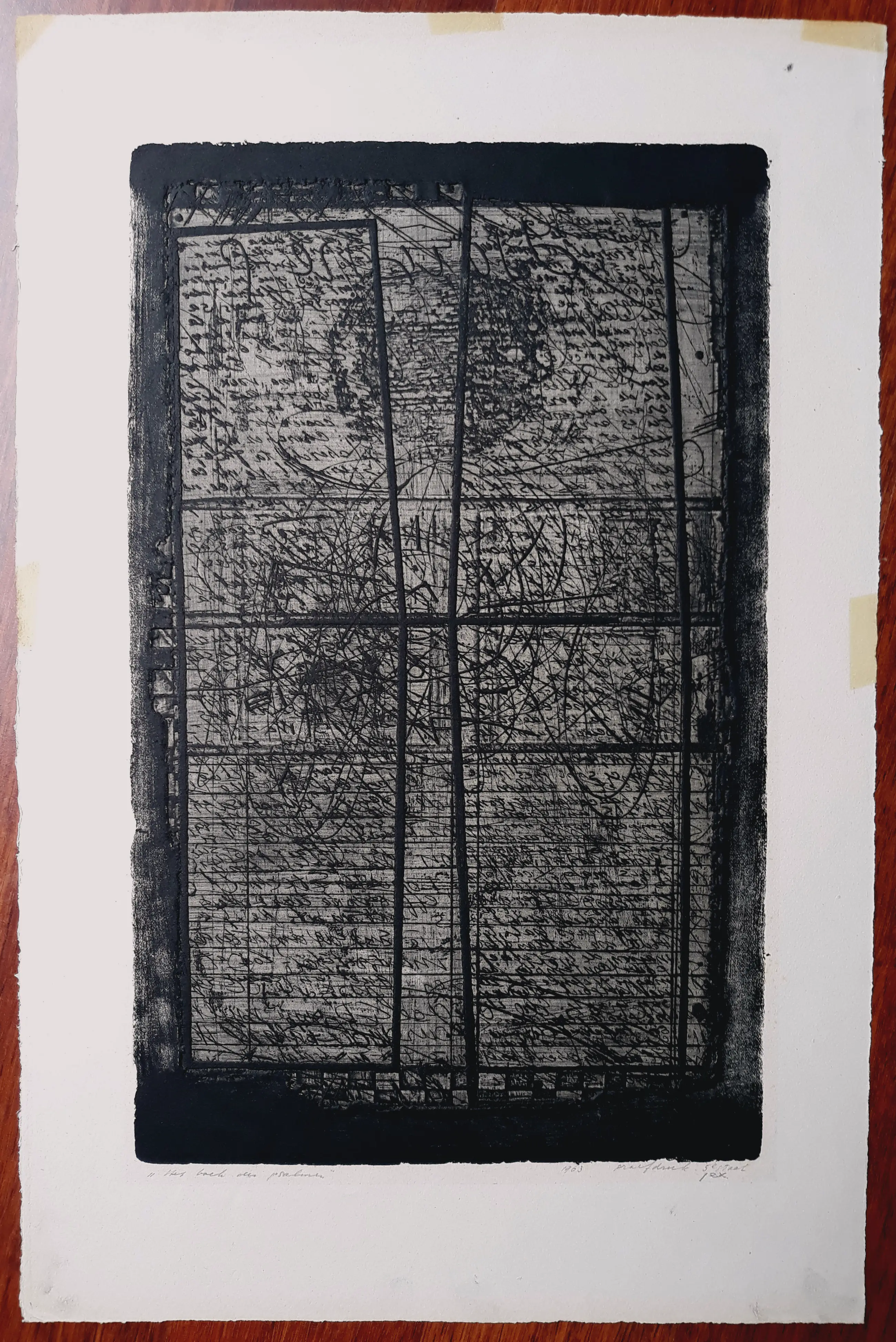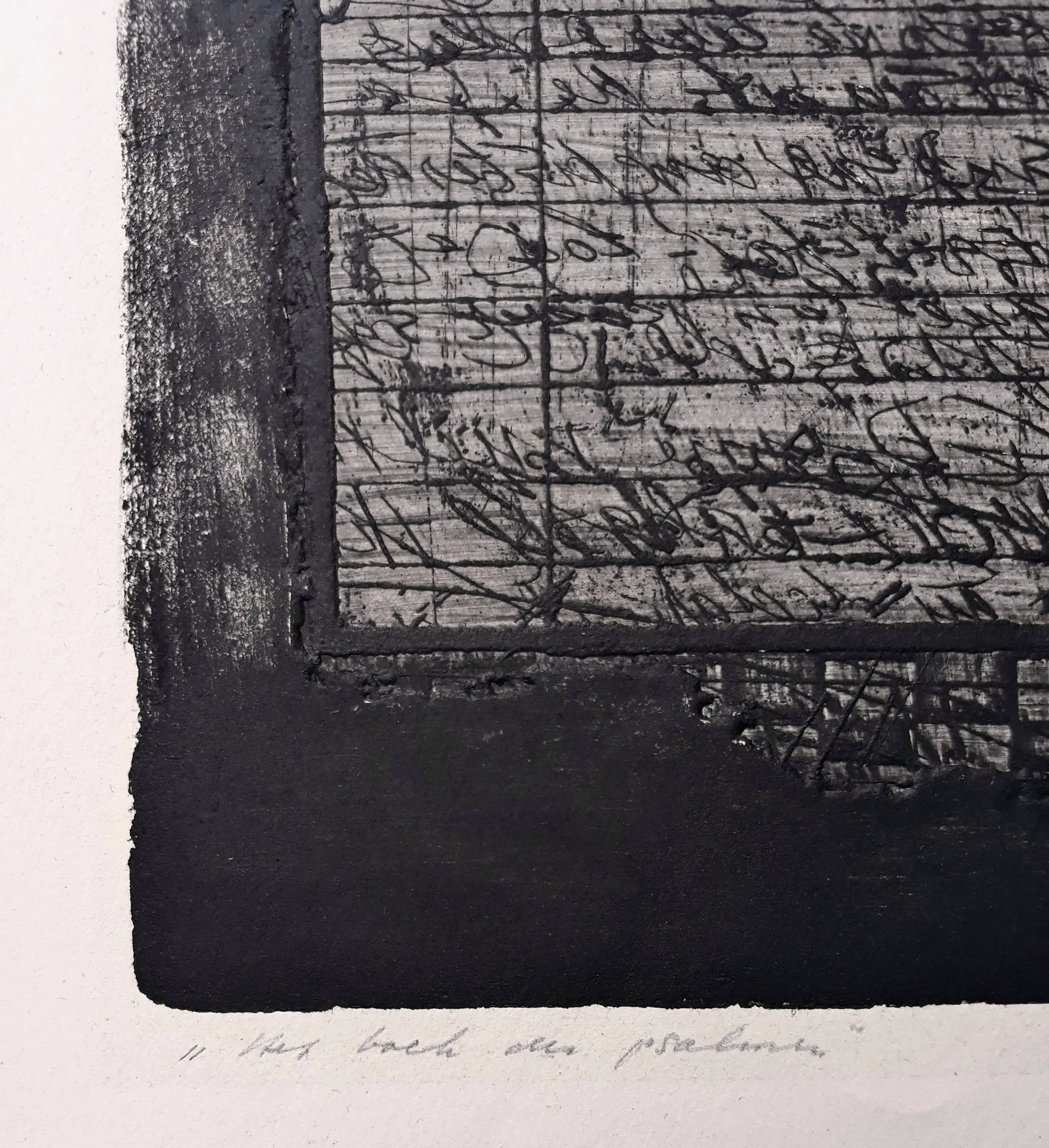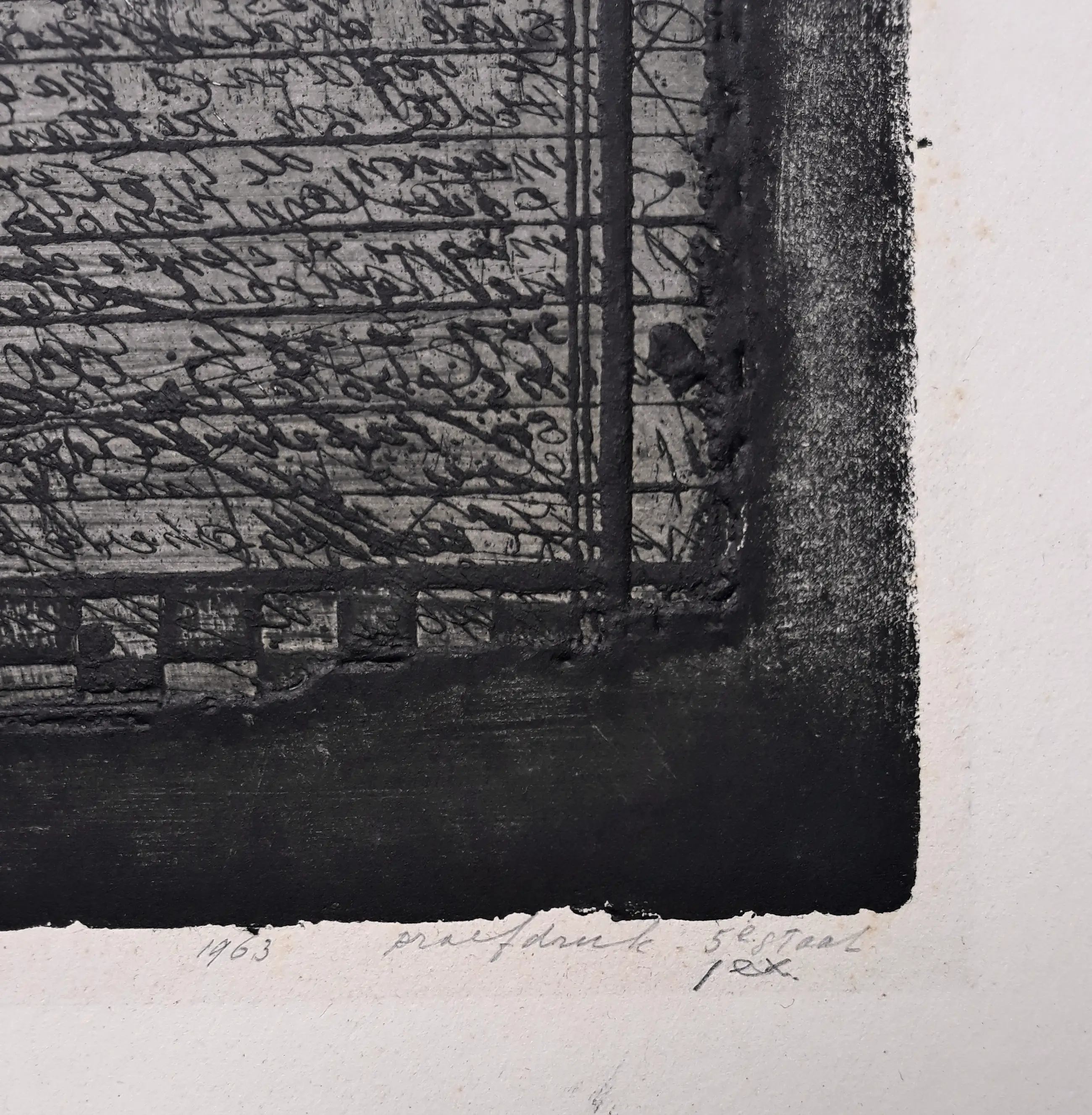 Karakteristieke compositie van Ko Oosterkerk. Ets op Arches papier, met potlood gedateerd (1963), genummerd (“proefdruk 5e staat / 1 ex.”) en getiteld (“Het boek der Psalmen”). In goede conditie; enkel wat plakresten aan de uiterste randen van het blad en een heel lichte verkleuring van een vorig passe-partout. Opnieuw ingelijst met passe-partout is het werk zeer goed.