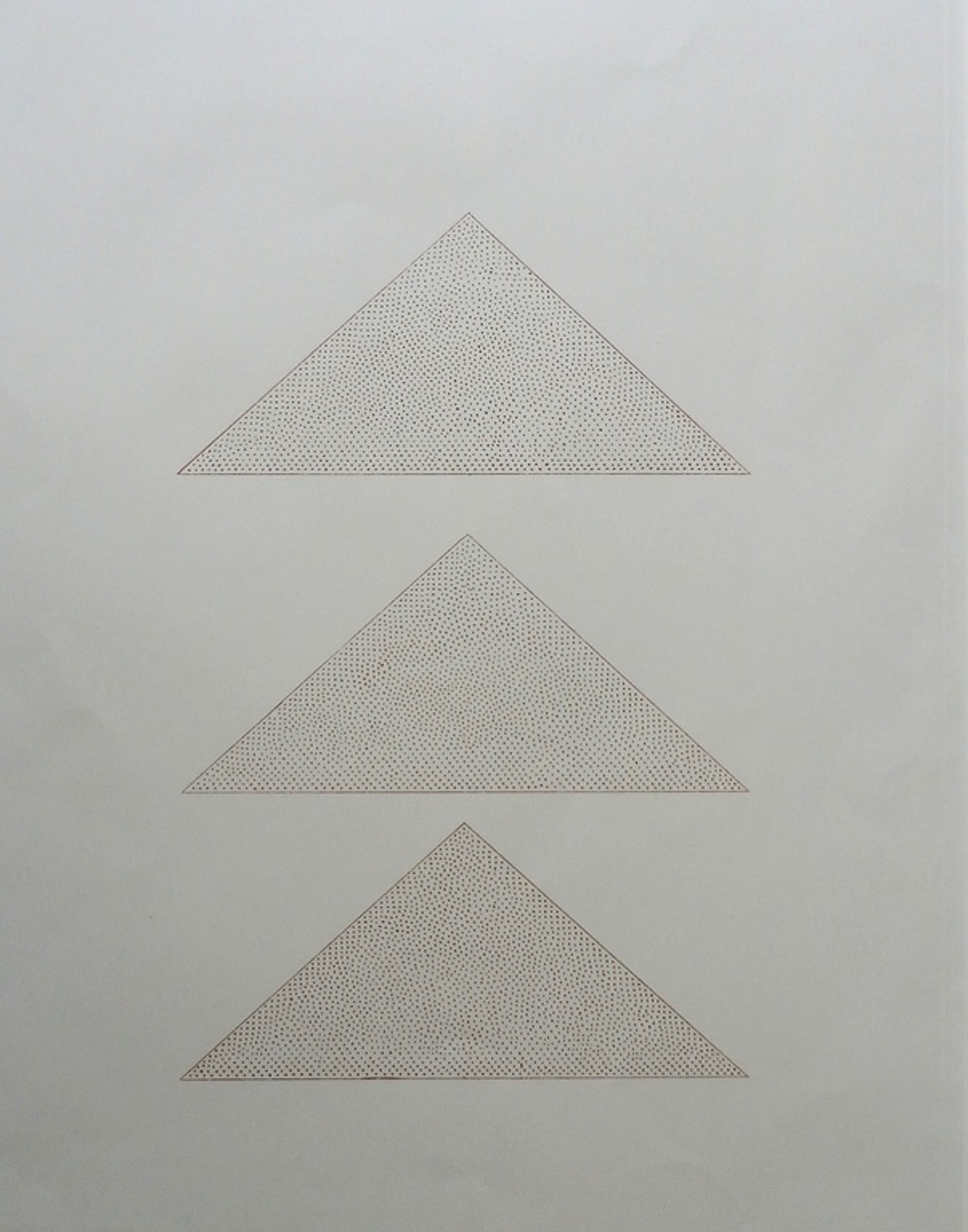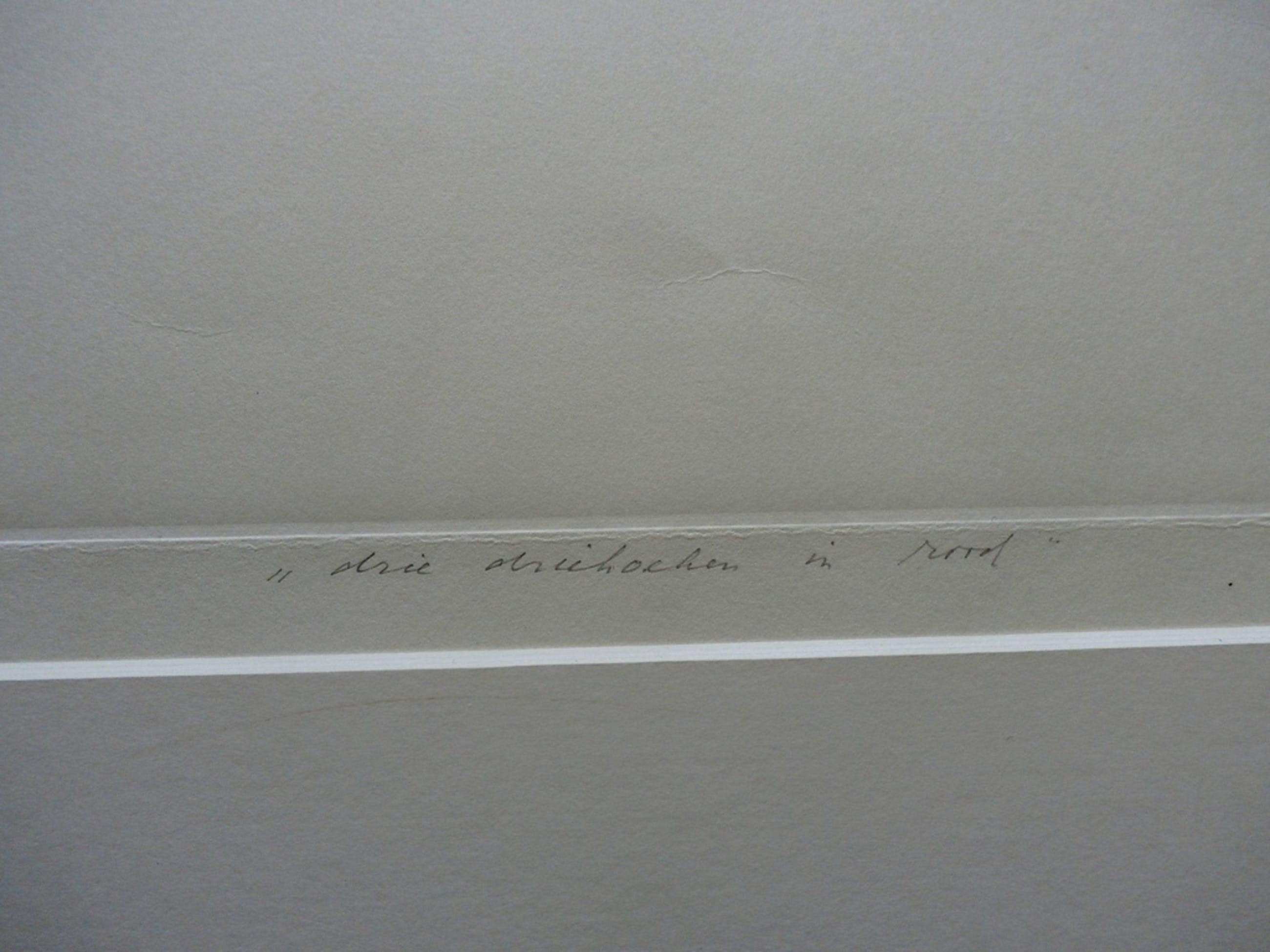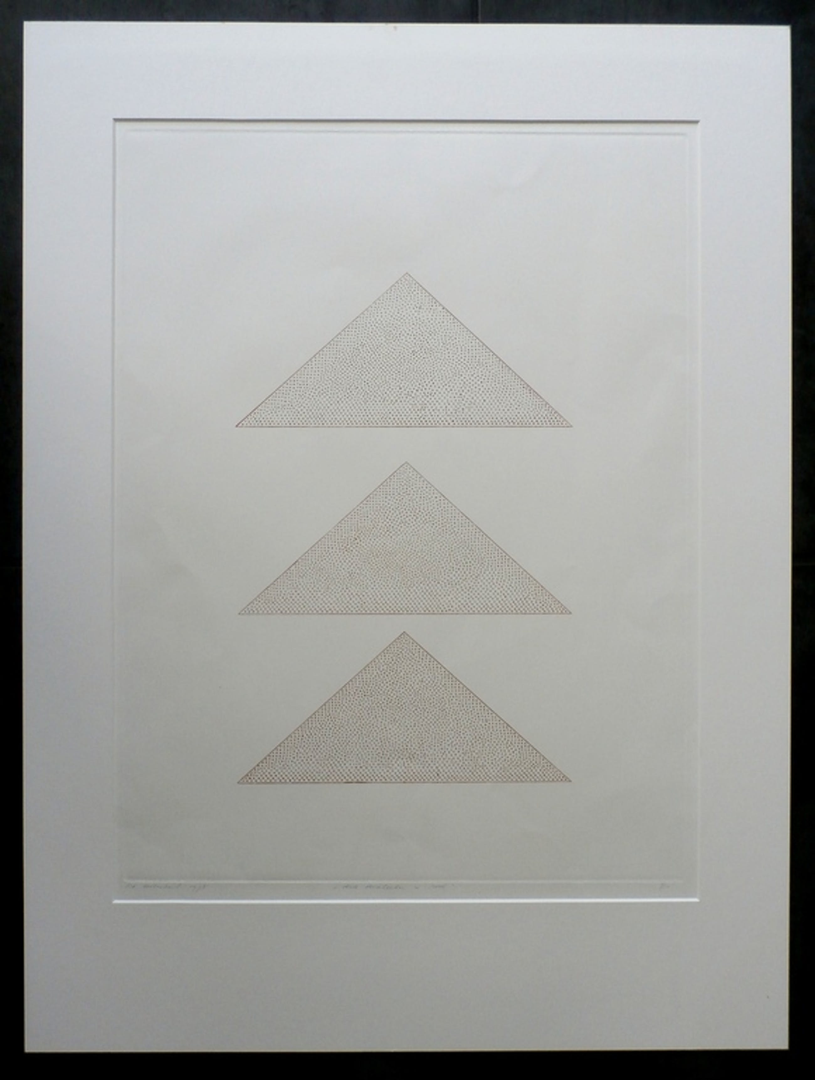 Mooie ets van Ko Oosterkerk. Titel: Drie driehoeken in rood. Jaar: 1978. Afmetingen incl passe-partout: H87 x b66 cm; Afmetingen voorstelling: H43,5 x b28,5 cm; Gesigneerd, linksonder, door de kunstenaar met potlood. Nummer: 9/15.