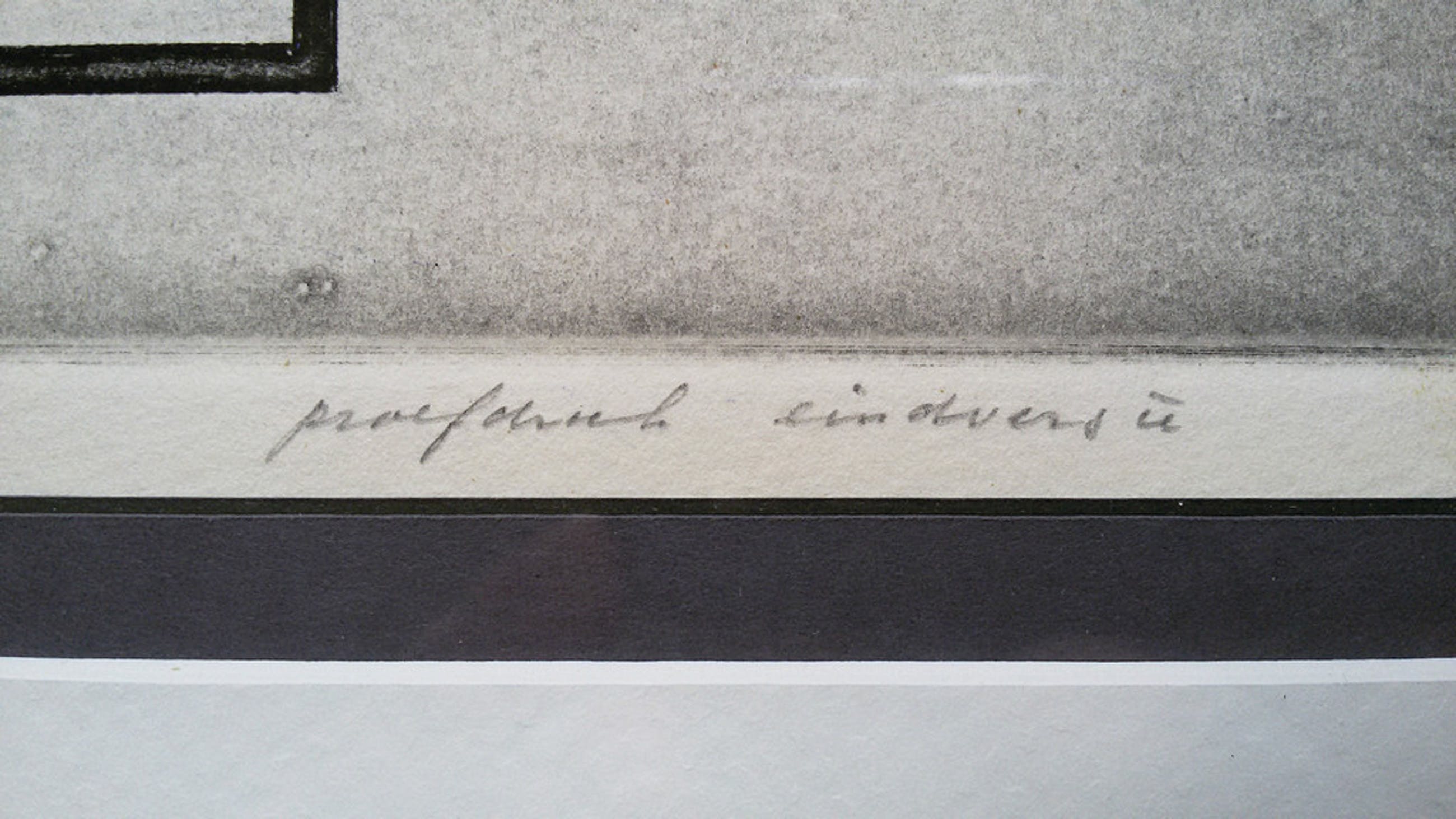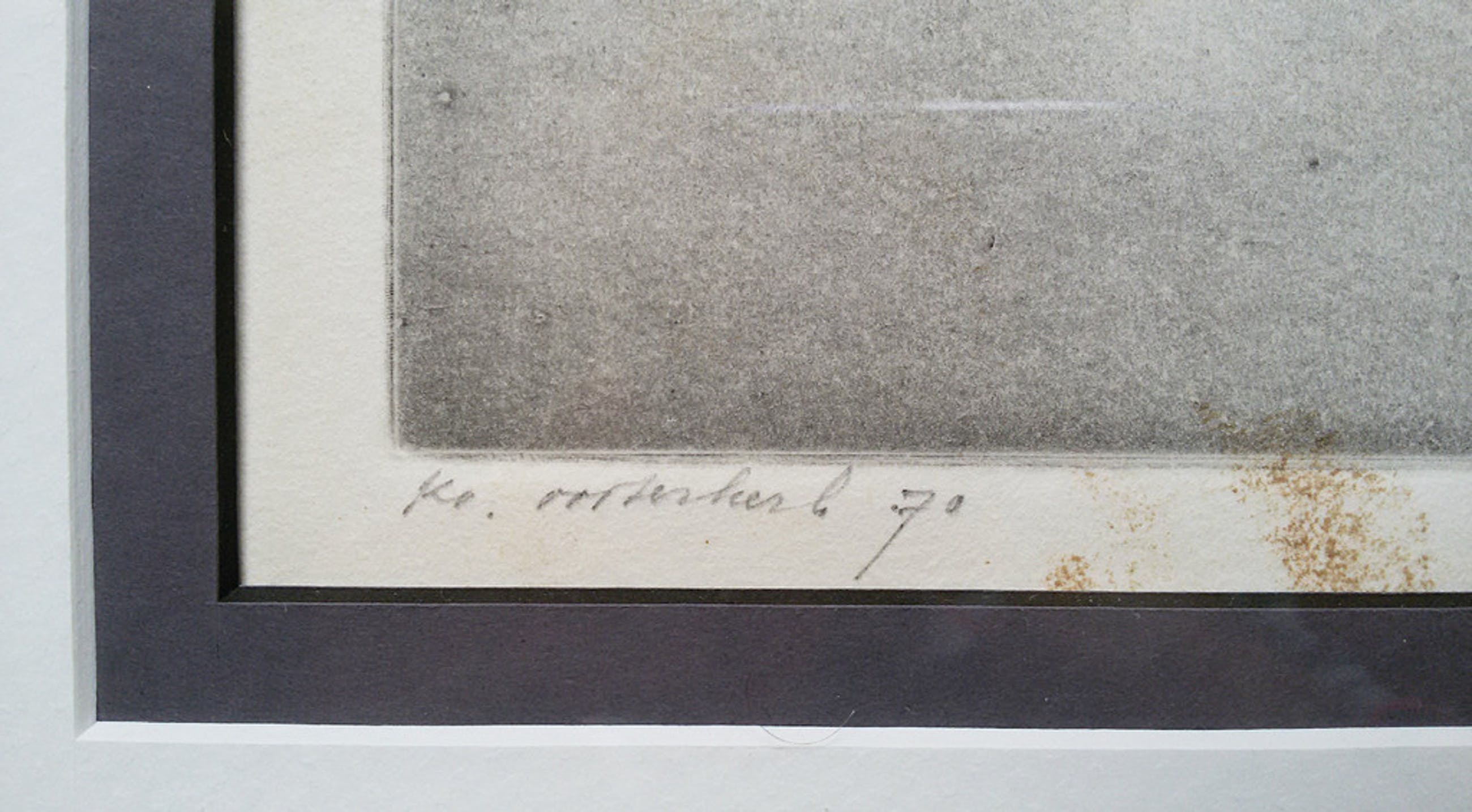 Prachtige ets van Ko Oosterkerk uit 1970. Met potlood gesigneerd, gedateerd en getiteld, een proefdruk van de eindversie. Prachtig ingelijst, achter glas en met luxueus dubbel passe-partout. Alles in uitstekende staat, al moet er bij vermeld worden dat er op het etsblad wat lichte vlekjes zitten, waarvan ik niet met zekerheid kan zeggen wat het is (ouderdomsvlekjes, oxidatie, verfresten?). De meest prominente van deze vlekjes is te zien op foto 3, bij de signatuur, de andere zijn 100% niet storend.