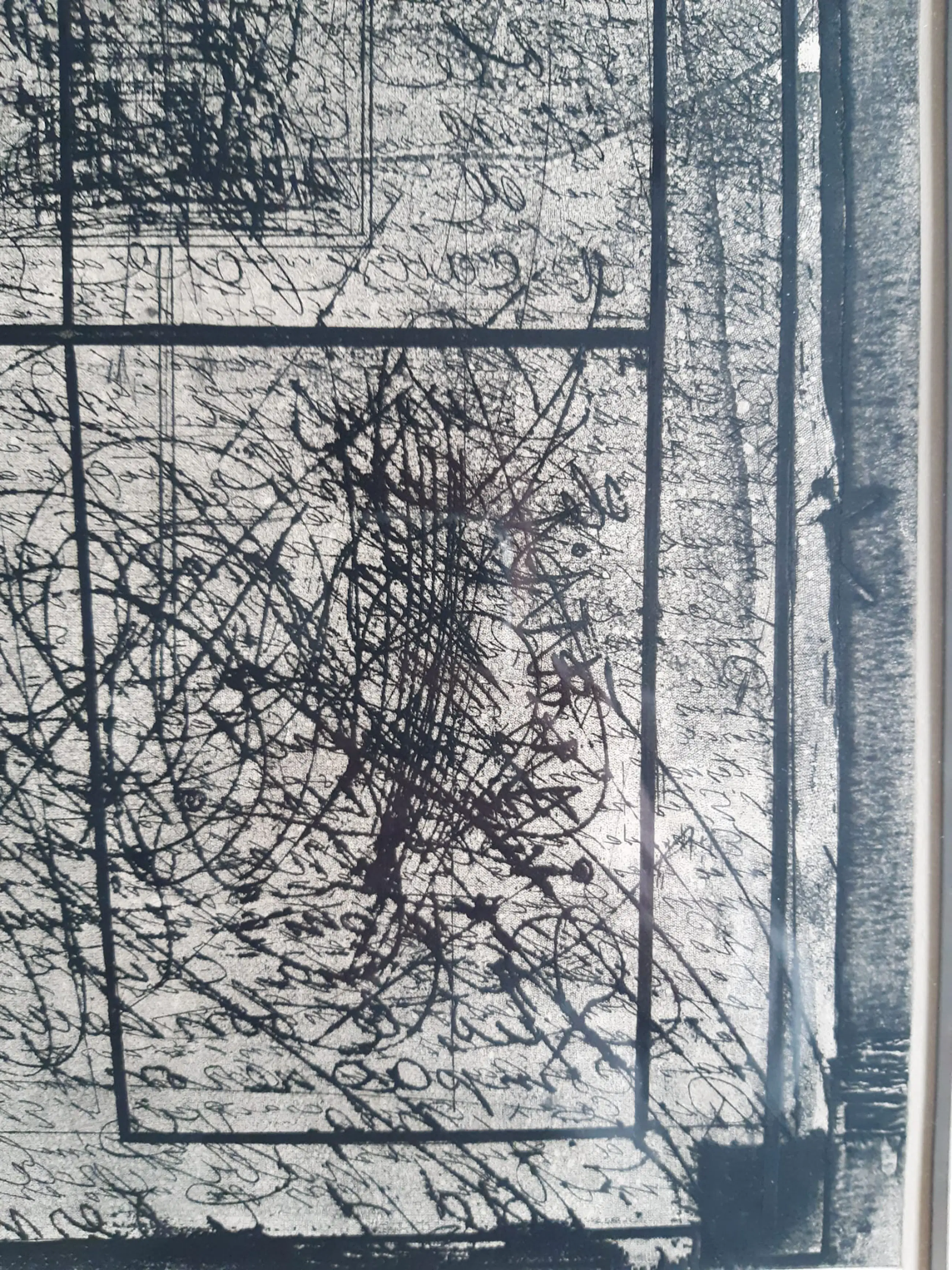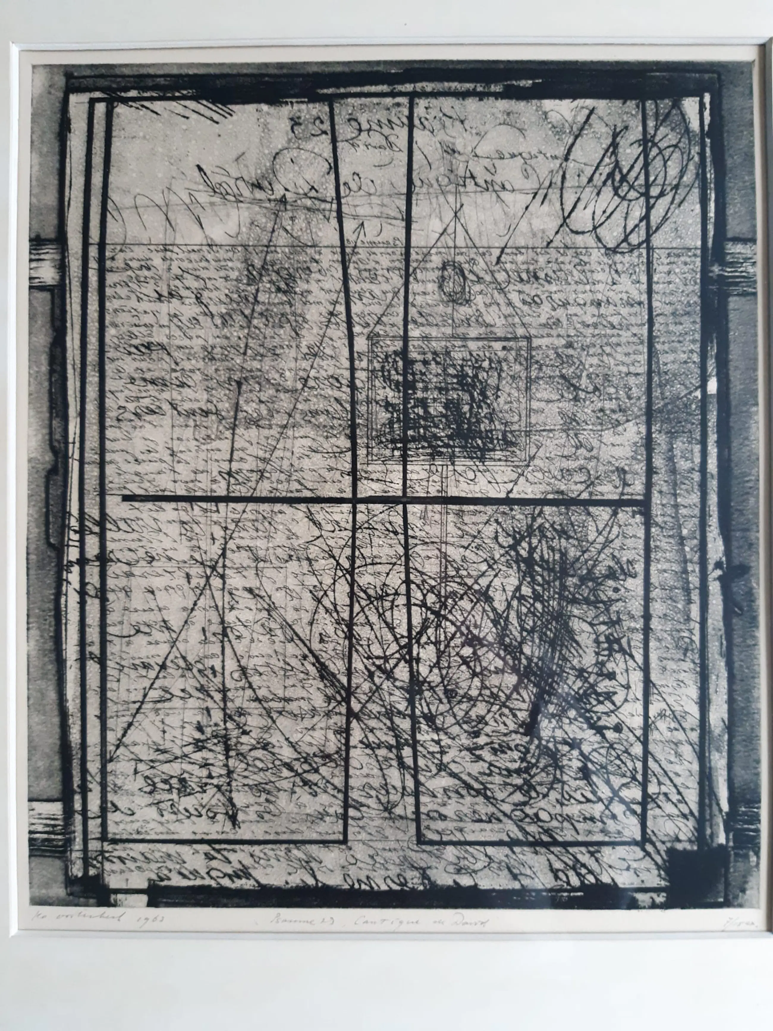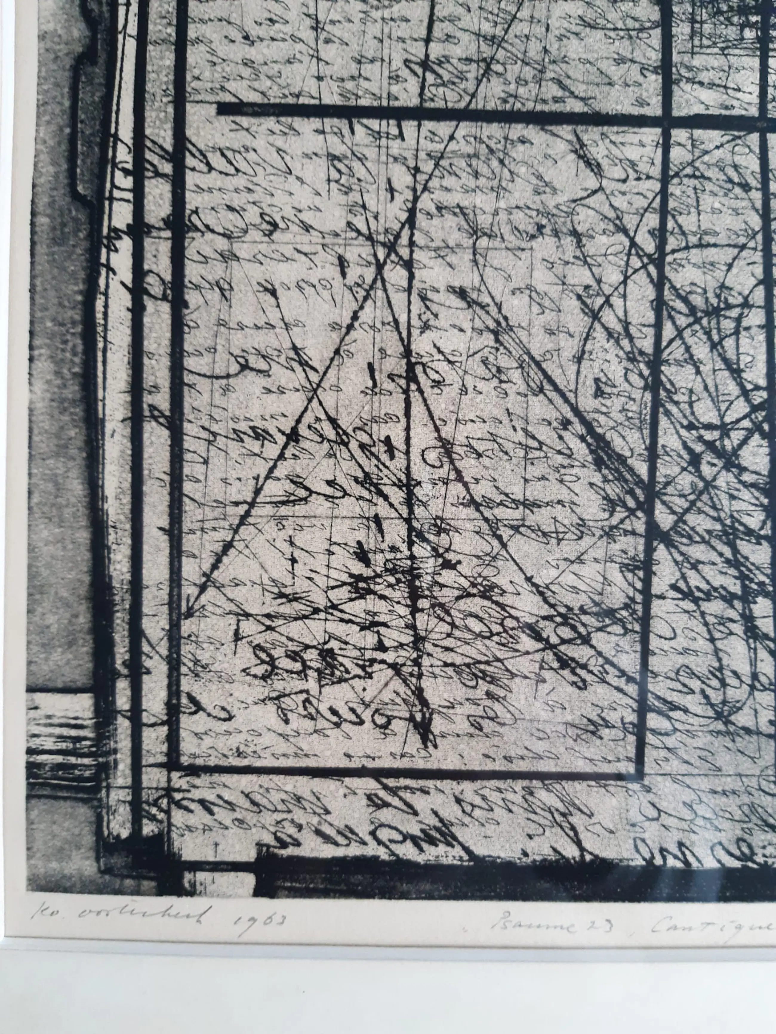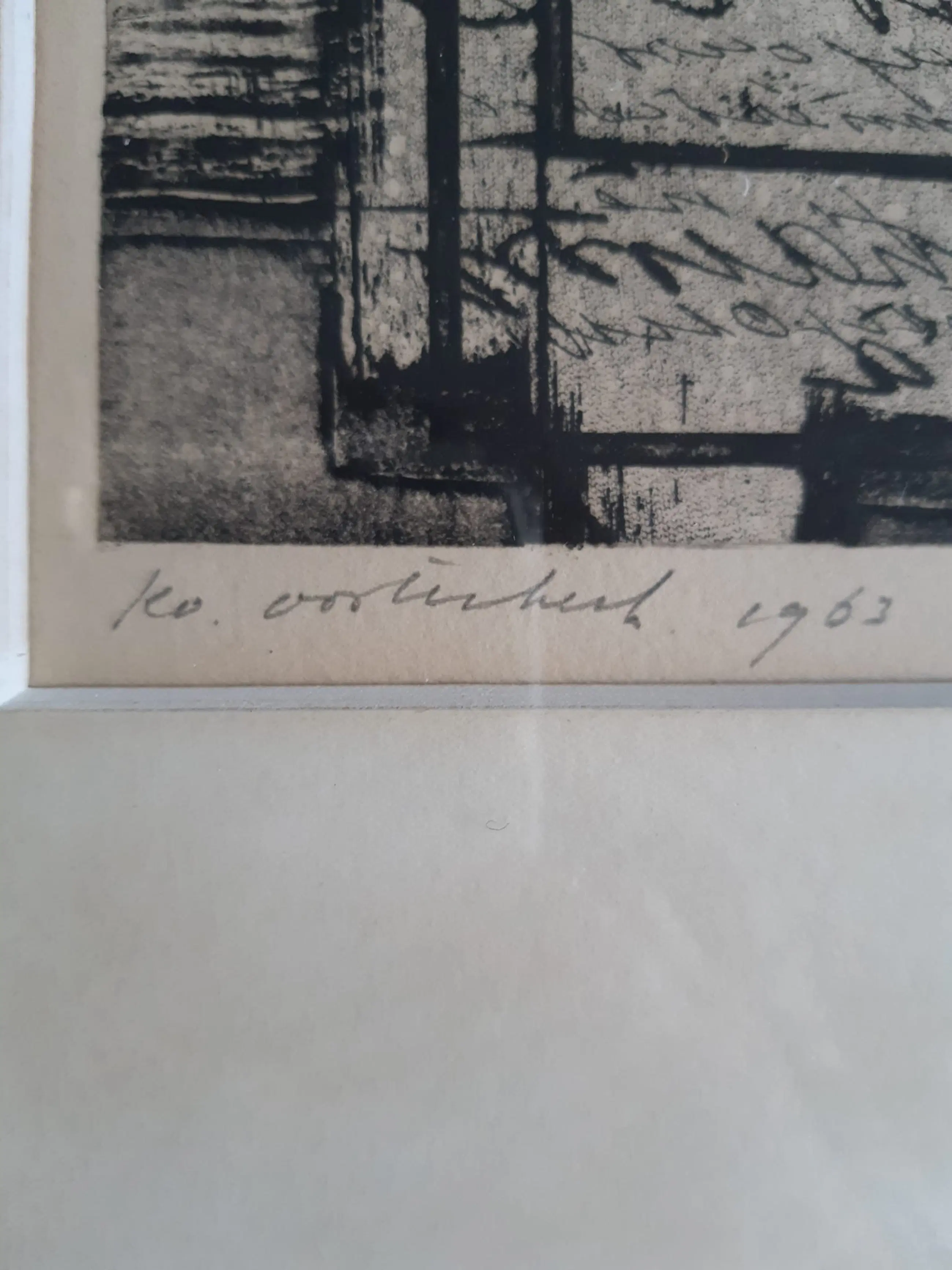 Zwart/wit ets Ko Oosterkerk (1928-2012) uit 1963. Eigen druk 7/15. Ets gewijd aan psalm. Cantique 23, cant. de David. Ko Oosterkerk was bij uitstek graficus. Exposeerde in het Van Abbe museum, Groninger museum en Stedelijk Museum. In de hoek rechtsonderin is er lichte verkleuring op het papier rond de ets. De ets zelf is nog in uitstekende staat.