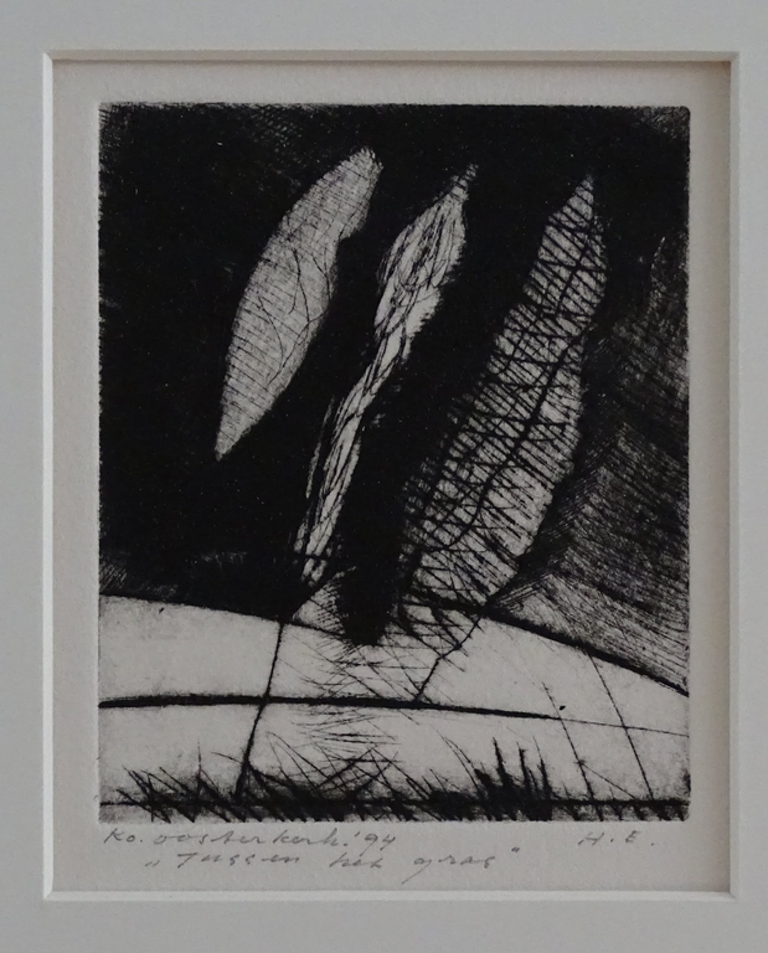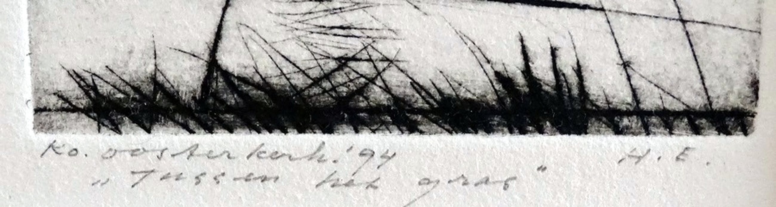 Begin negentiger jaren maakt Ko Oosterkerk een serie z/w-etsen (meestal droge naald) onder de naam "Tussen het gras".