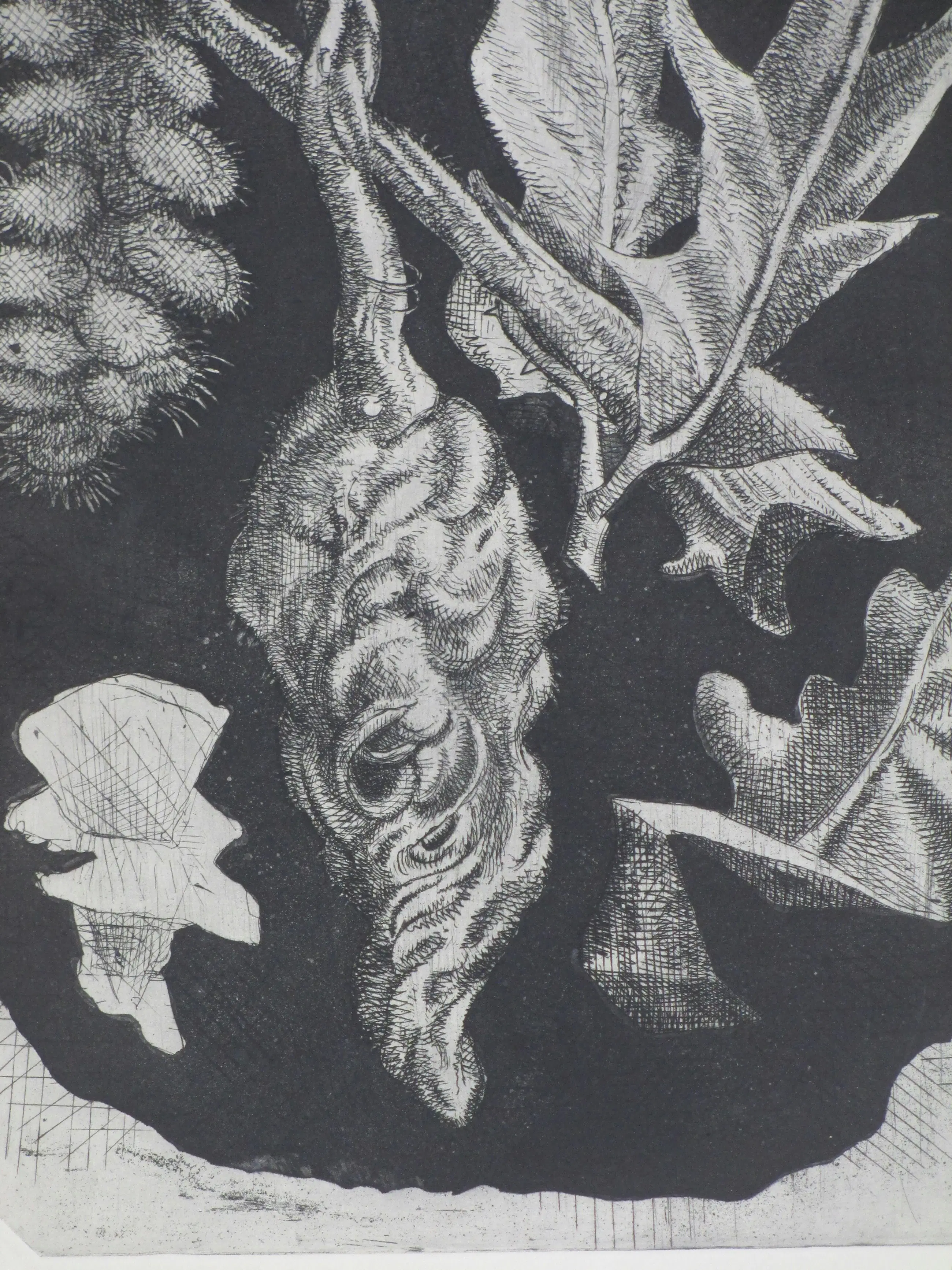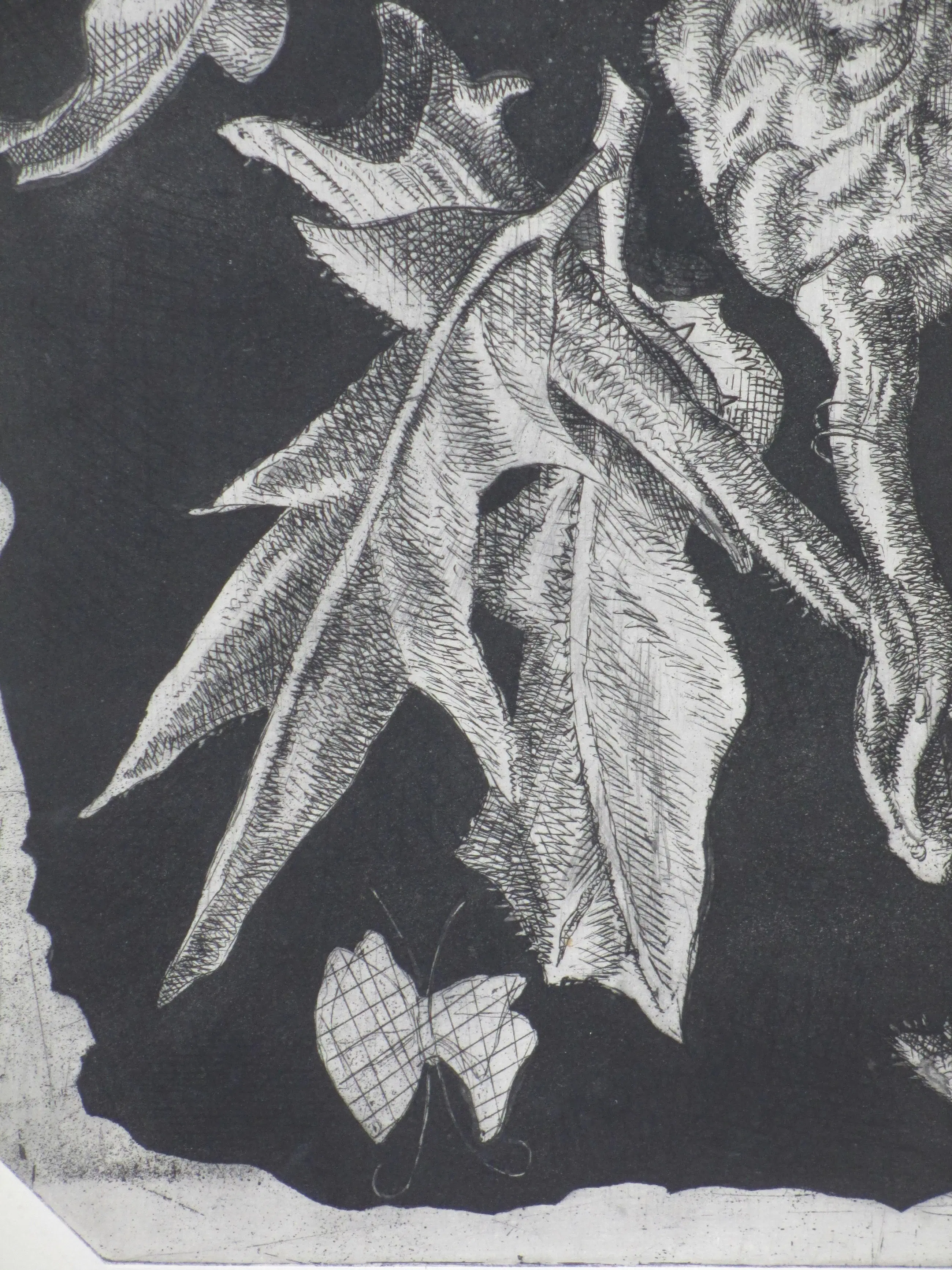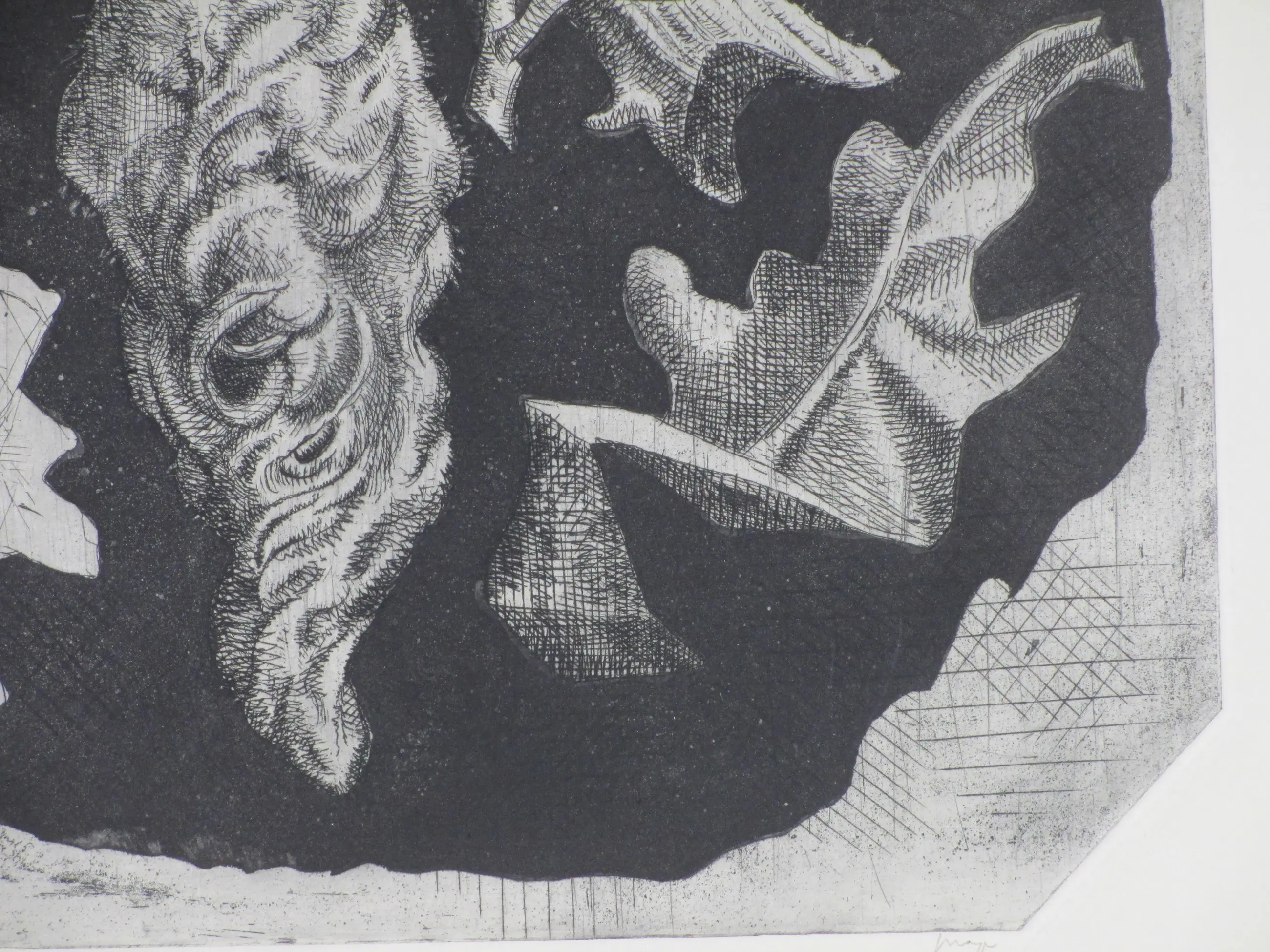 Karakteristieke ets door J.M.Prange Voorstelling van surrealistische vegetatie Losbladig, beeldmaat 49x39, bladmaat 65x48 Gesigneerd in potlood r.o.: 'Prange' Authenticiteit volledig gegarandeerd