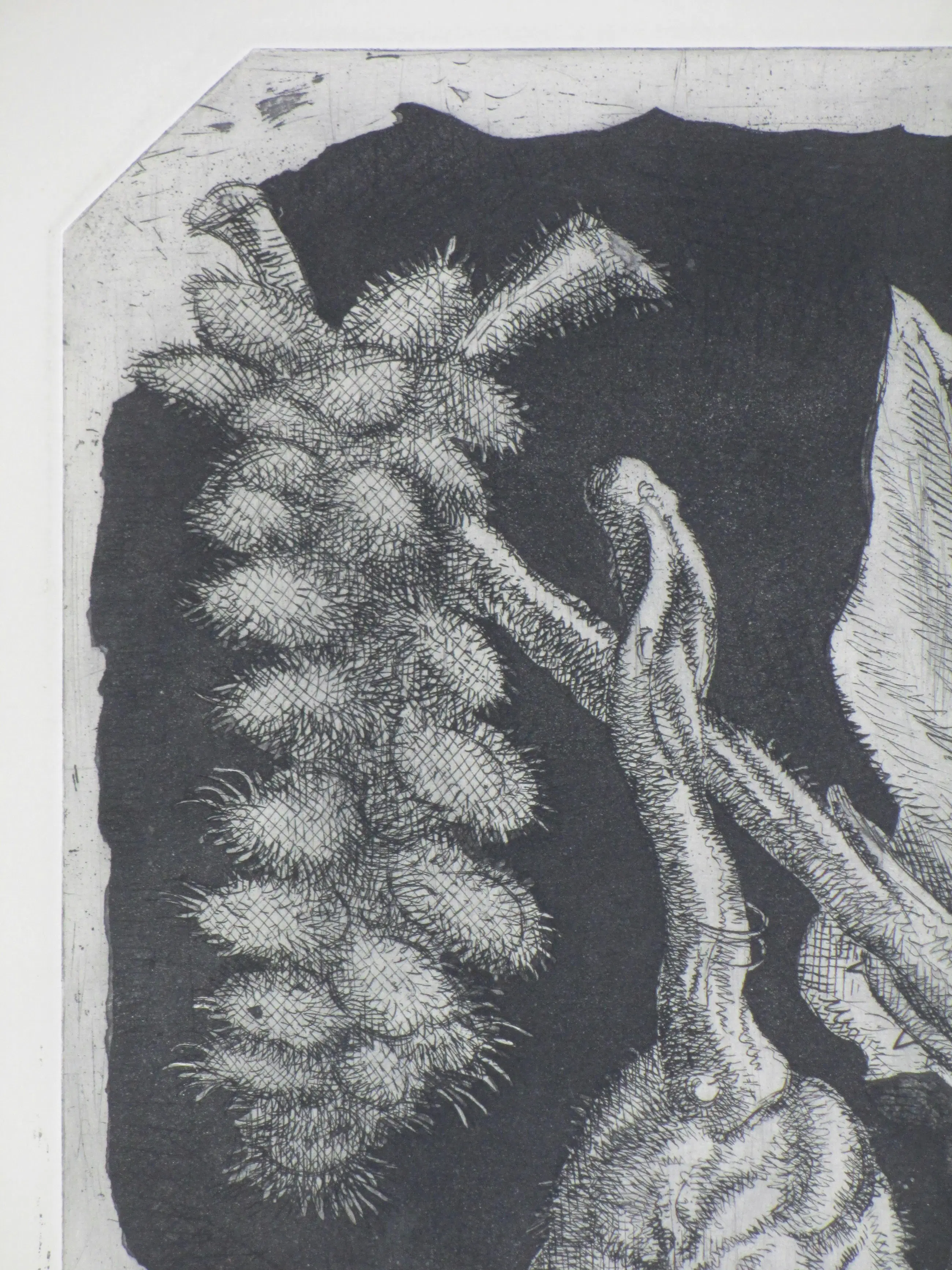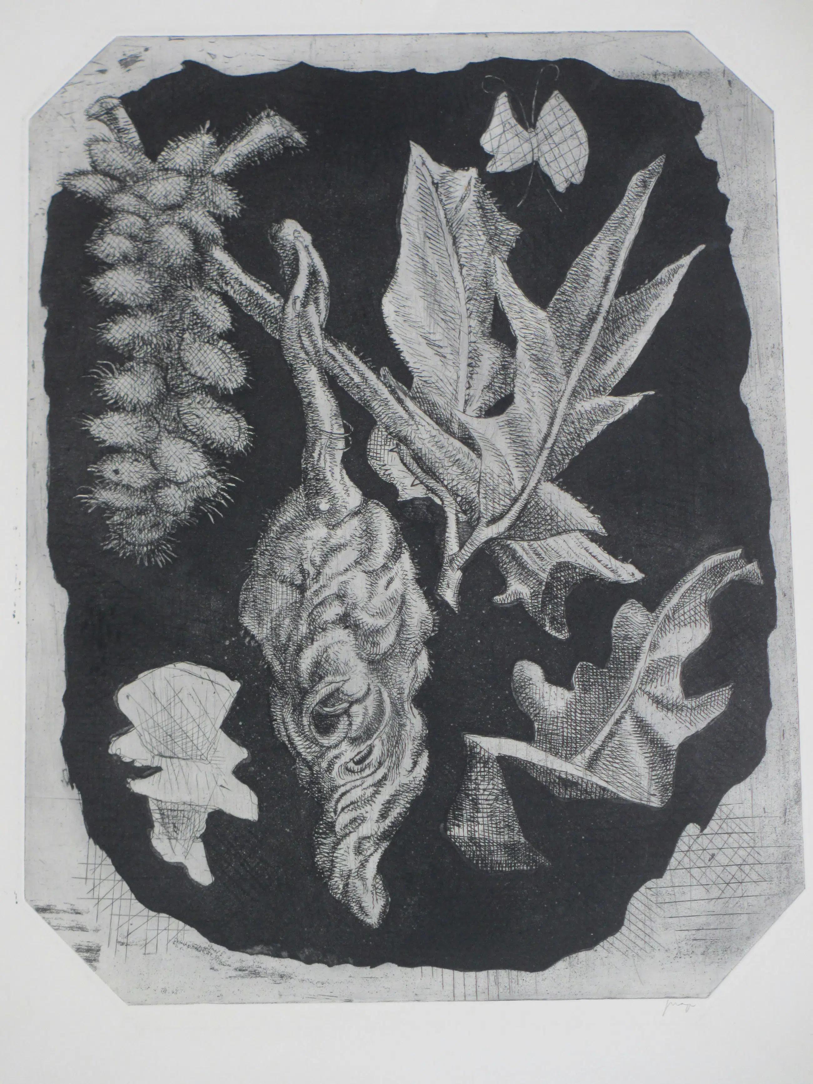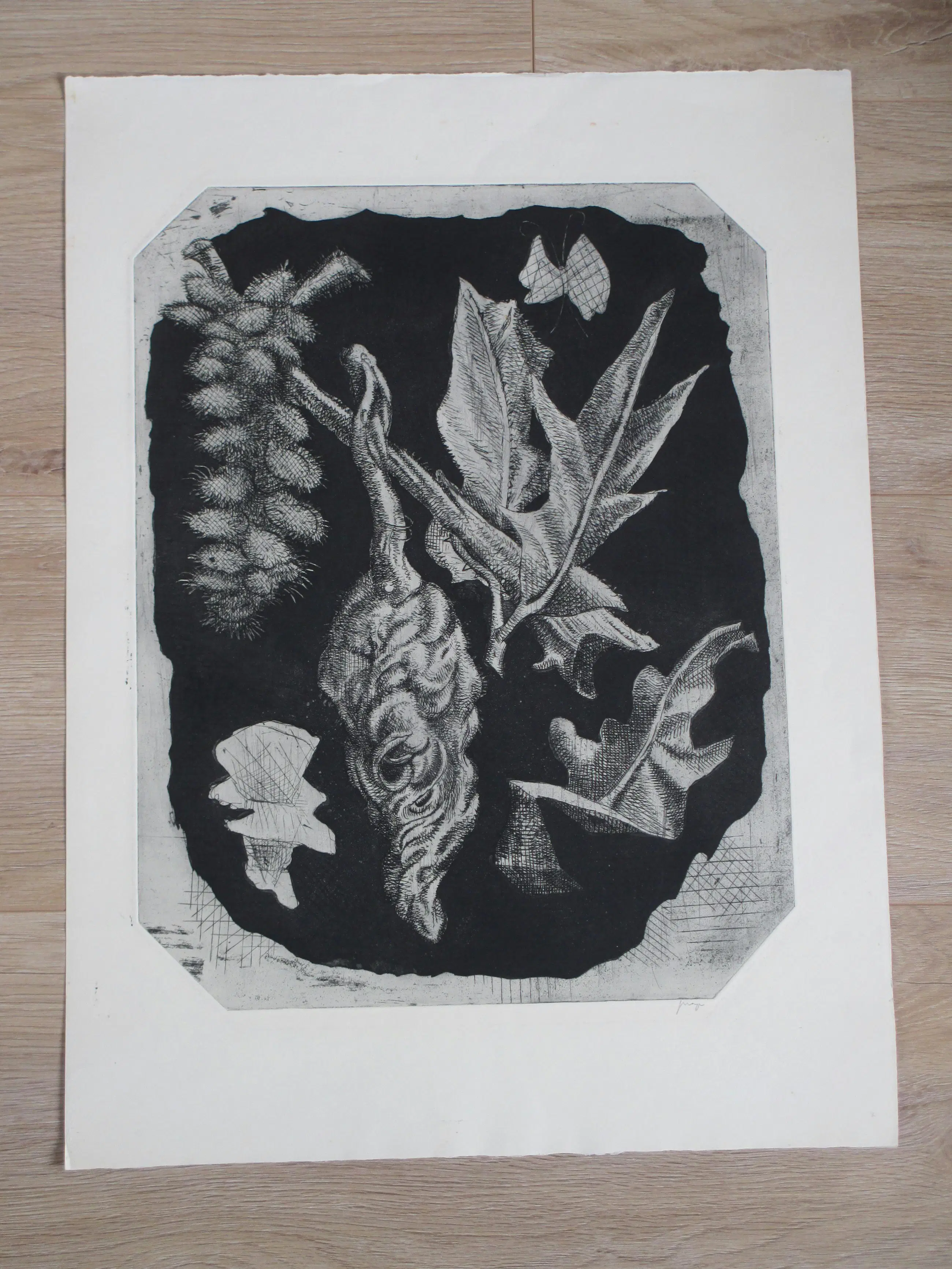 Karakteristieke ets door J.M.Prange Voorstelling van surrealistische vegetatie Losbladig, beeldmaat 49x39, bladmaat 65x48 Gesigneerd in potlood r.o.: 'Prange' Authenticiteit volledig gegarandeerd