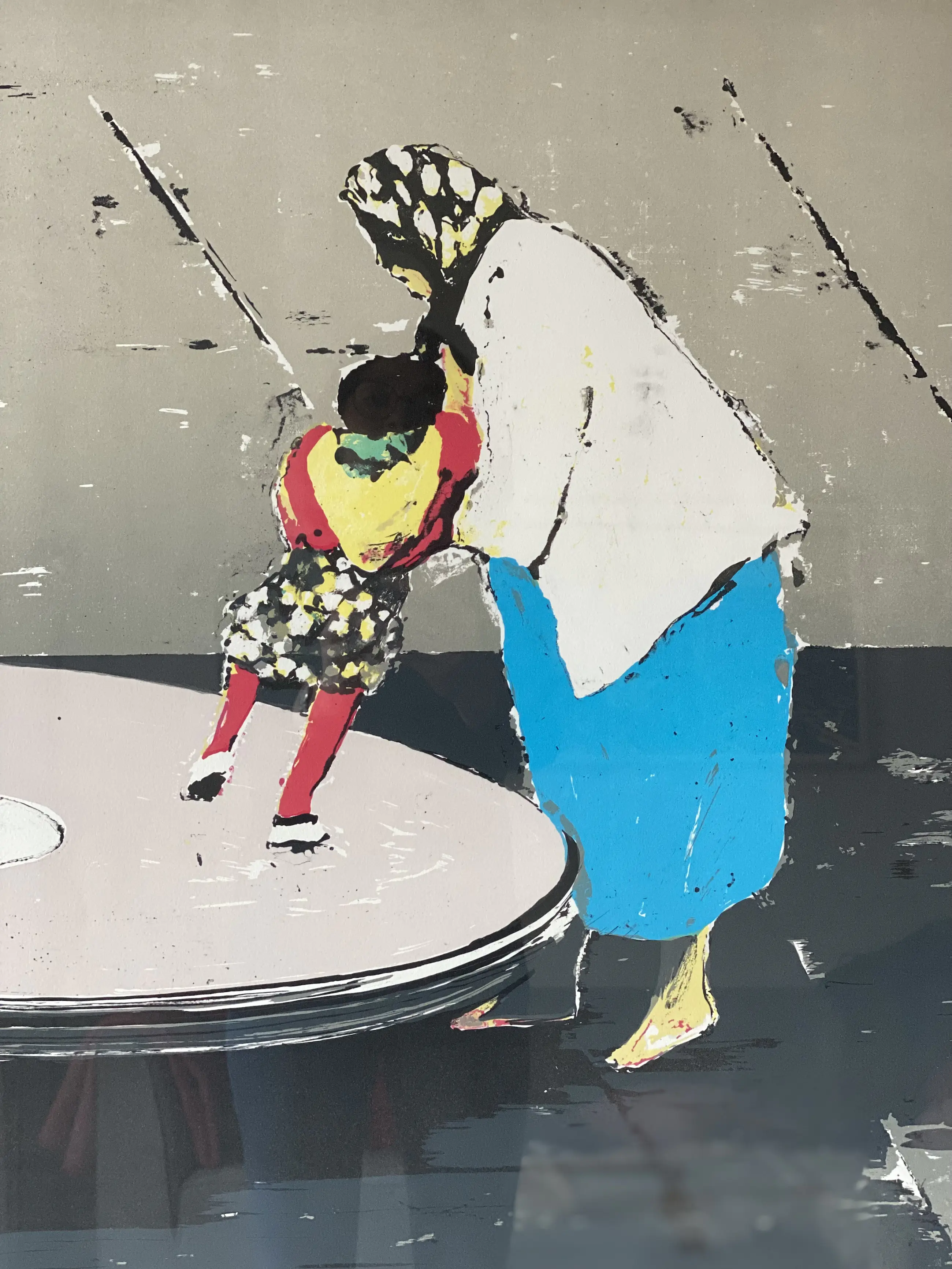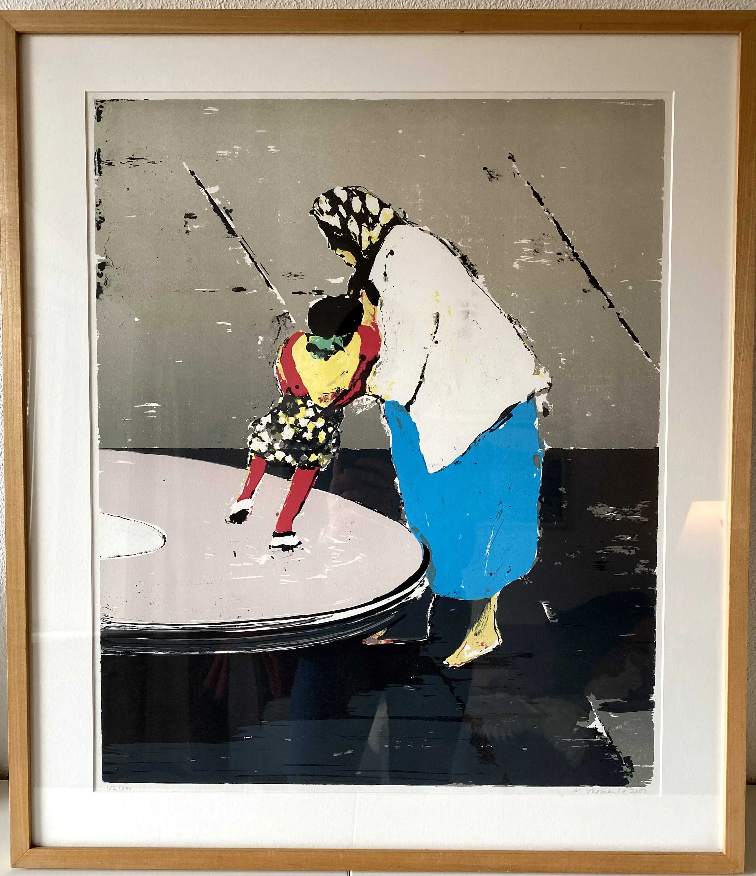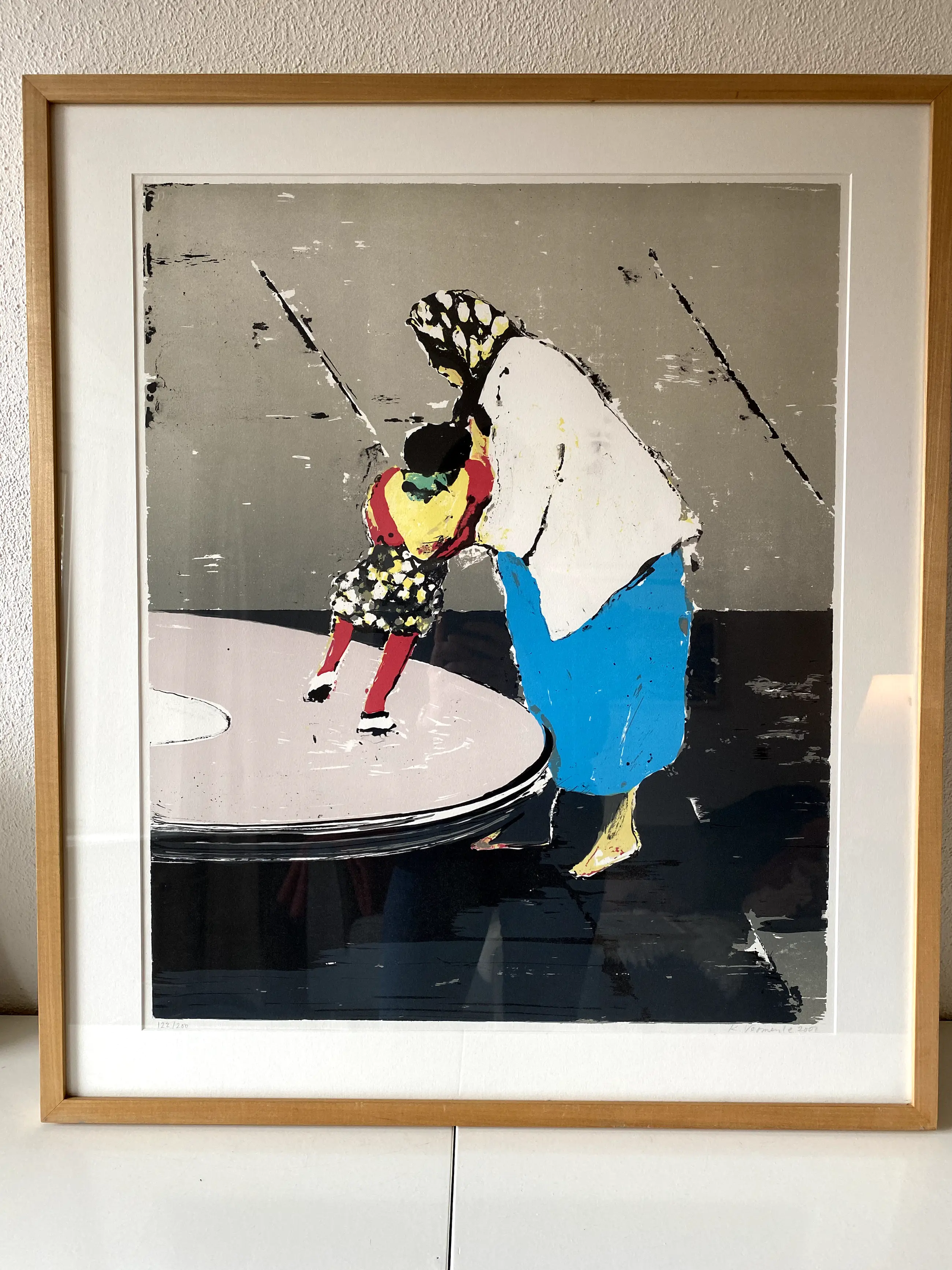 Mooi werk van Koen Vermeule. Vrouw en kind in speeltuin. Ingelijst in houten Barth lijst.