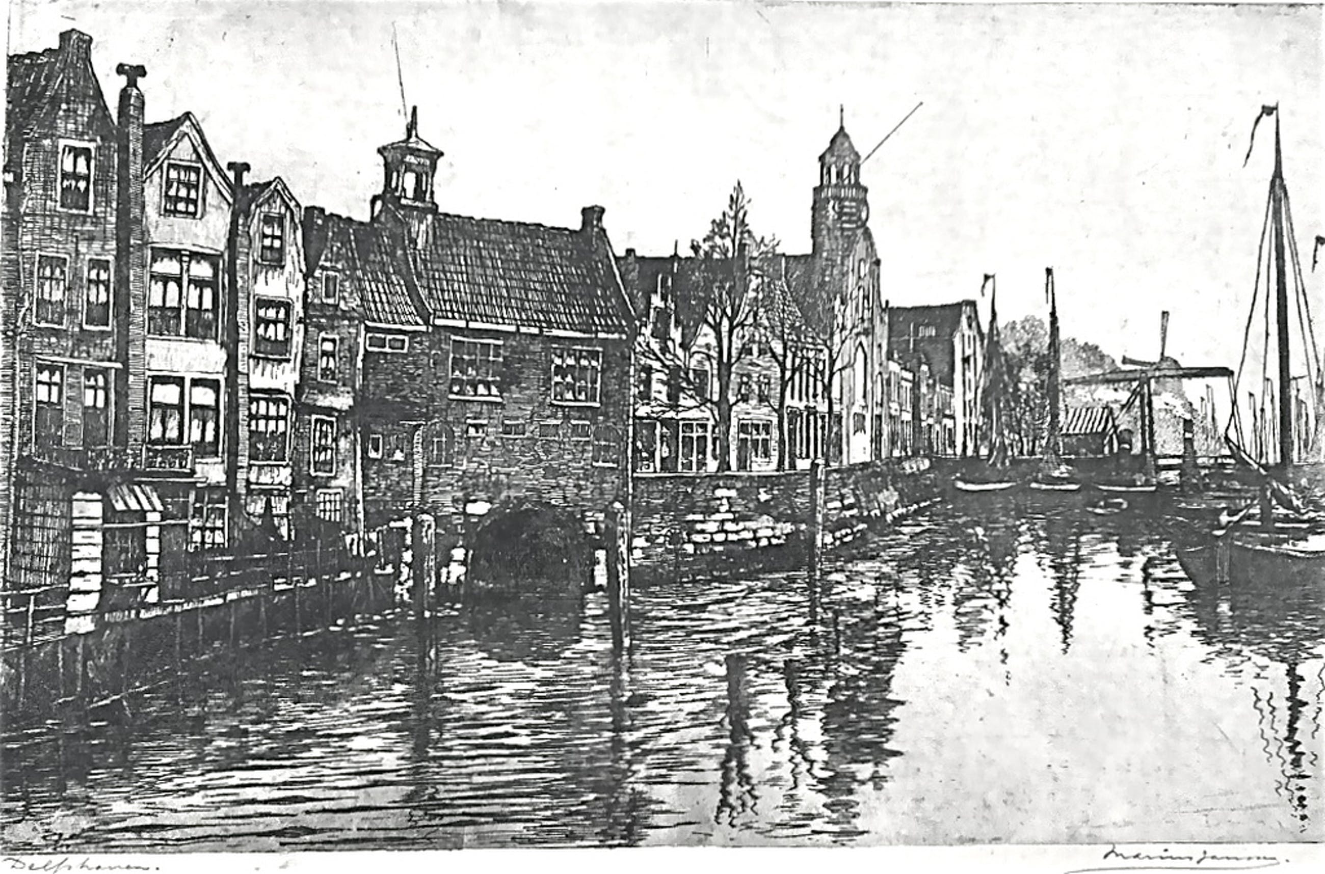 Prachtige ets - gesigneerd in 1924 en handsmatig (potlood) gesigneerd - van Delfshaven = Rotterdam. Formaat ets 28x40 cm. Fraai passepartout 35x 60 cm