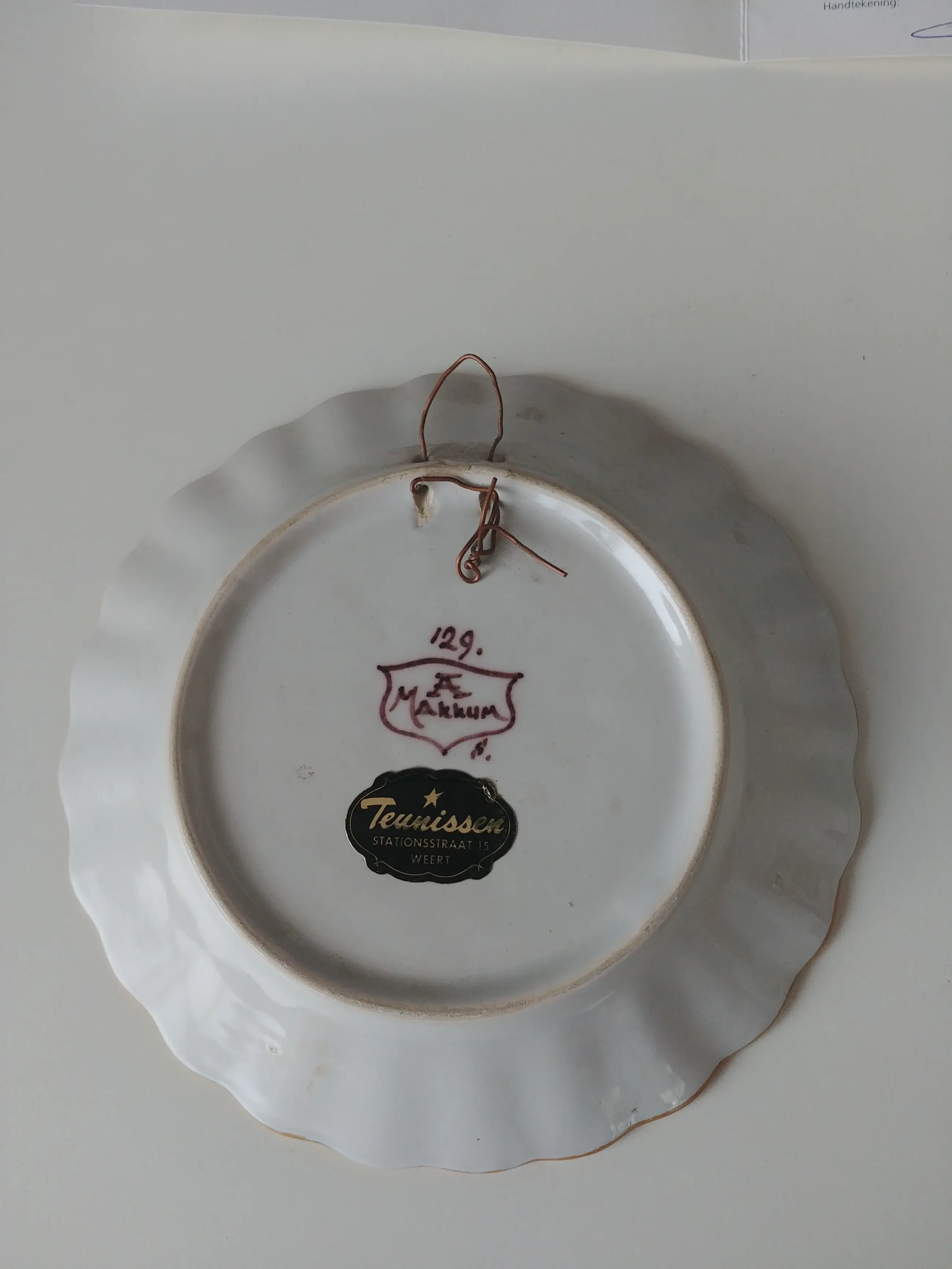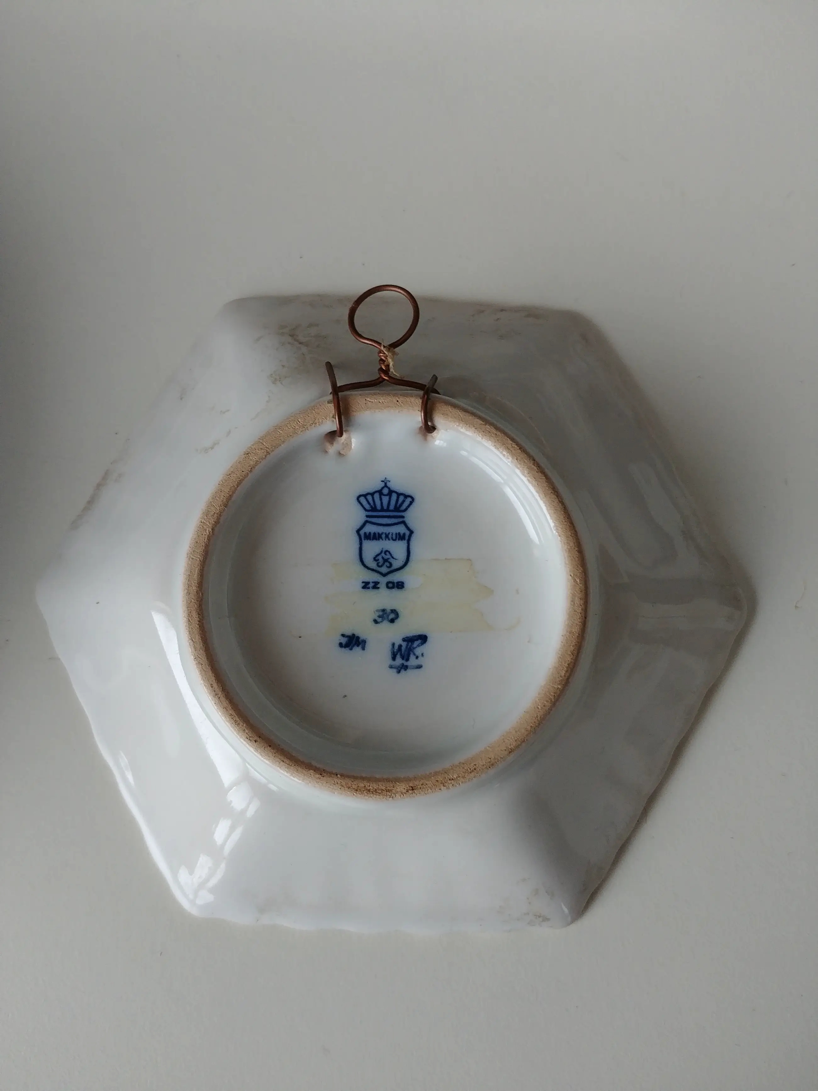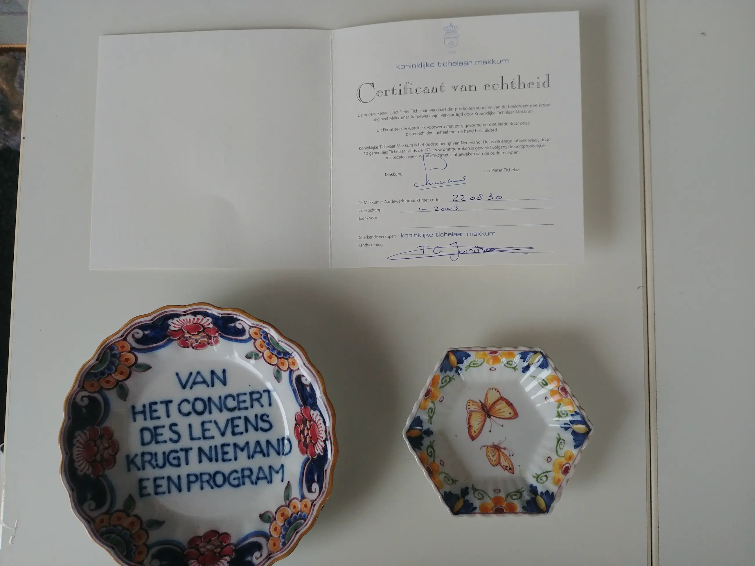 Het zijn 2 wandborden van Makkum. De kleine is 11x10 cm, De grote is 16 cm doorsnee en 3m hoog. Bij de kleine zit een certificaat.