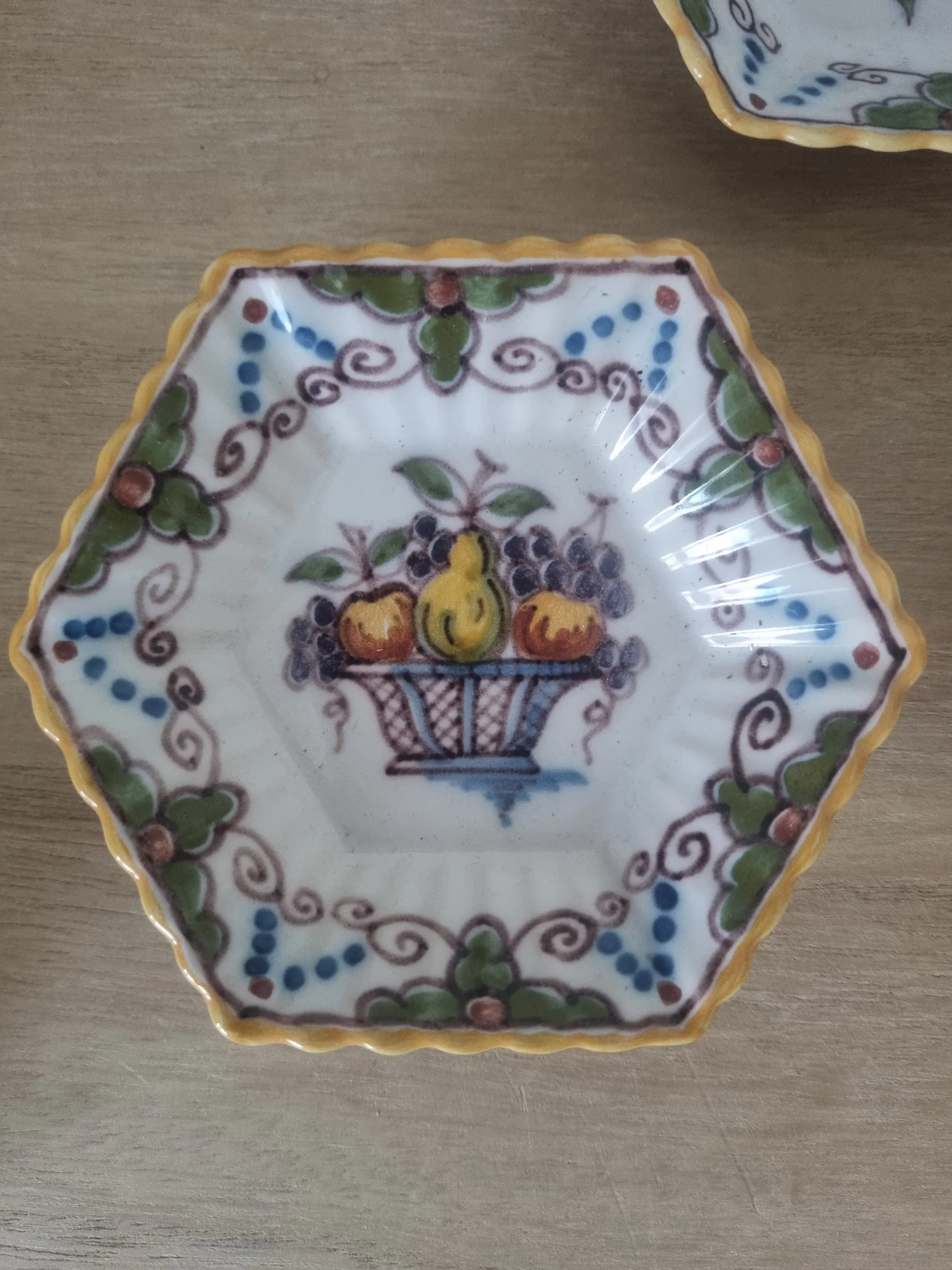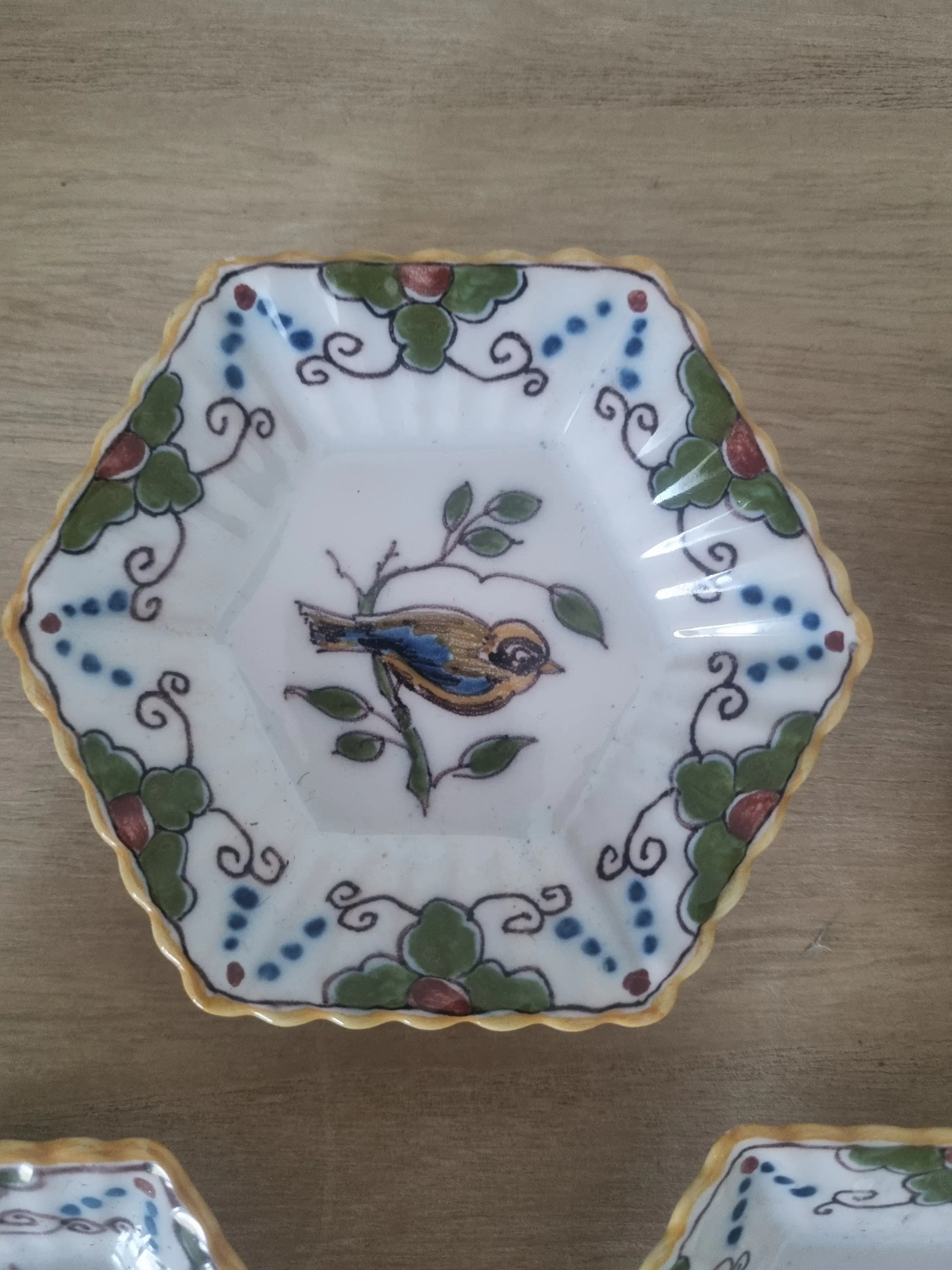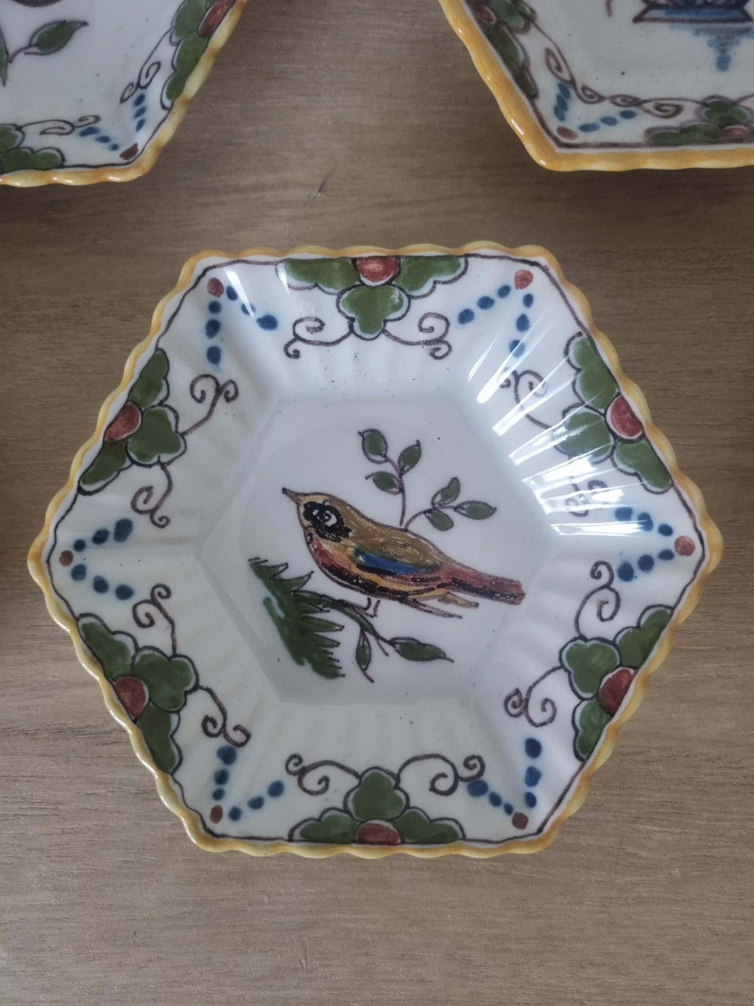 Dit zijn zeshoekige schaaltjes van Koninklijke Tichelaar Makkum, handgeschilderd met een polychroom fruit- en vogelmotief