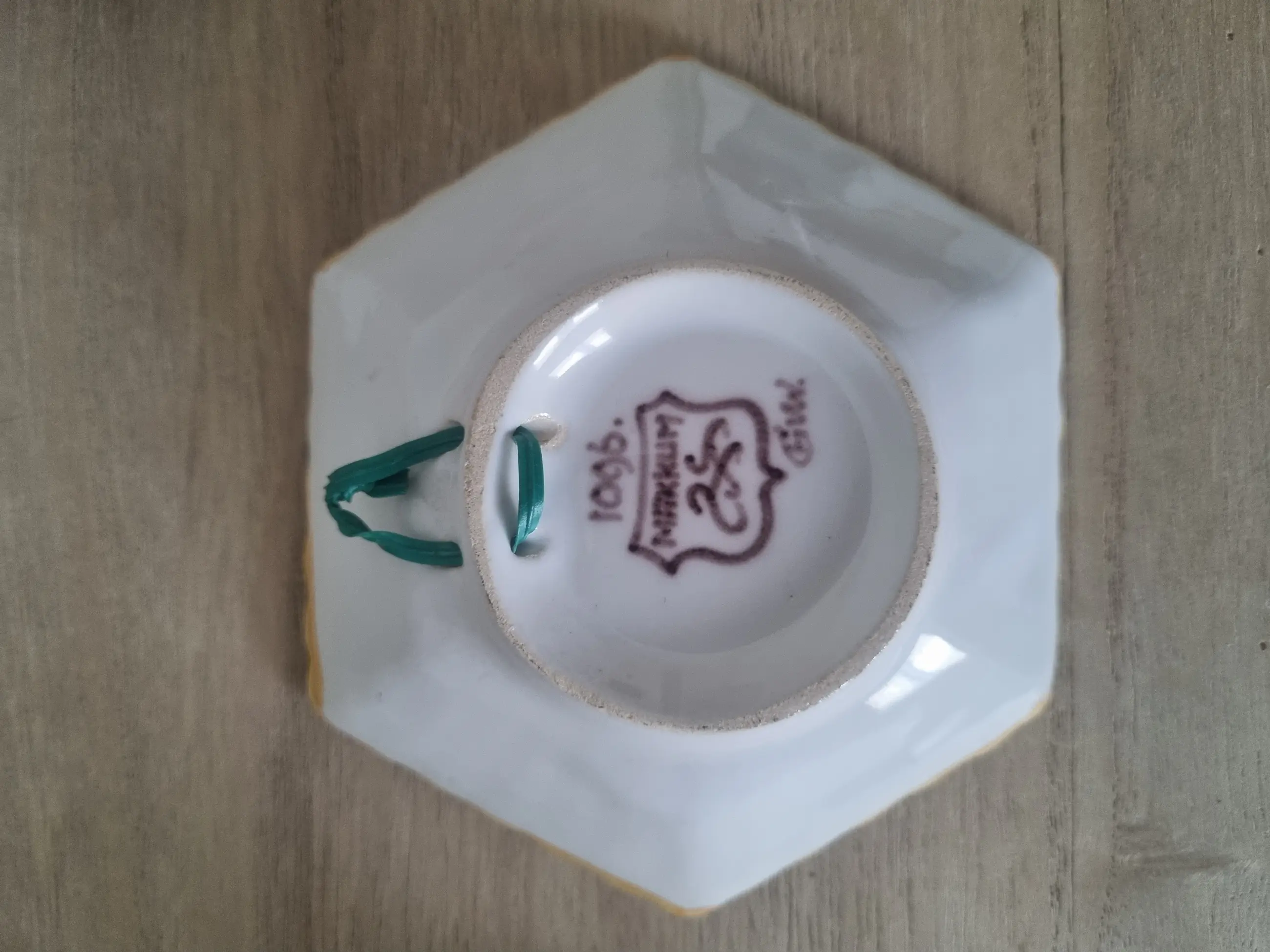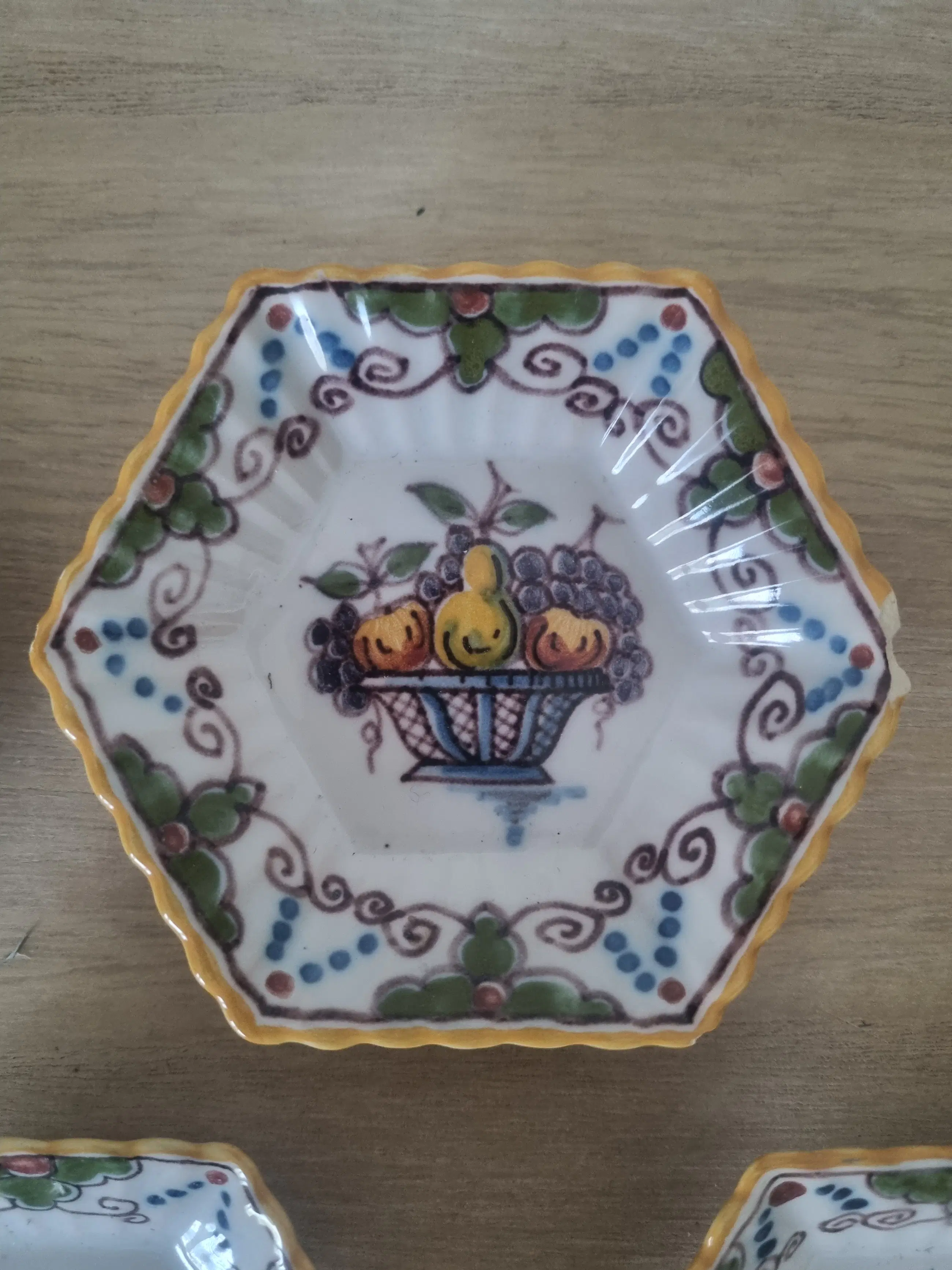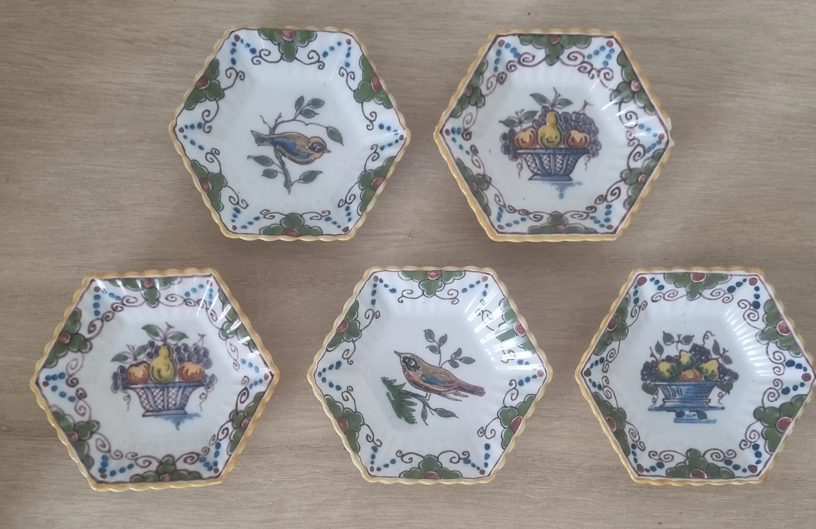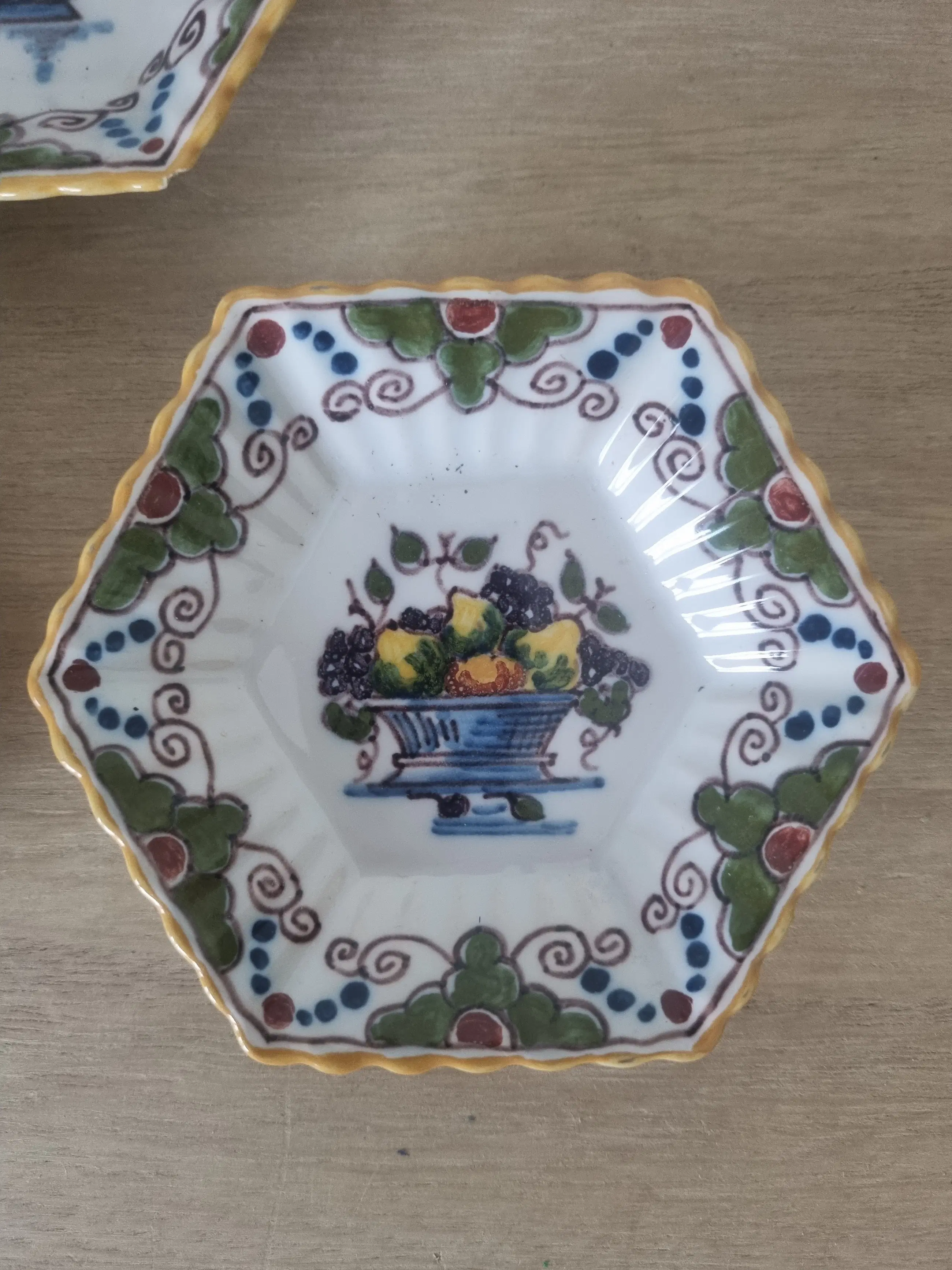 Dit zijn zeshoekige schaaltjes van Koninklijke Tichelaar Makkum, handgeschilderd met een polychroom fruit- en vogelmotief