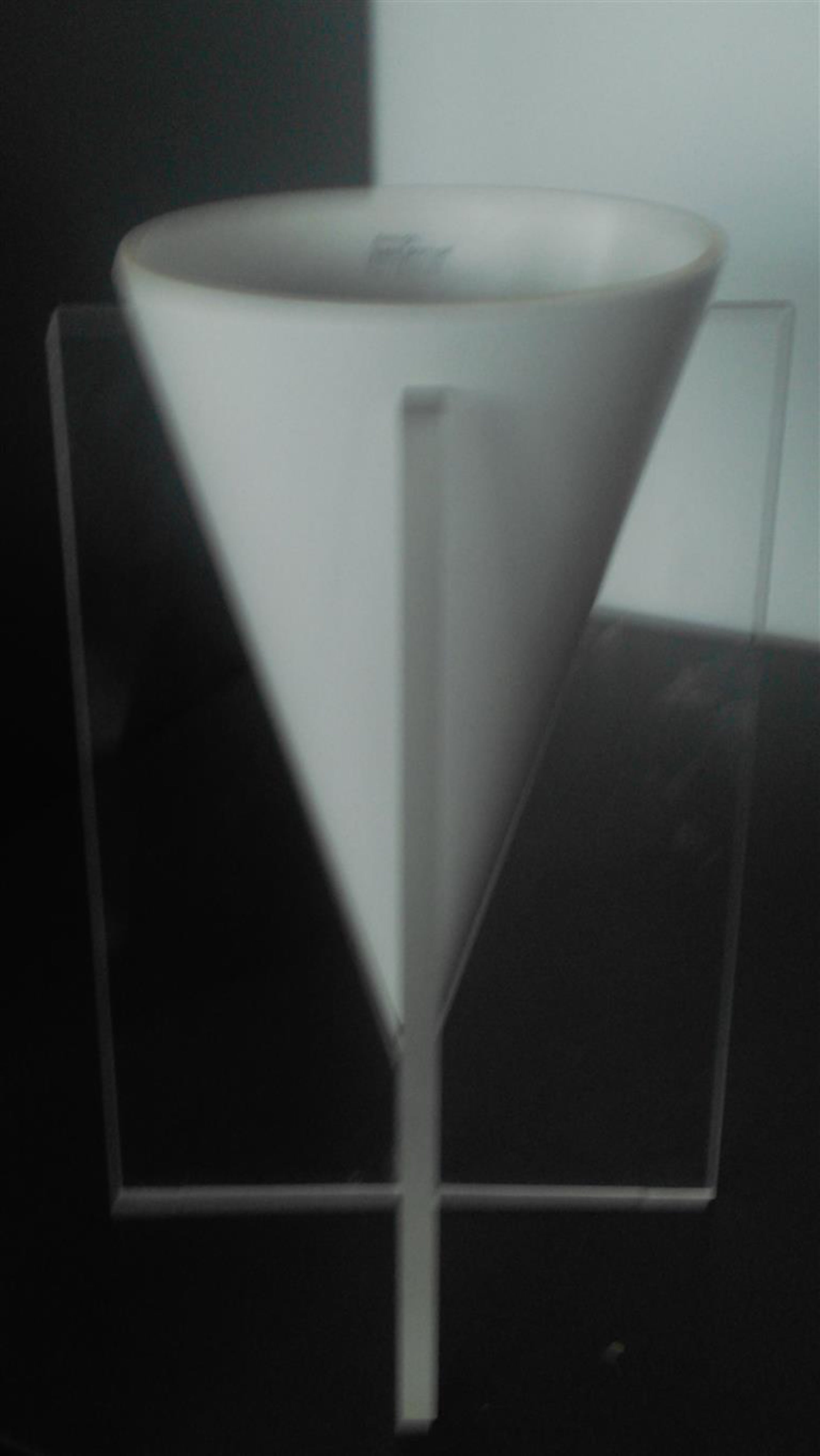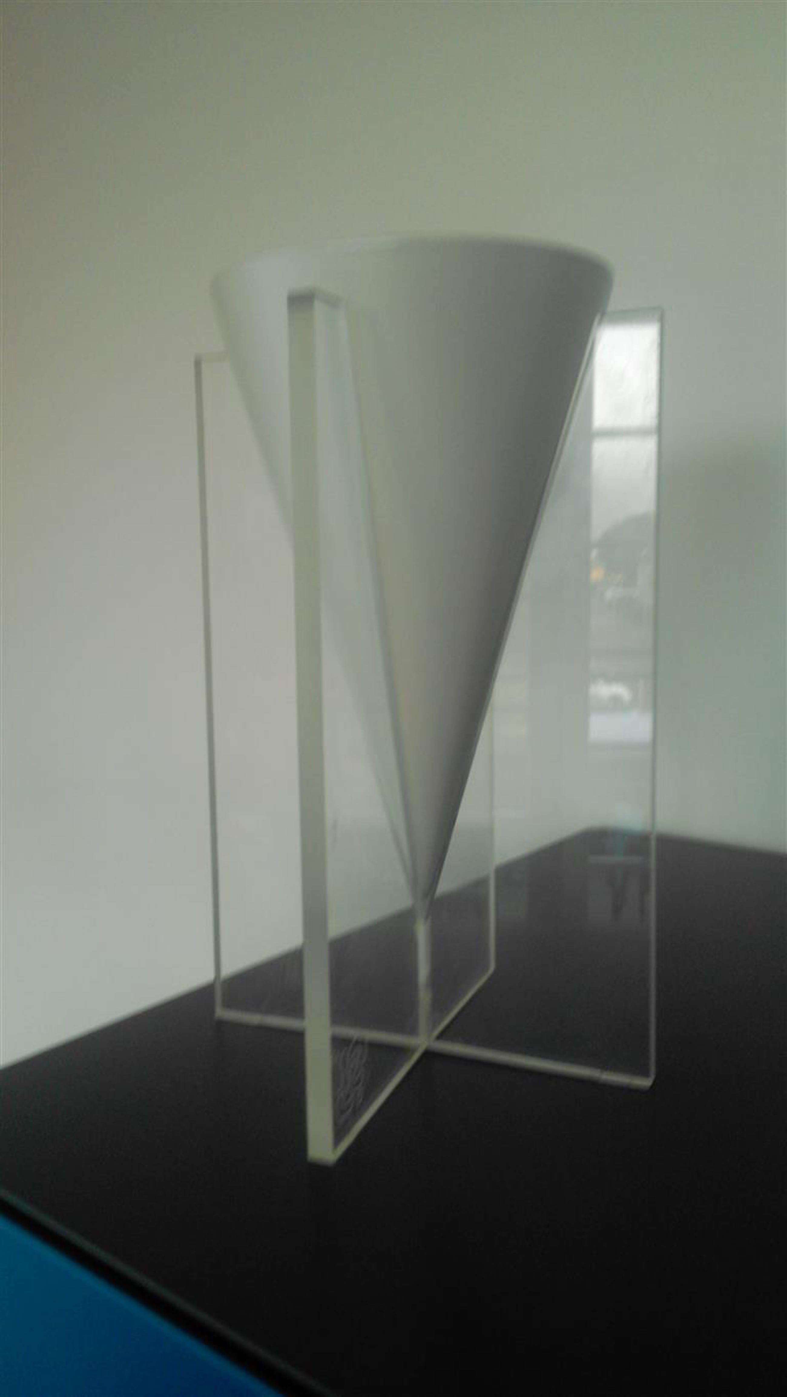 De vaas heeft een plexiglas standaard en een aardewerk kegel als vaas