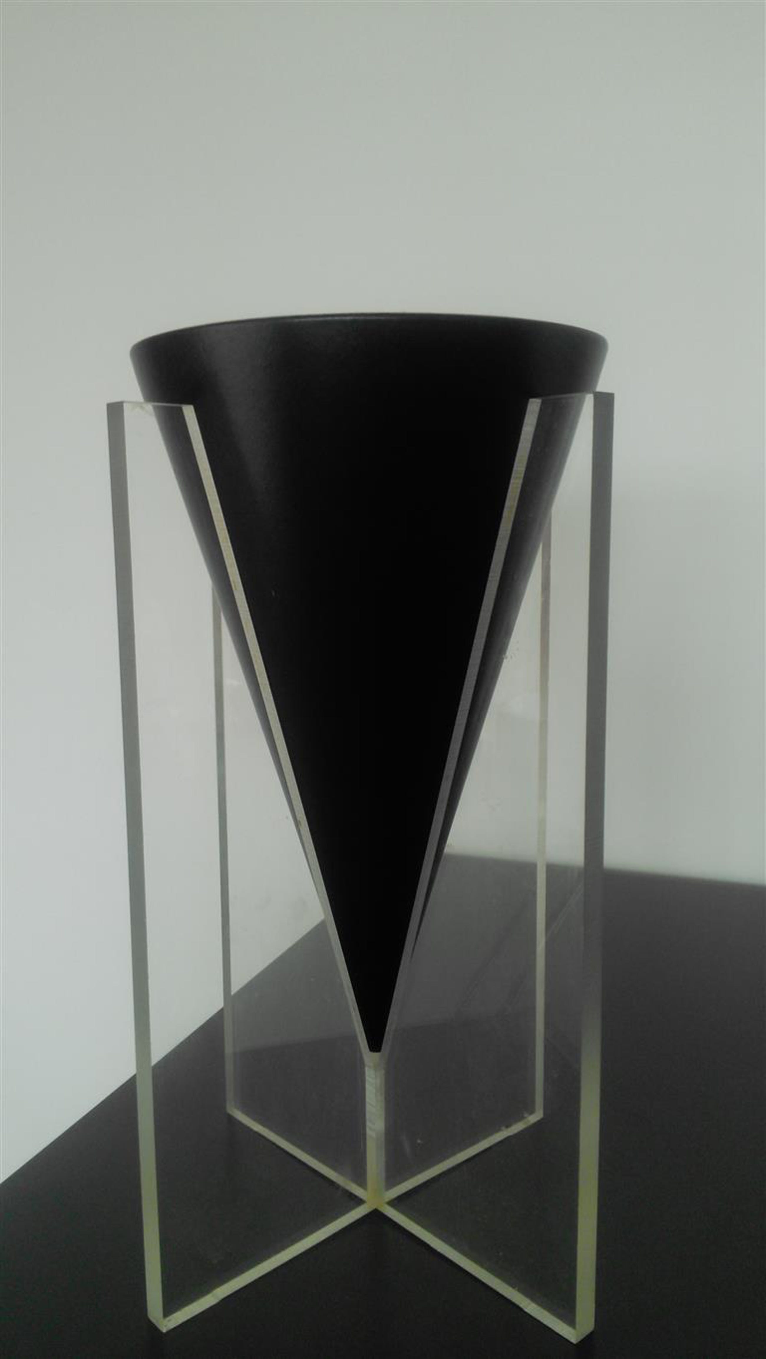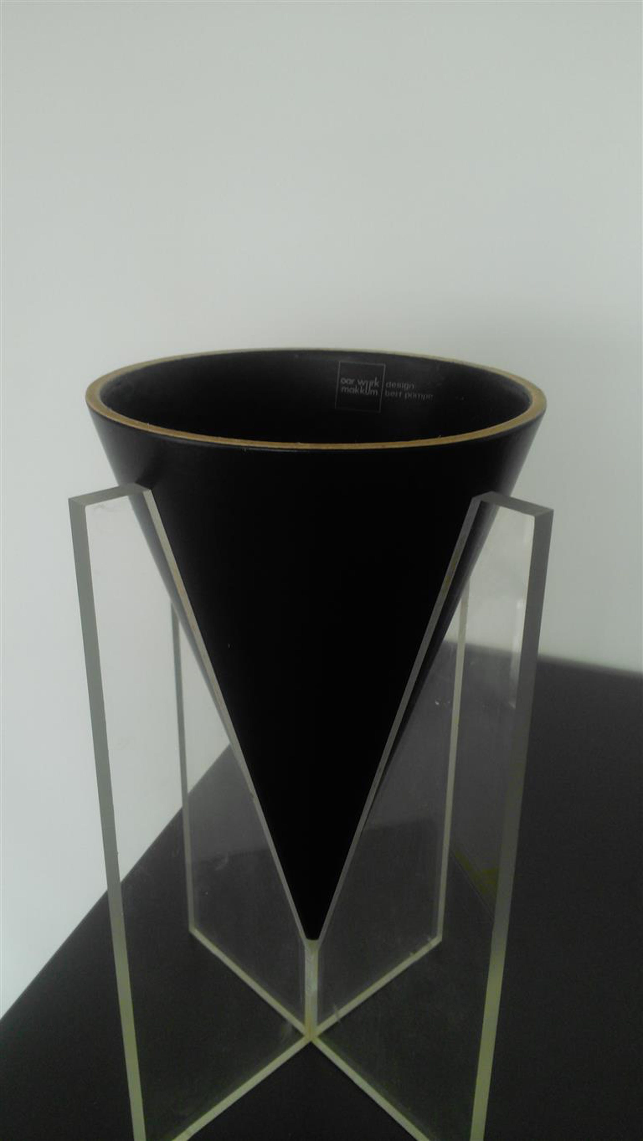 Zwart geglazuurde aardewerk omgekeerde kegel als vaas "Fara" in helder perspex houder.