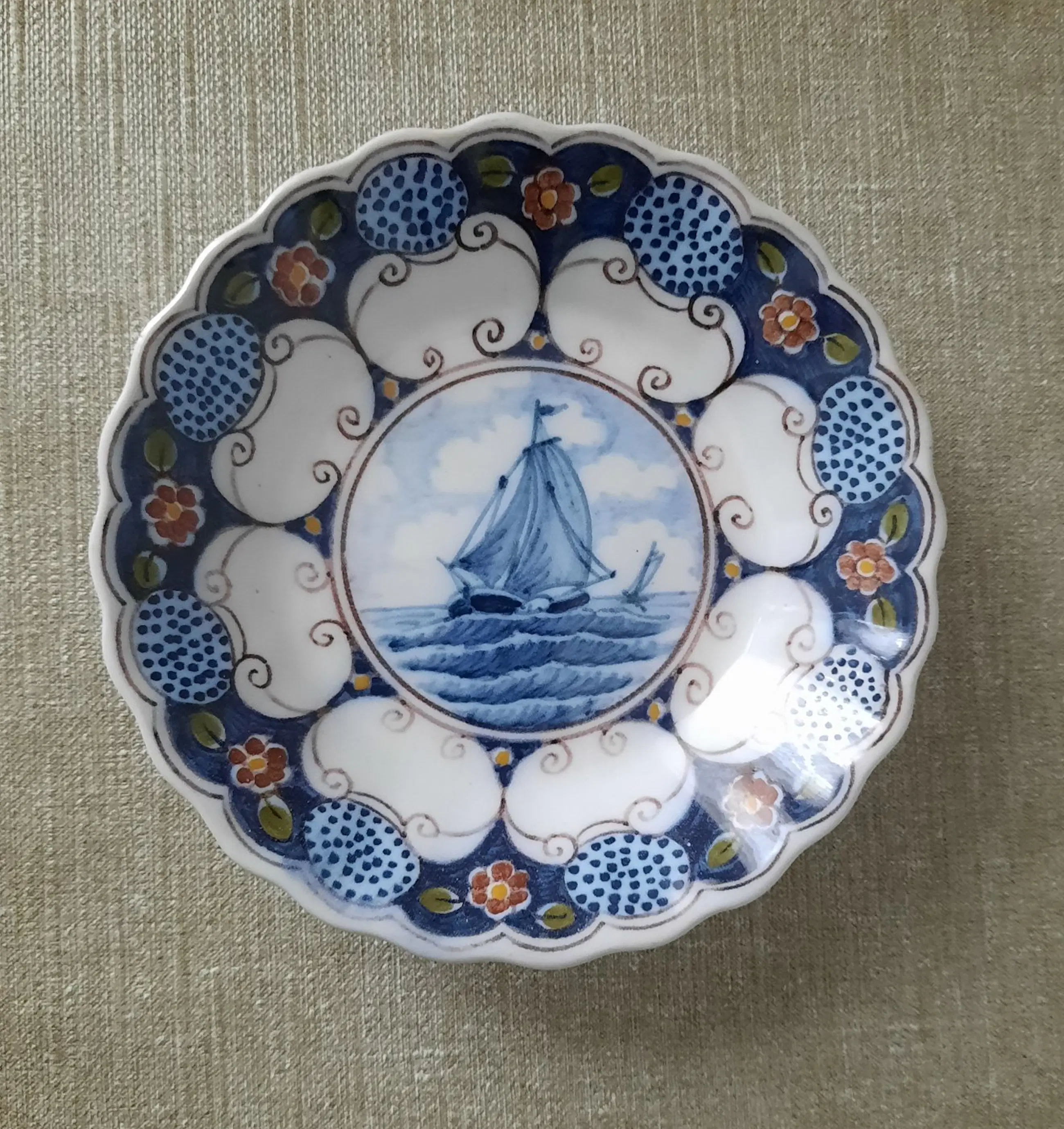 Tichelaar, Makkum - handbeschilderd en gelobd maritiem wandbord, schaaltje; zeer lichte sleetsheid omlijningen, maar beslist nog gaaf - diameter 13 cm