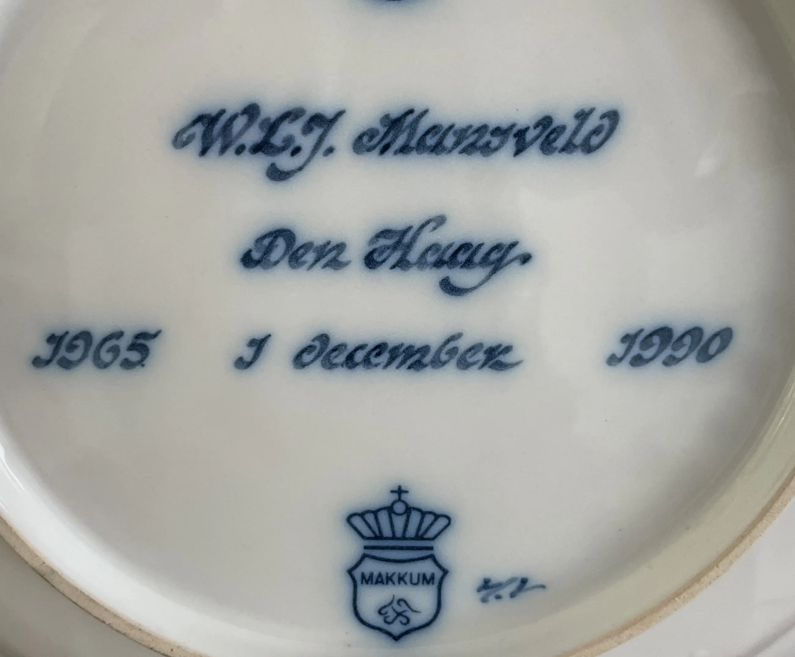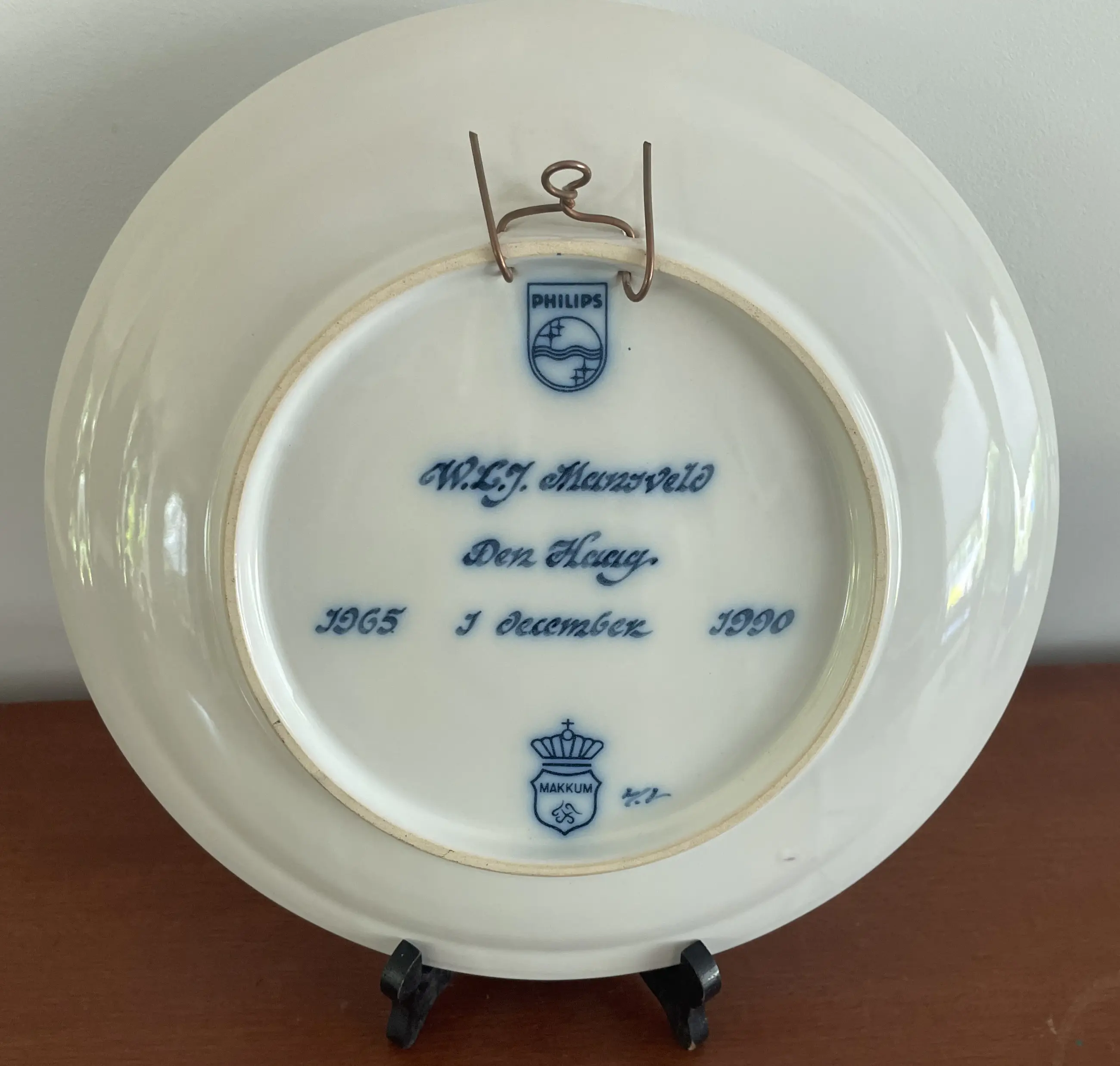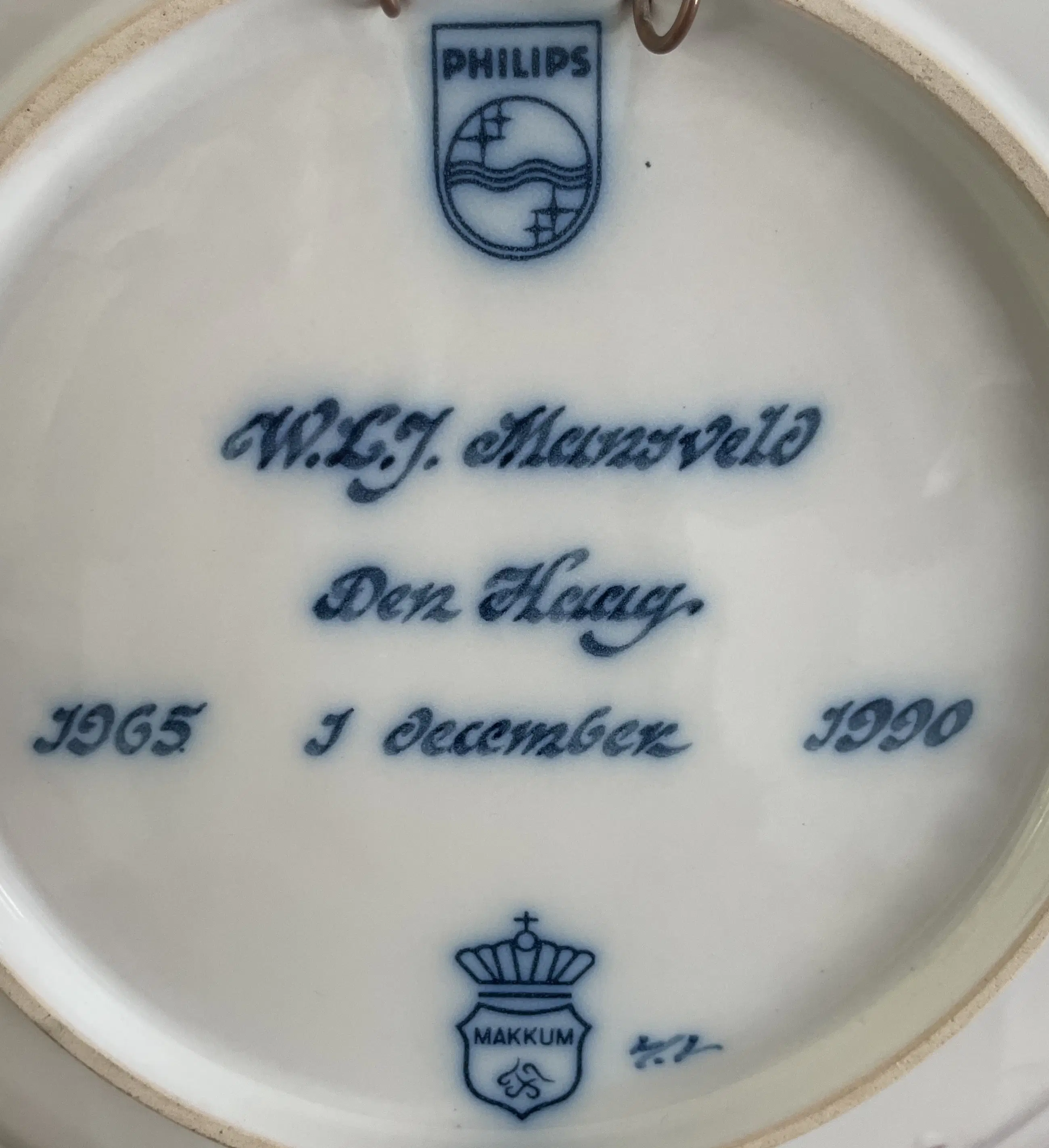 Polychroom handbeschilderd aardewerken wandbord uitgevoerd bij de Koninklijke Tichelaar uit Makkum. In onbeschadigde conditie, gemerkt aan de achterkant en voorzien van schilders initialen. Het bord is in 1990 door Philips cadeau gedaan ater ere van 25 dienstjaren aan een medewerker uit Den Haag.