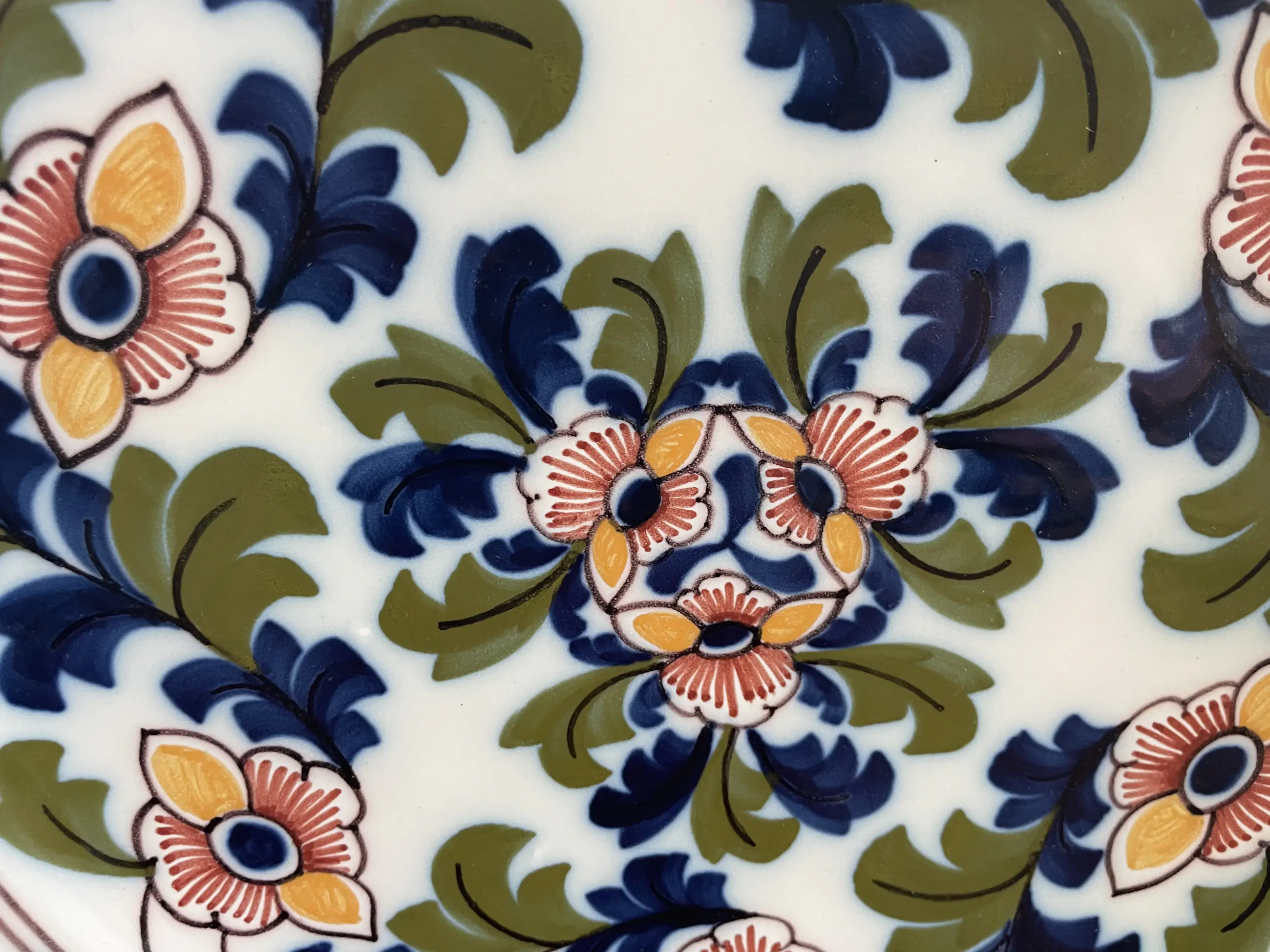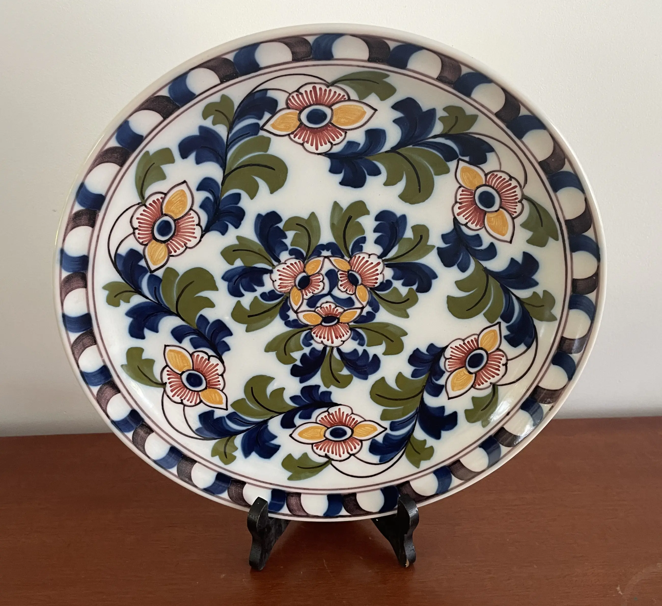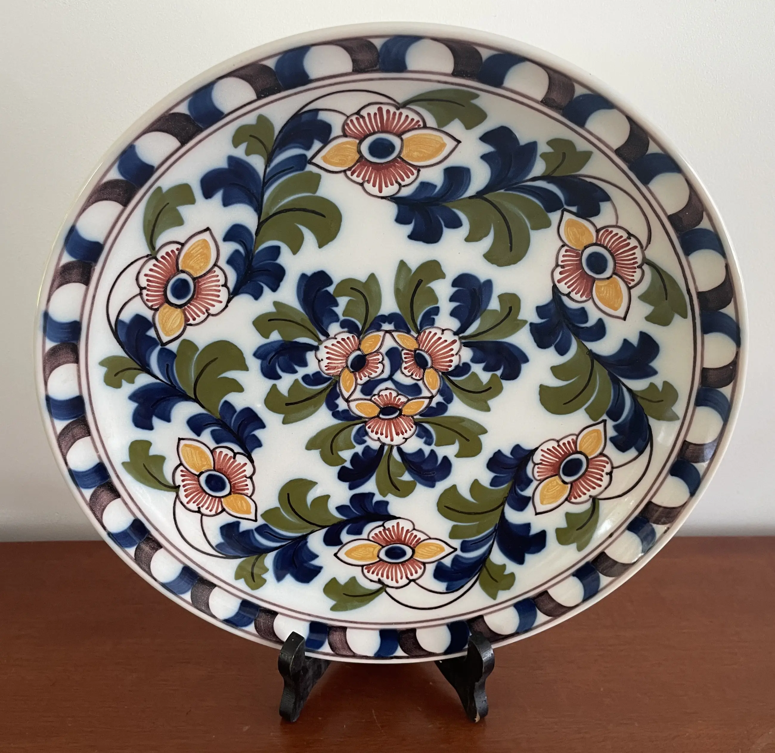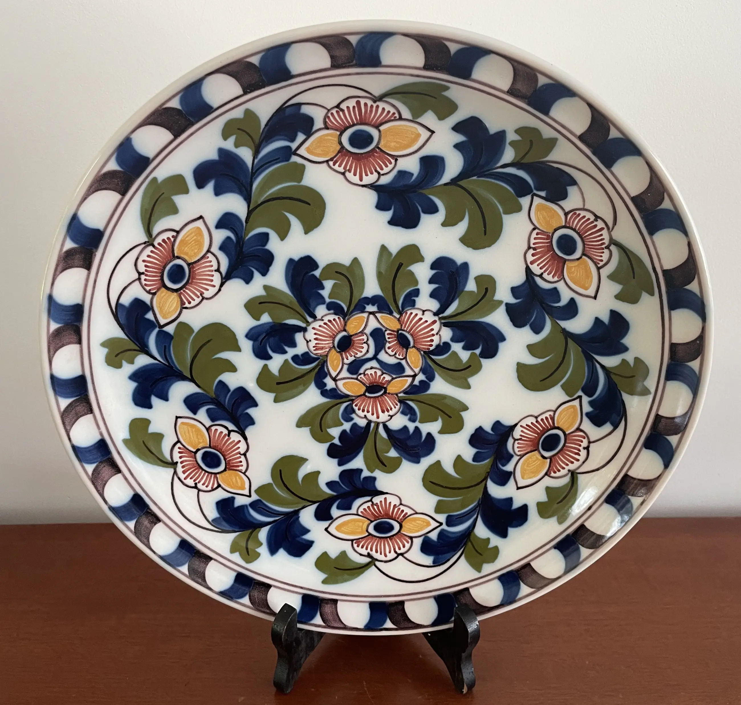 Polychroom handbeschilderd aardewerken wandbord uitgevoerd bij de Koninklijke Tichelaar uit Makkum. In onbeschadigde conditie, gemerkt aan de achterkant en voorzien van schilders initialen. Het bord is in 1990 door Philips cadeau gedaan ater ere van 25 dienstjaren aan een medewerker uit Den Haag.