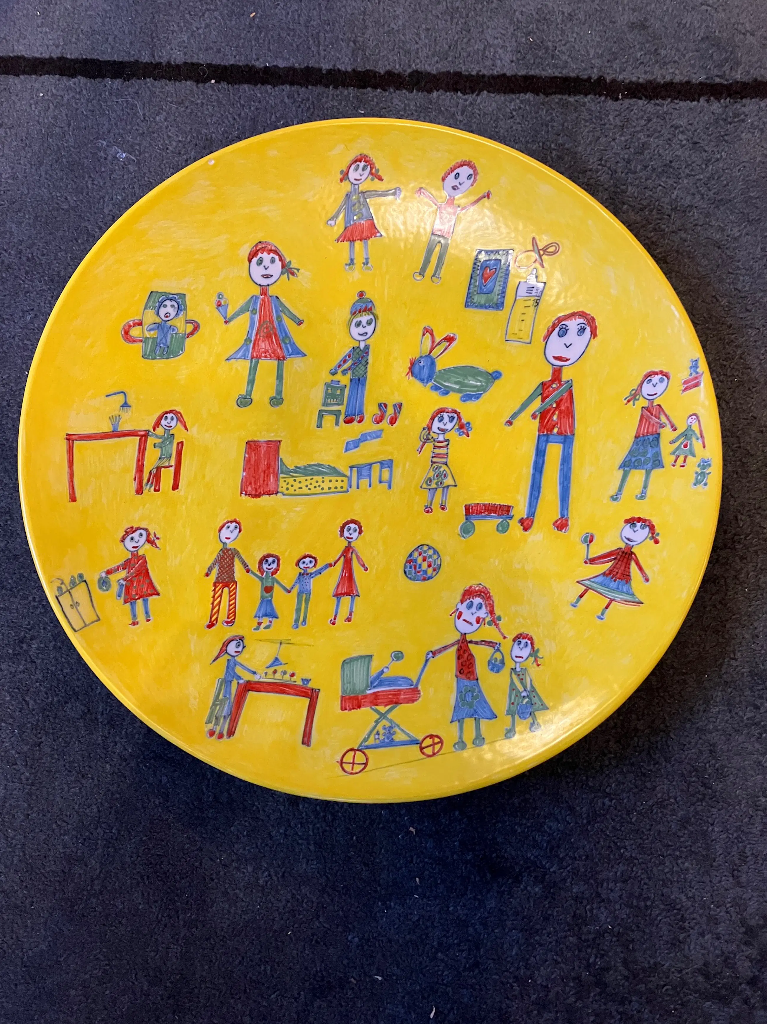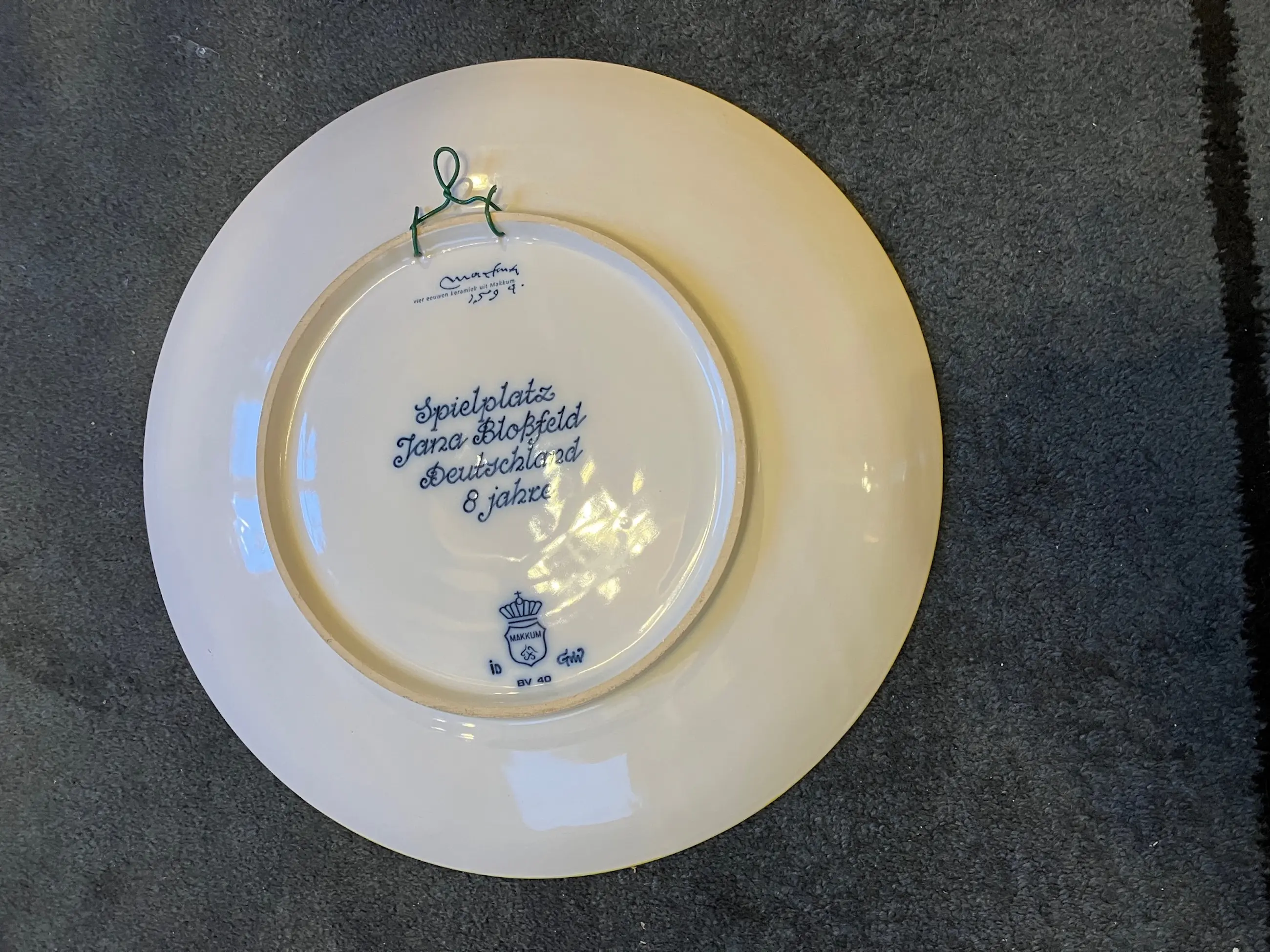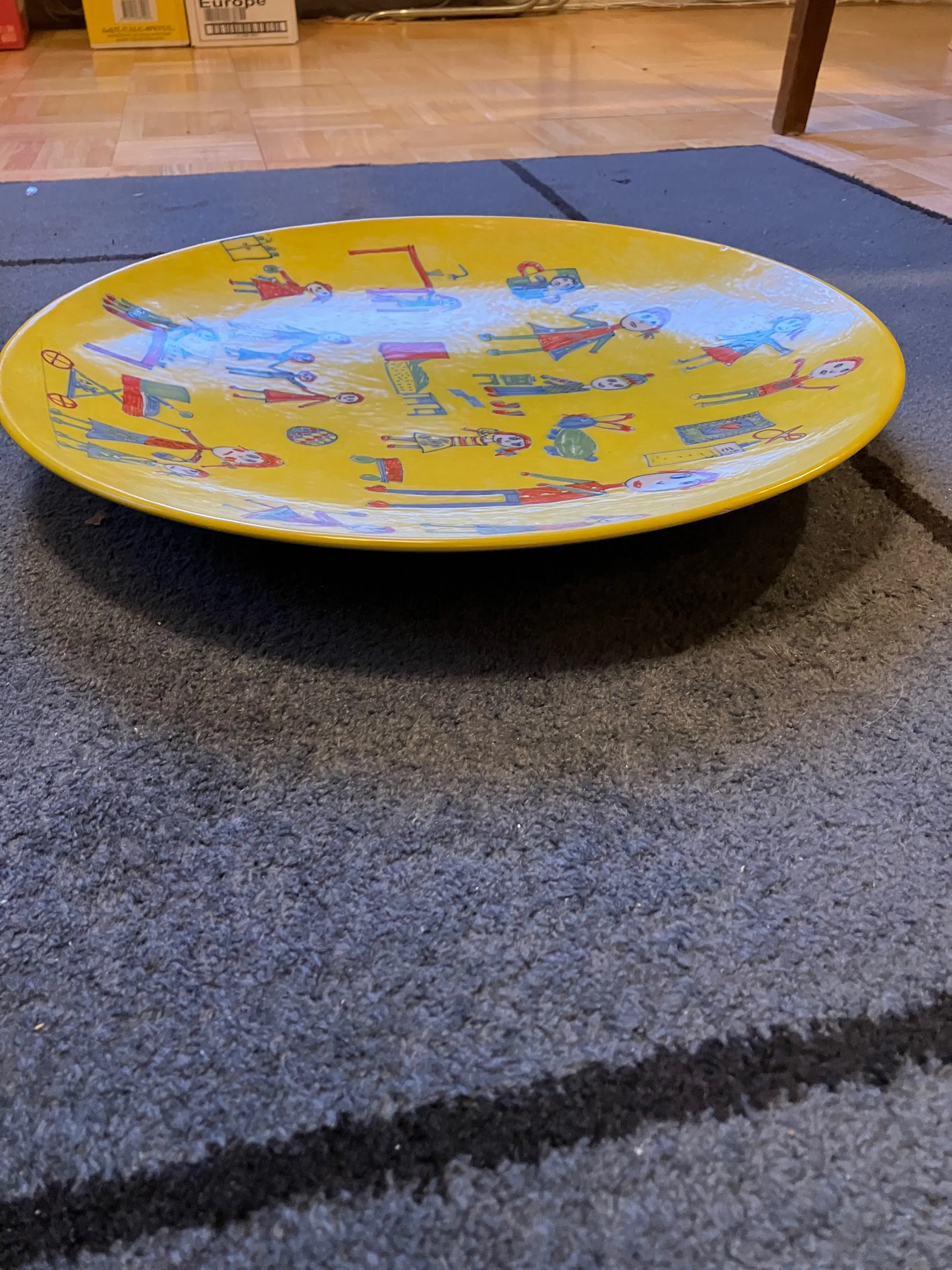 Deze grote schaal (doorsnee 41 cm) in uitmuntende staat is gemaakt bij Koninklijke Tichelaar in Makkum in 1994 in het kader van de tentoonstelling Heden, Verleden en Toekomst. De Toekomst werd gesymboliseerd door een wereldwijde kindertekenwedstrijd (samen met UNESCO). Uit de inzendingen werden door een jury met als voorzitter Dick Bruna de 100 mooiste tekeningen uitgezocht die vervolgens door de Tichelaar-schilders met de hand op een bord of een tegeltableau werden gekopieerd.