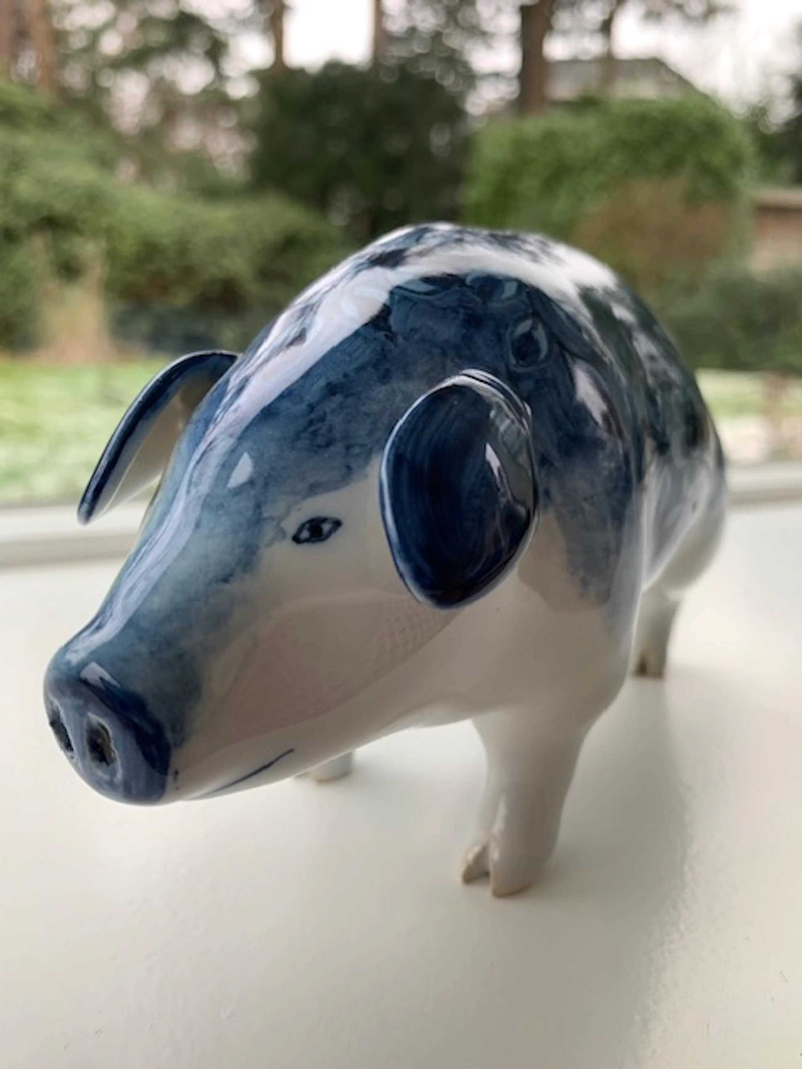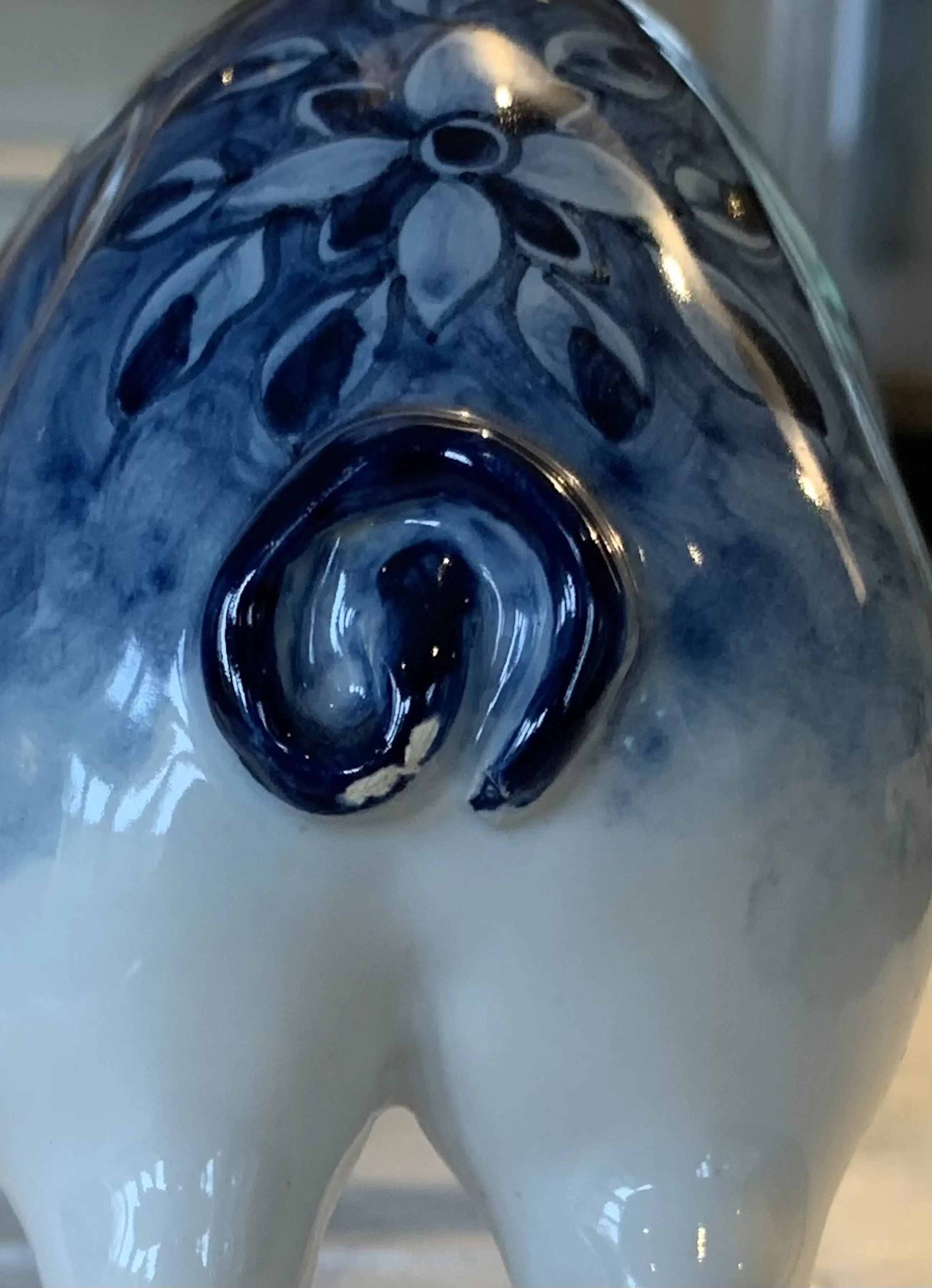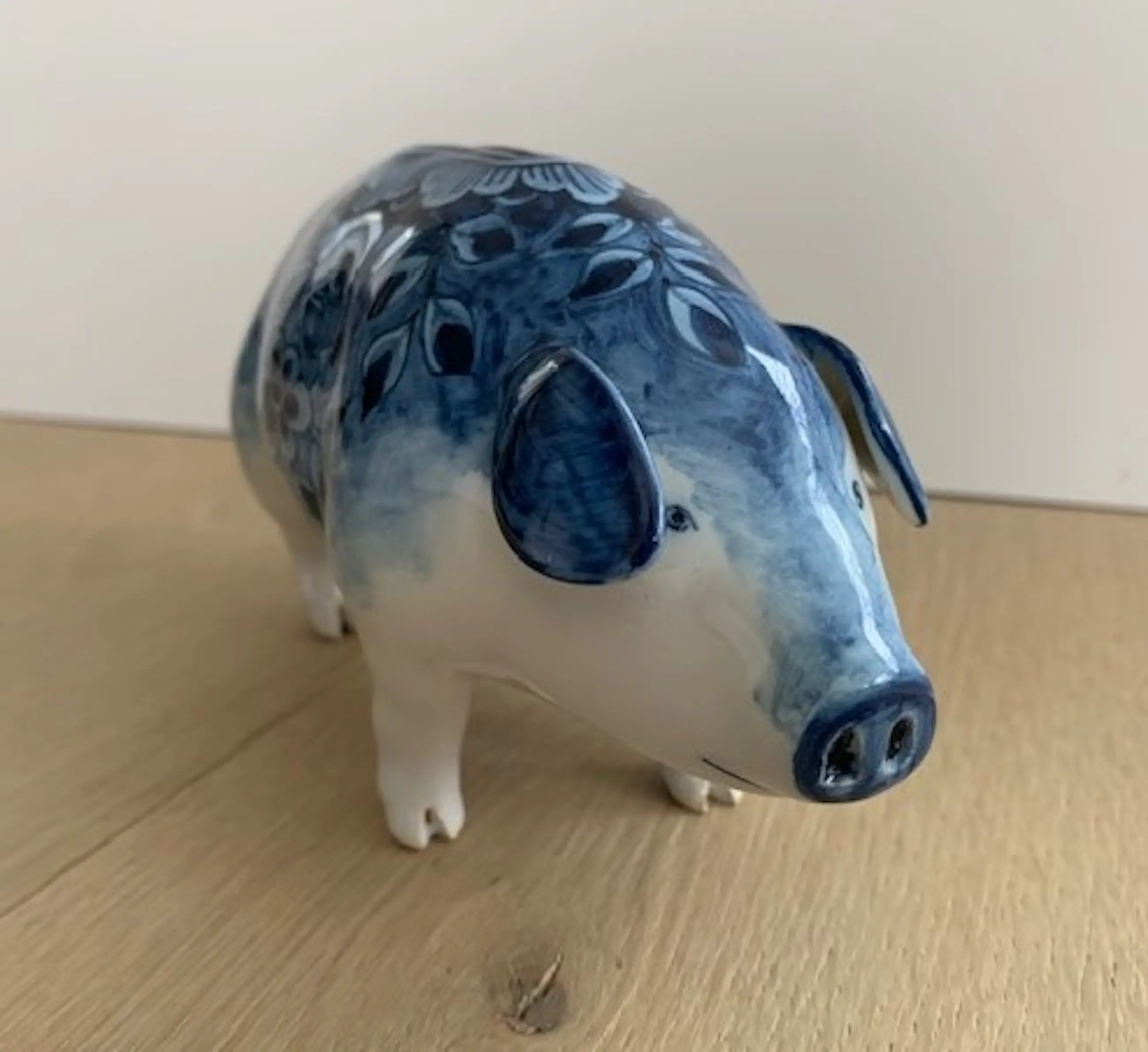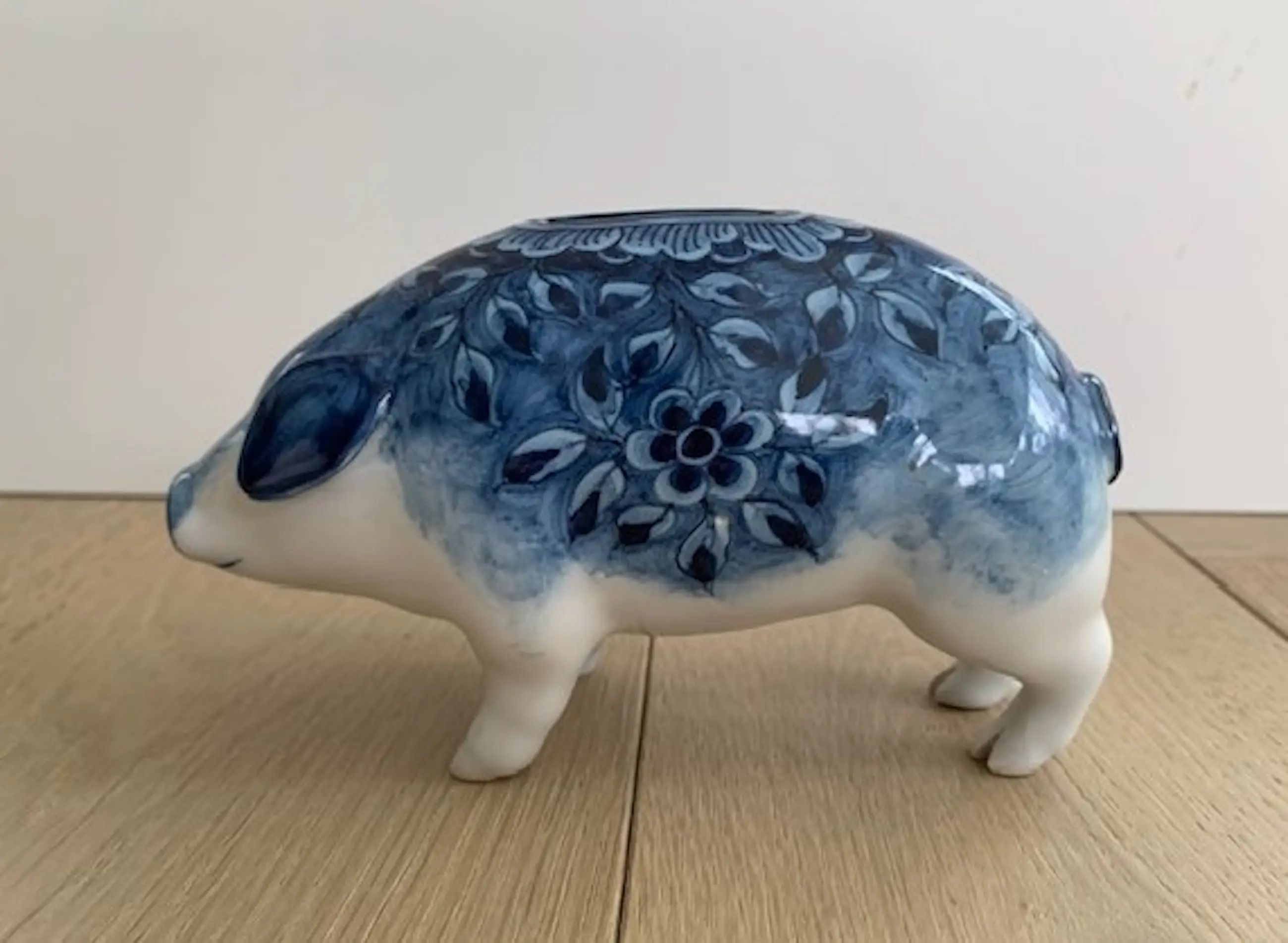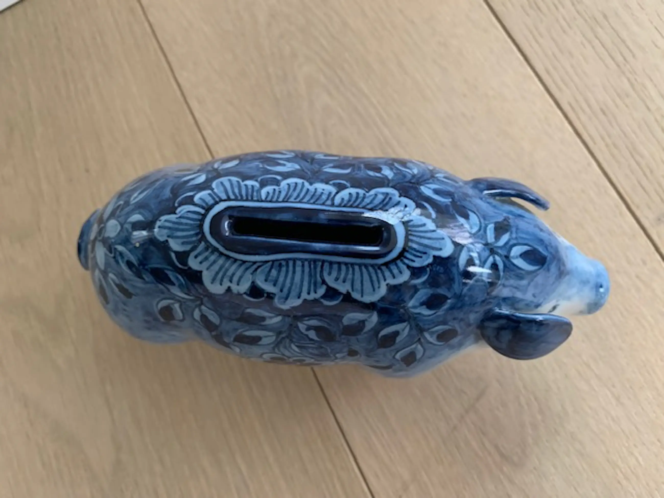 Spaarvarken voorzien van een traditioneel handgeschilderd decor in blauw.
