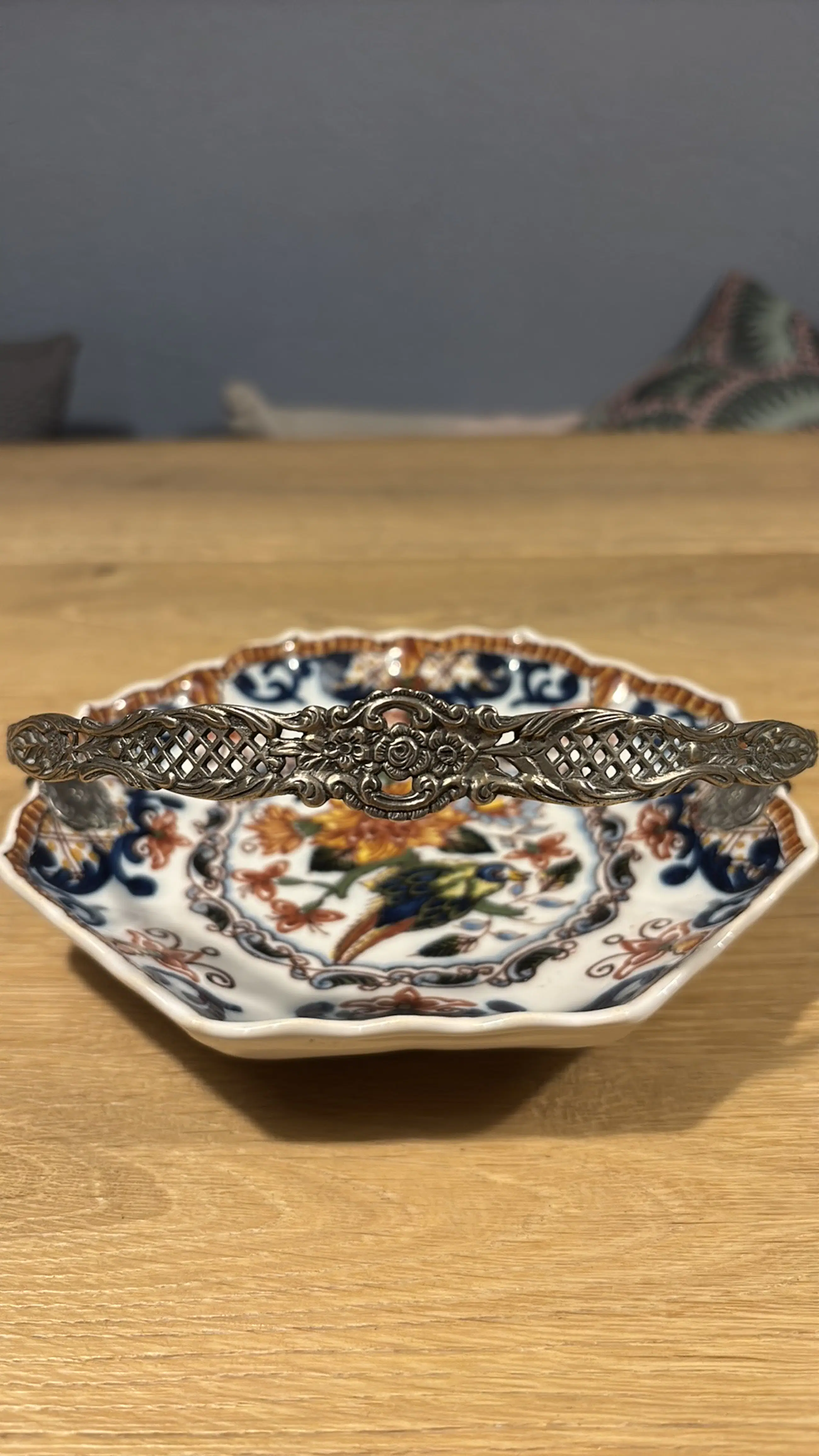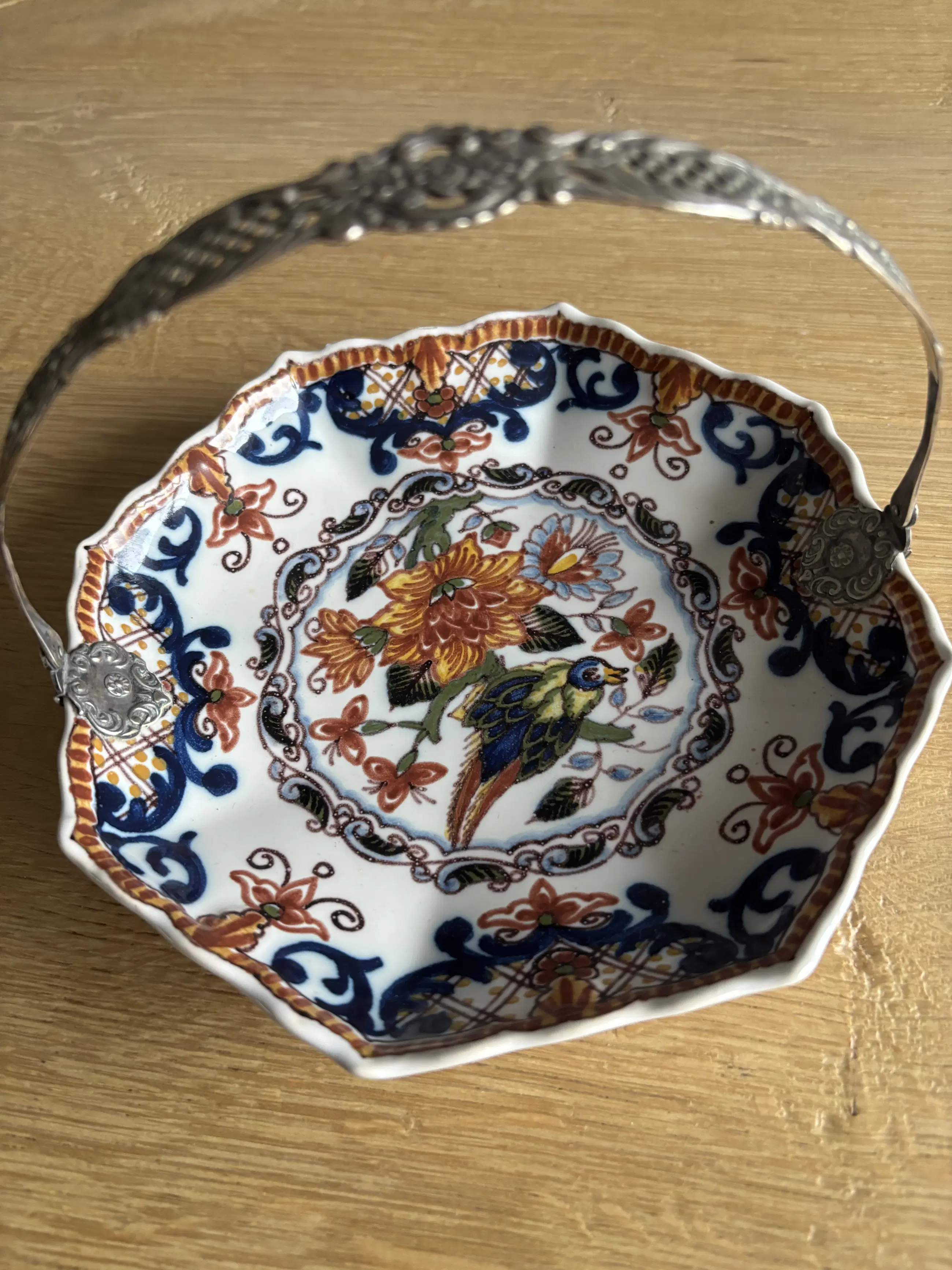 bonbonschaaltje van Makkumer aardewerk, waarschijnlijk 20e eeuw (± 1920–1950), met een zilverkleurige metalen greep