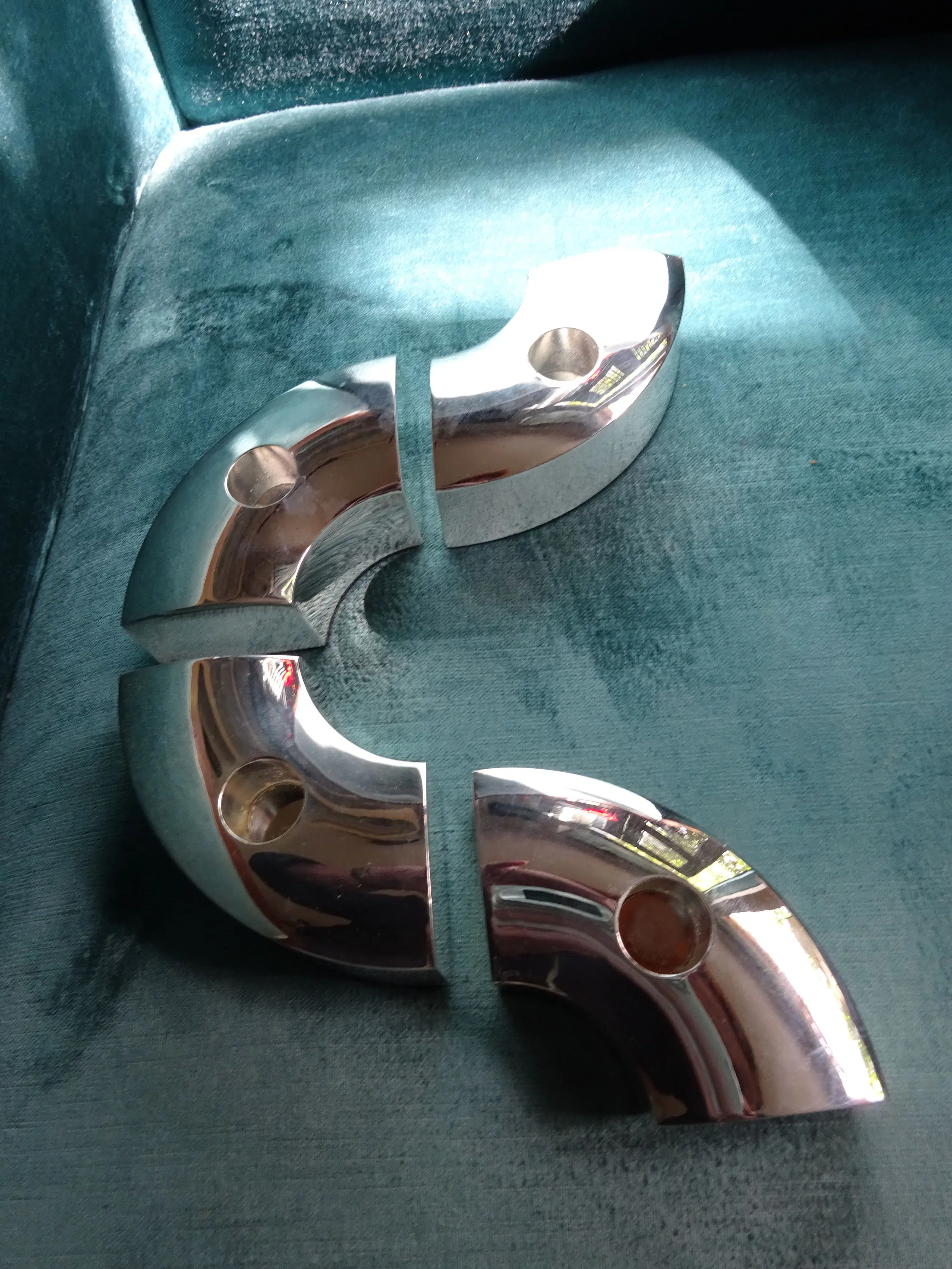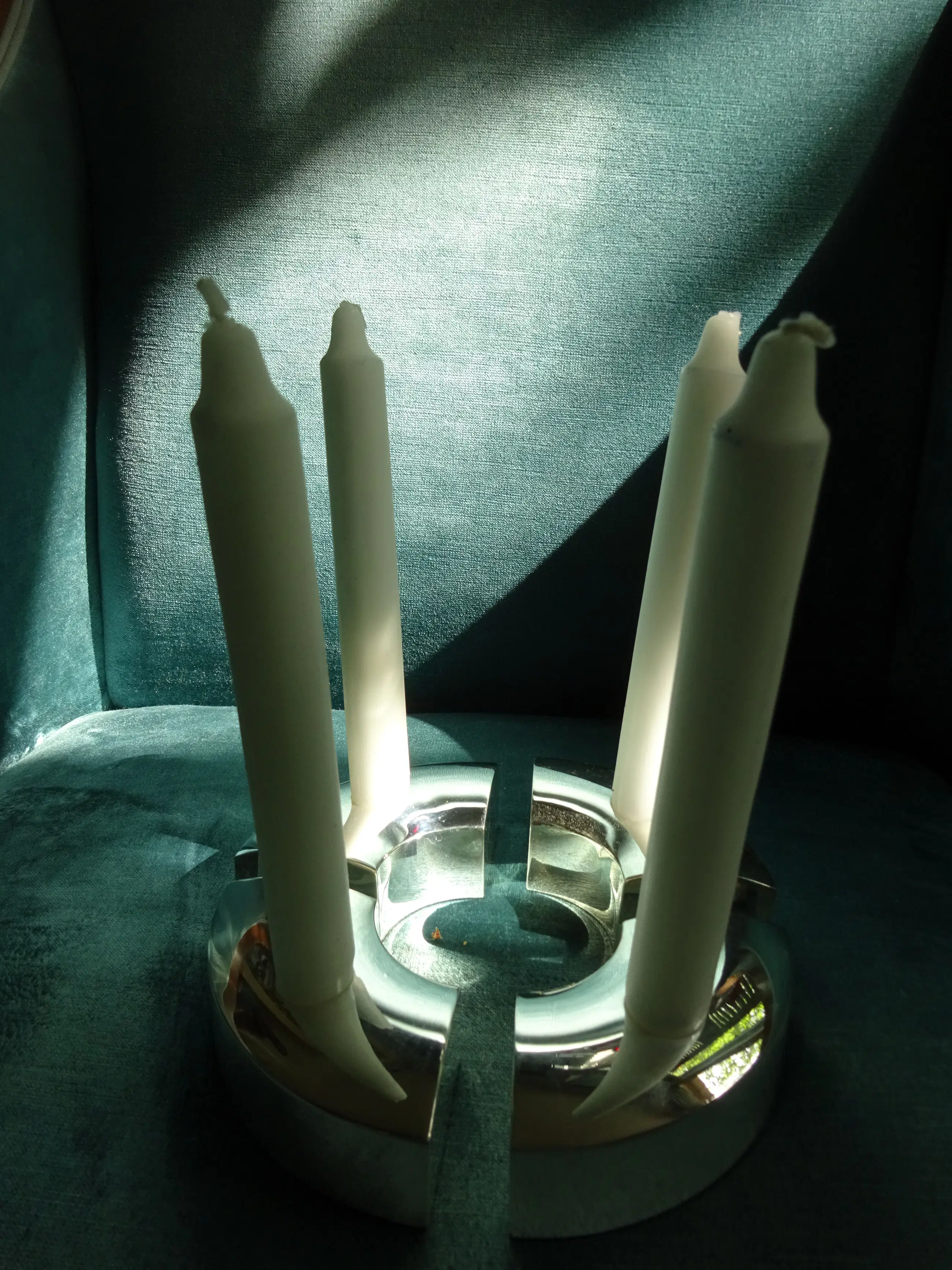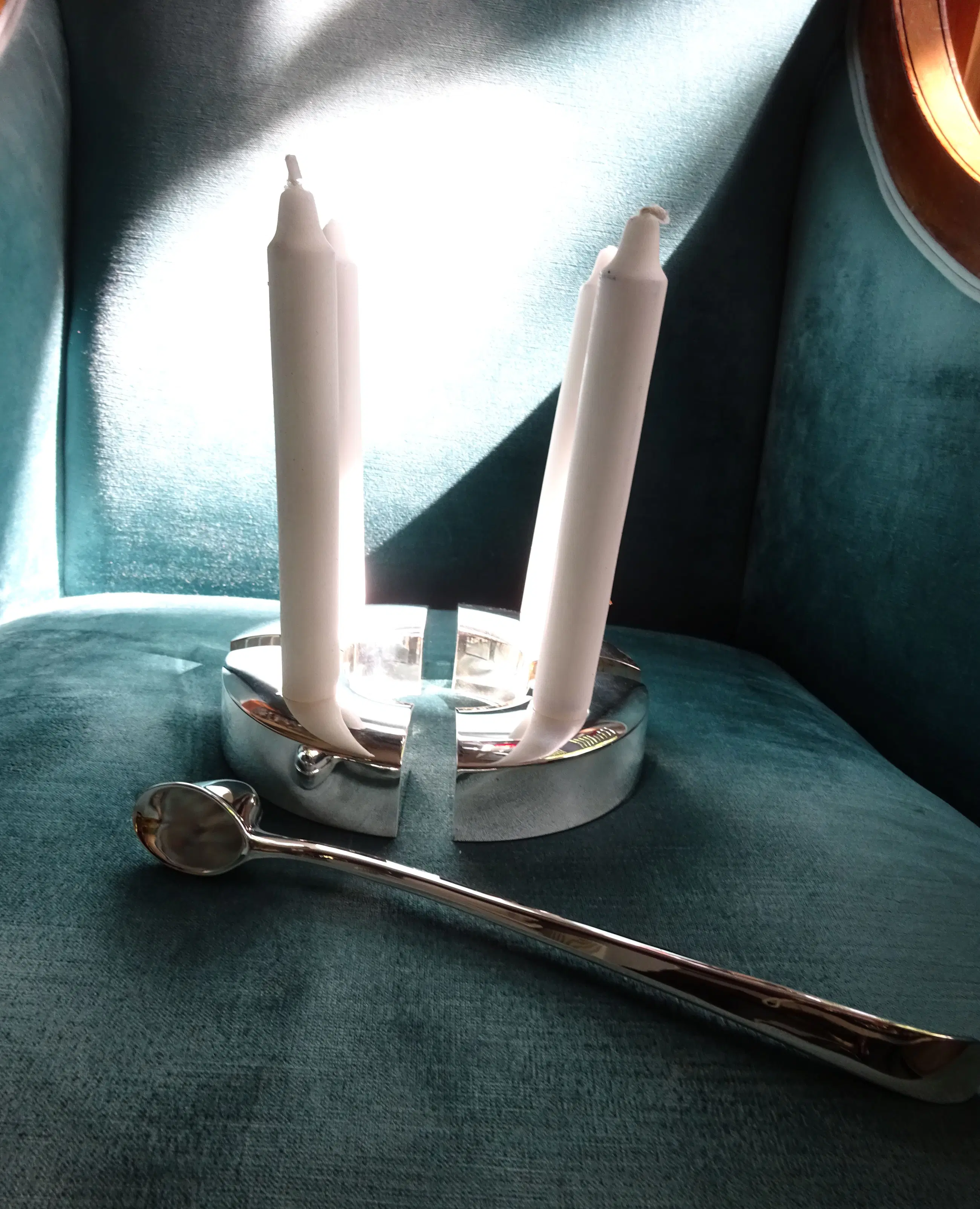 Set vier kwartronde kandelaars, vier dinerkaarsen en een kaarsen-dover Ontwerp: Chantal Niels Uitvoering: Koninklijk Begeer afmeting: Cirkel kandelaars ca 16 cm Hoogte: 3.5 cm Kaarsen-dover: ca 25 cm