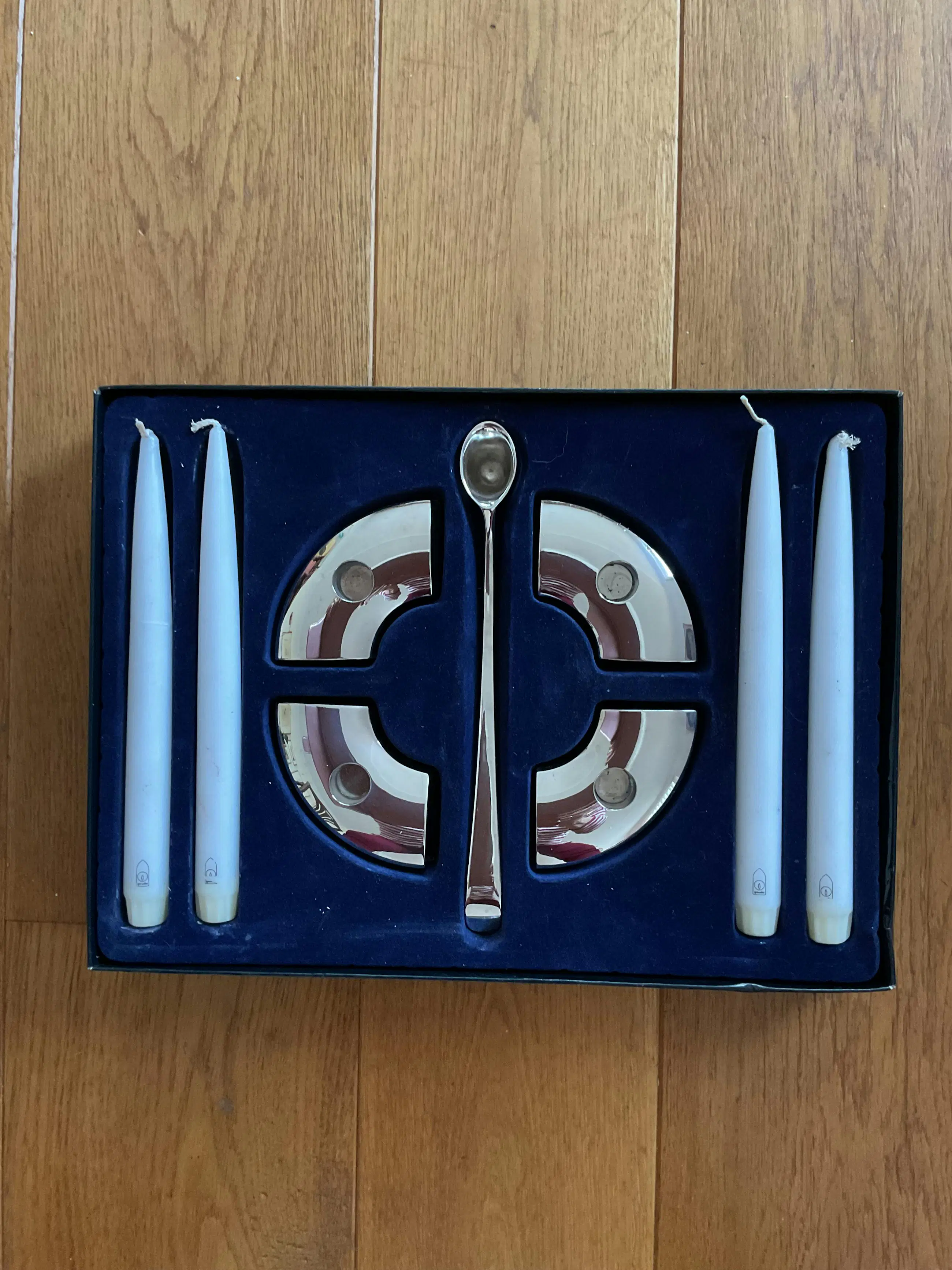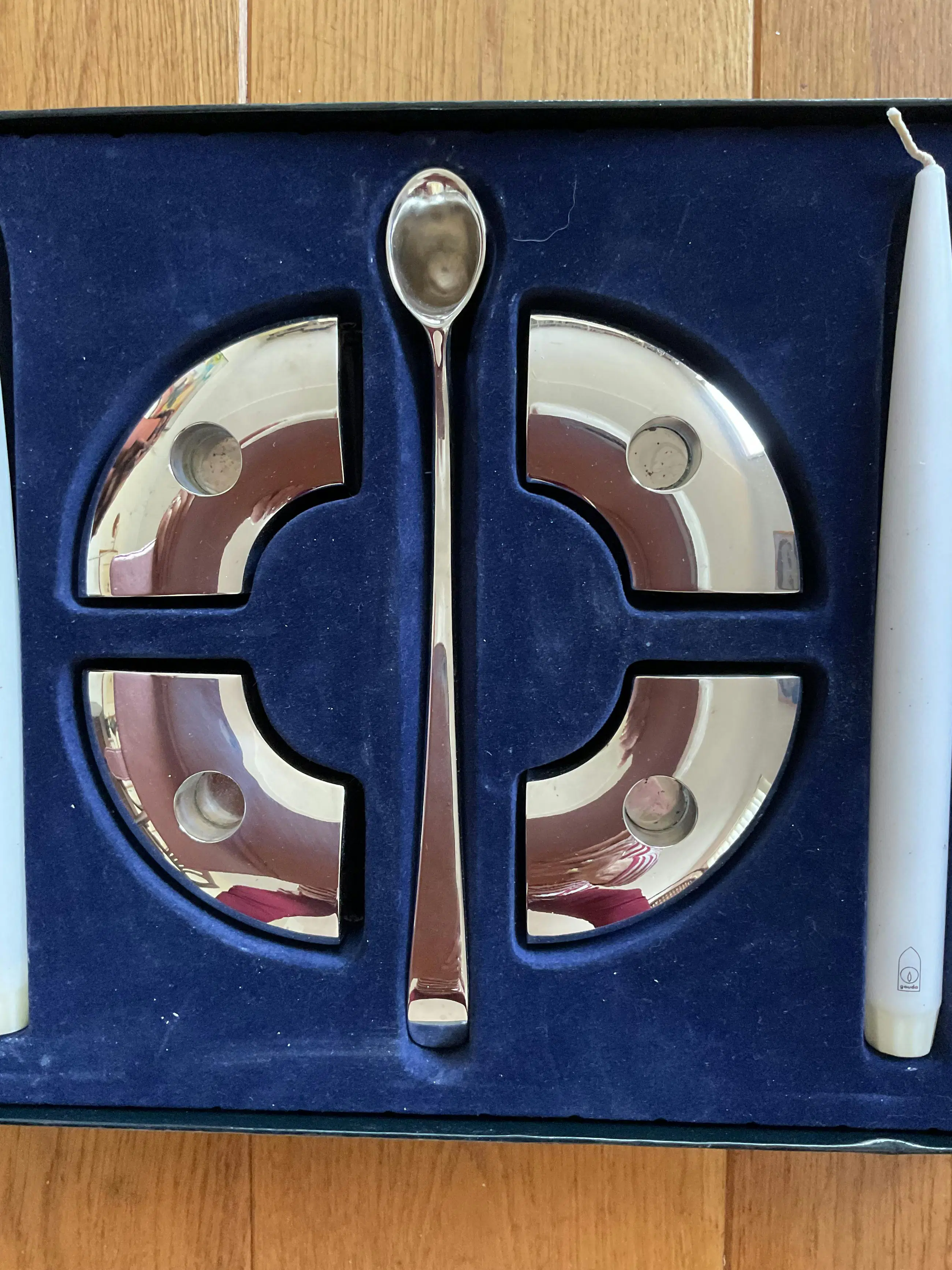 Inclusief dover. Designset, ontworpen door Koninklijke Begeer. De set zit in de originele doos De kandelaars kunnen in verschillende vormen worden gezet. Afmetingen 3x16 cm elk Is inmiddels collectors item Conditie goed, enkele plekjes