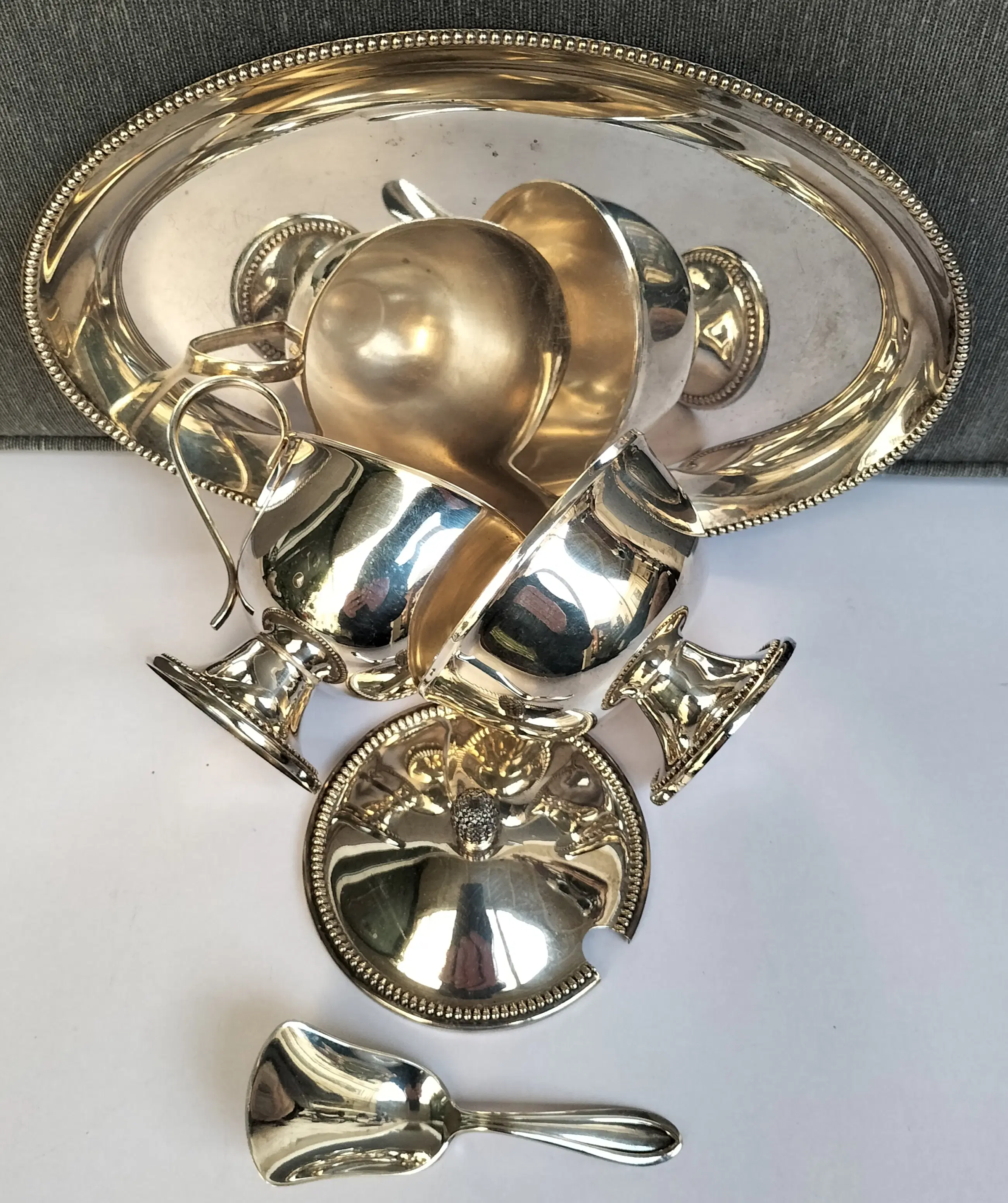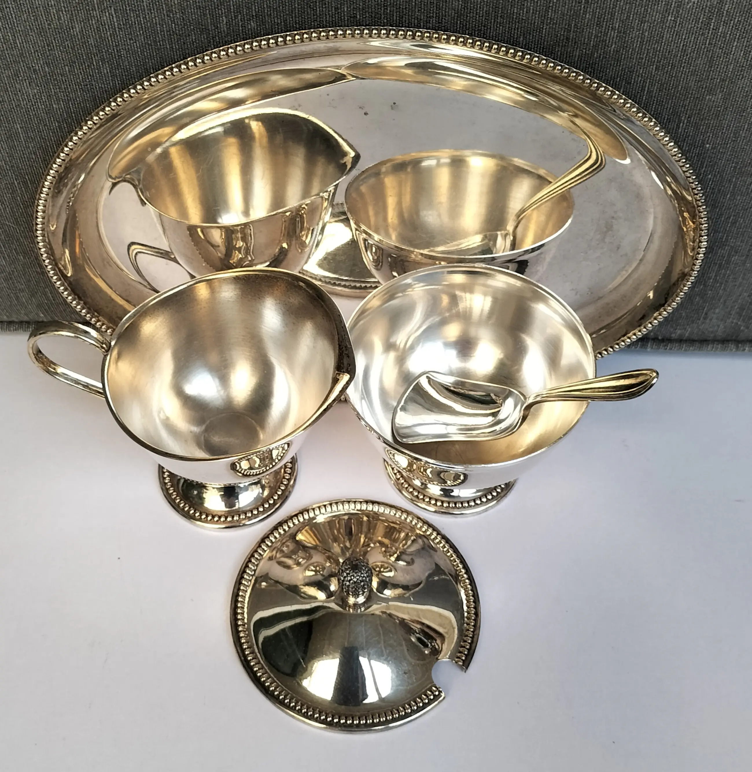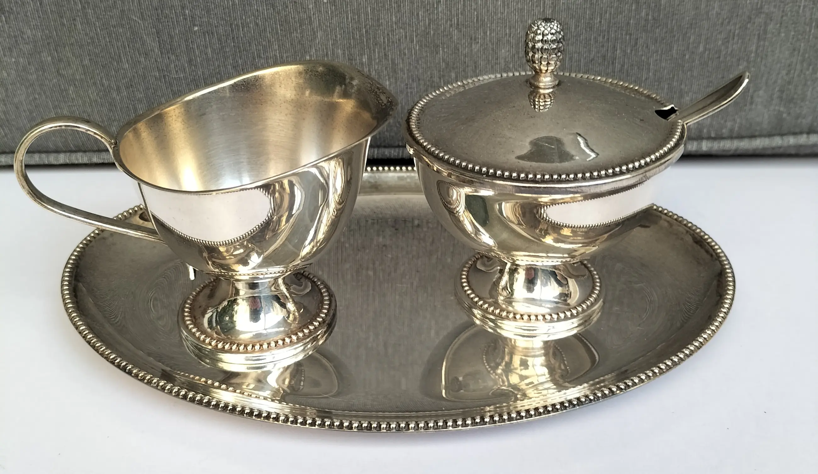 Zeer fraaie verzilverde set van Keltum uit de jaren 50, bestaande uit een suikerpot met deksel en bijpassende lepel, een melkkan, beide op een ovaal dienblad. Mooi van vorm en alle drie voorzien van een zgn. "parelrand". De dekselknop van de suikerpot is werkelijk prachtig bewerkt. Gemerkt met de naam Keltum onderop de suikerpot (erg klein) en ook het lepeltje is gemerkt.