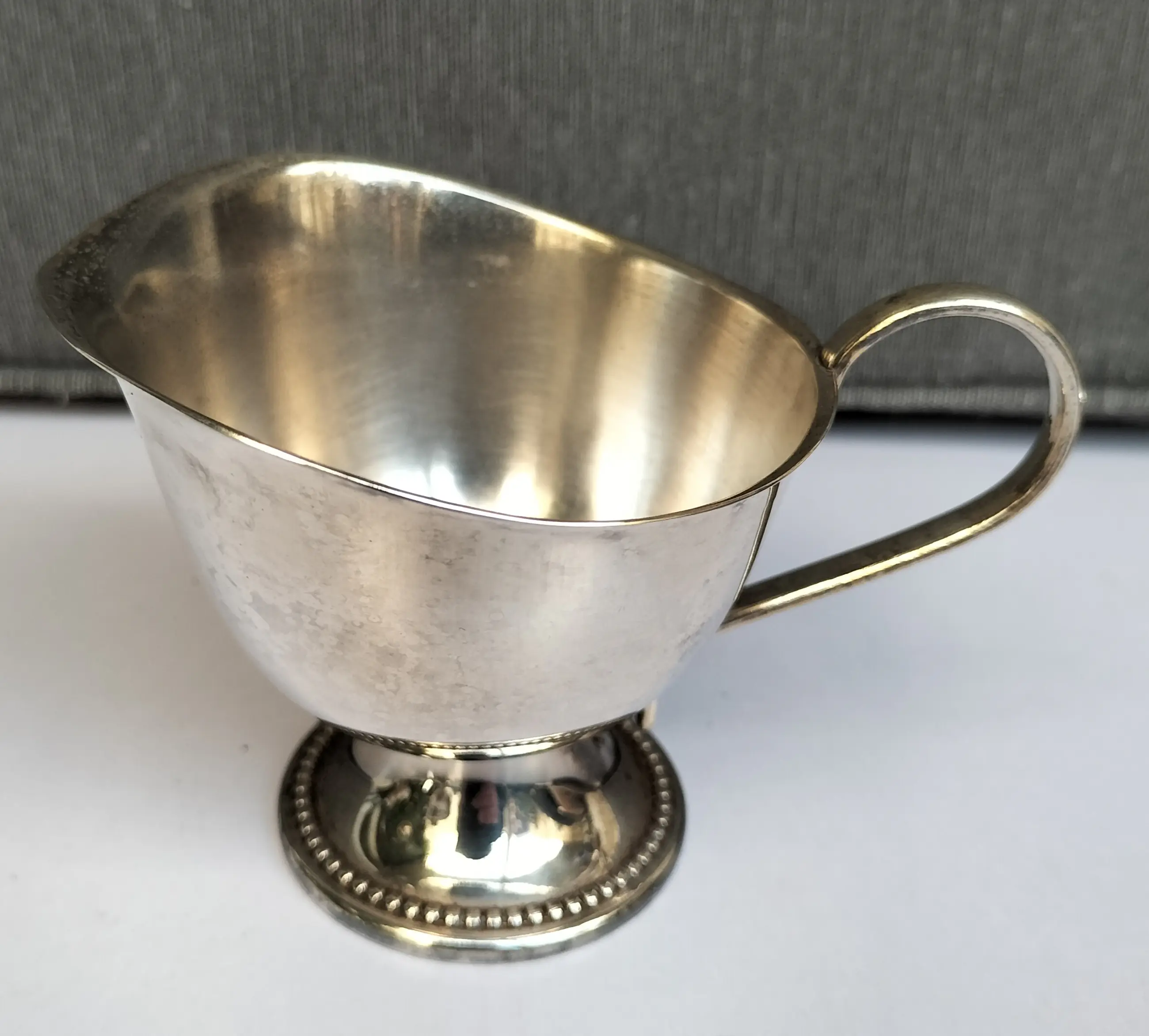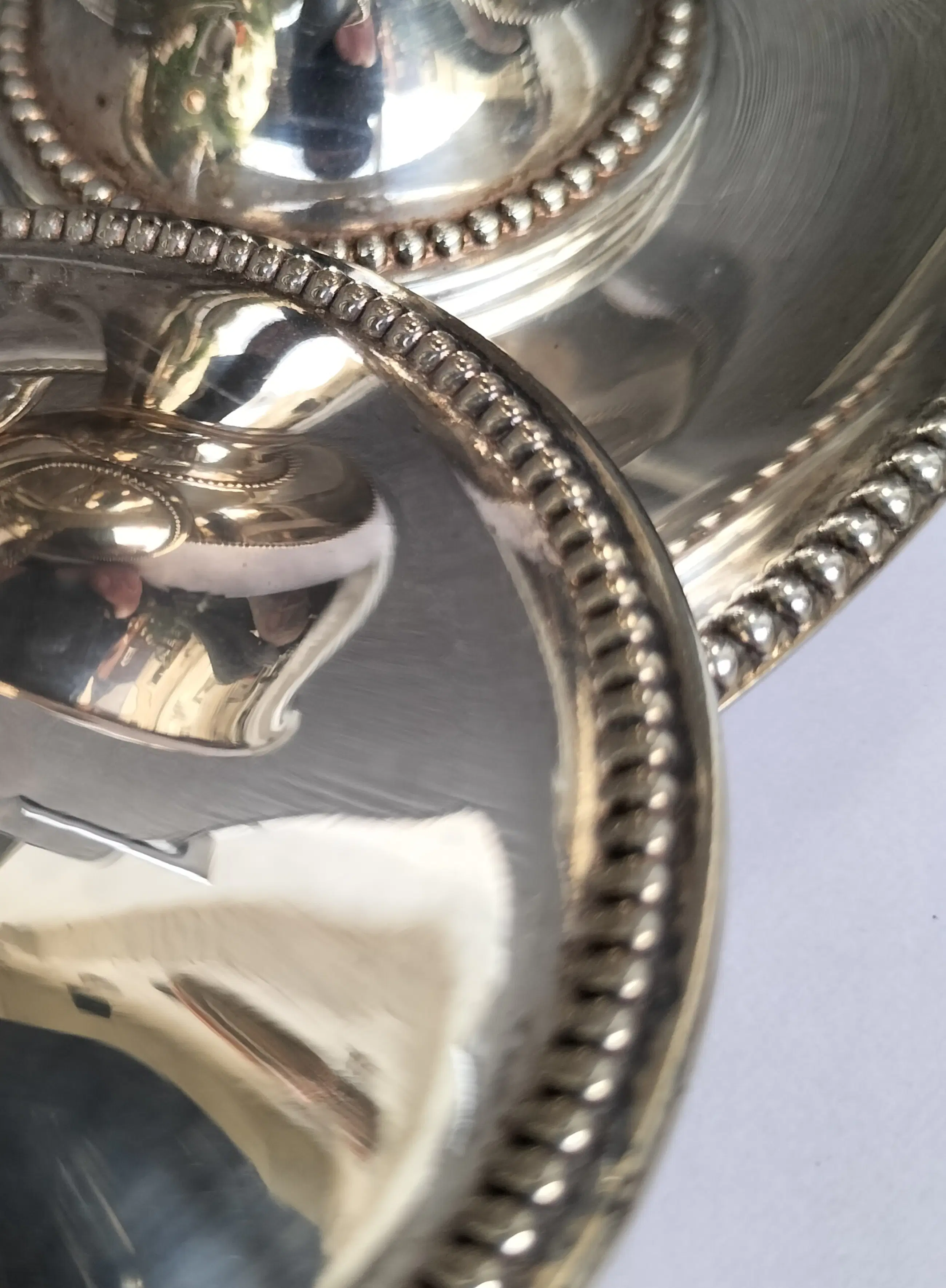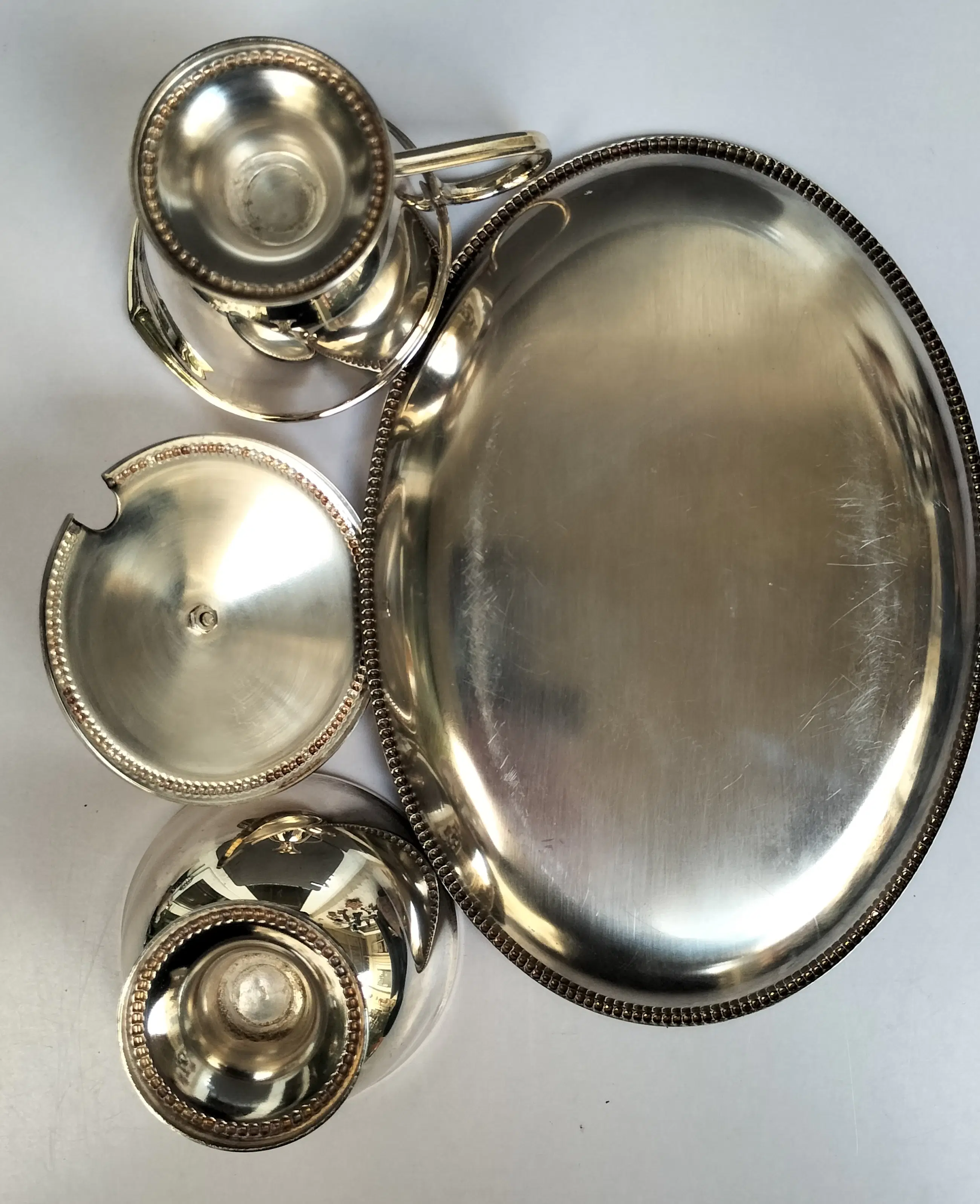 Zeer fraaie verzilverde set van Keltum uit de jaren 50, bestaande uit een suikerpot met deksel en bijpassende lepel, een melkkan, beide op een ovaal dienblad. Mooi van vorm en alle drie voorzien van een zgn. "parelrand". De dekselknop van de suikerpot is werkelijk prachtig bewerkt. Gemerkt met de naam Keltum onderop de suikerpot (erg klein) en ook het lepeltje is gemerkt.