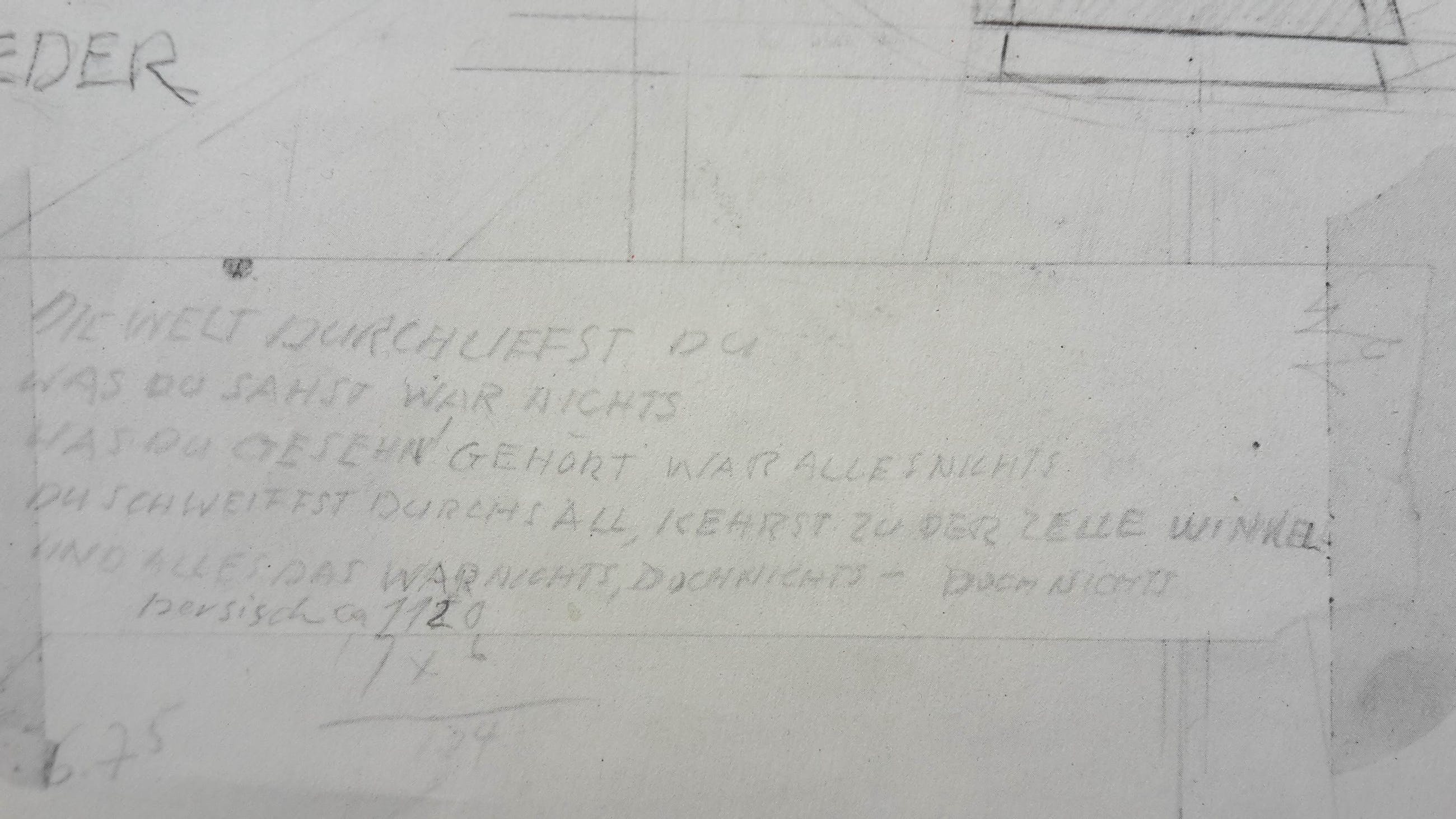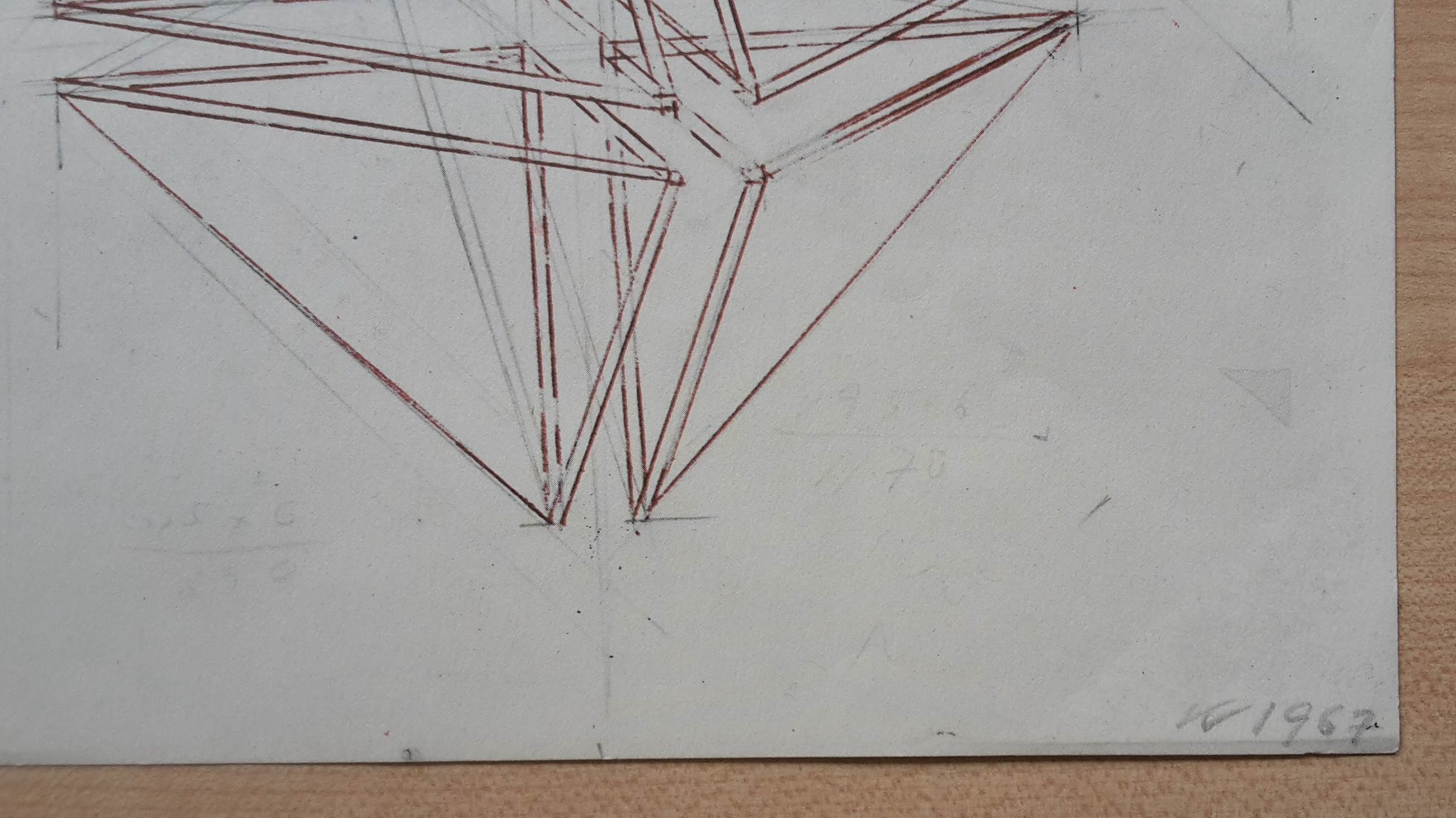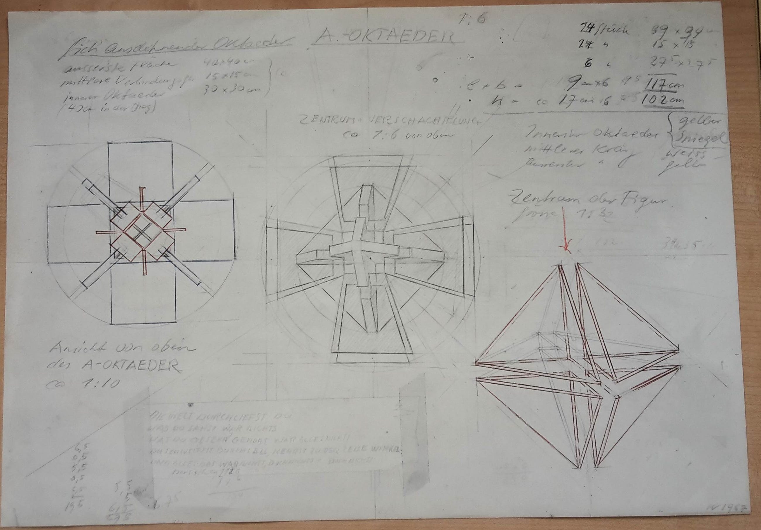 fotokopie van een ontwerptekening van een glassculptuur "A-Oktaeder" op schaal 1:10 met aantekeningen. Gesigneerd met potlood (monogram en jaartal). Aan de onderzijde van het blad heeft de kunstenaar met plakband nog een stukje tekst geplakt (zie foto), kennelijk bedoeld als leitmotif van het ontwerp. De Zwitserse kunstenaar Konrad Vetter is vooral bekend van zijn complexe geometrische sculpturen van stukken aan elkaar gelijmd plaatglas. Het is mij niet bekend of hier aangeboden ontwerp ook daadwerkelijk is uitgevoerd. Wordt verzonden opgerold in kartonnen koker.
