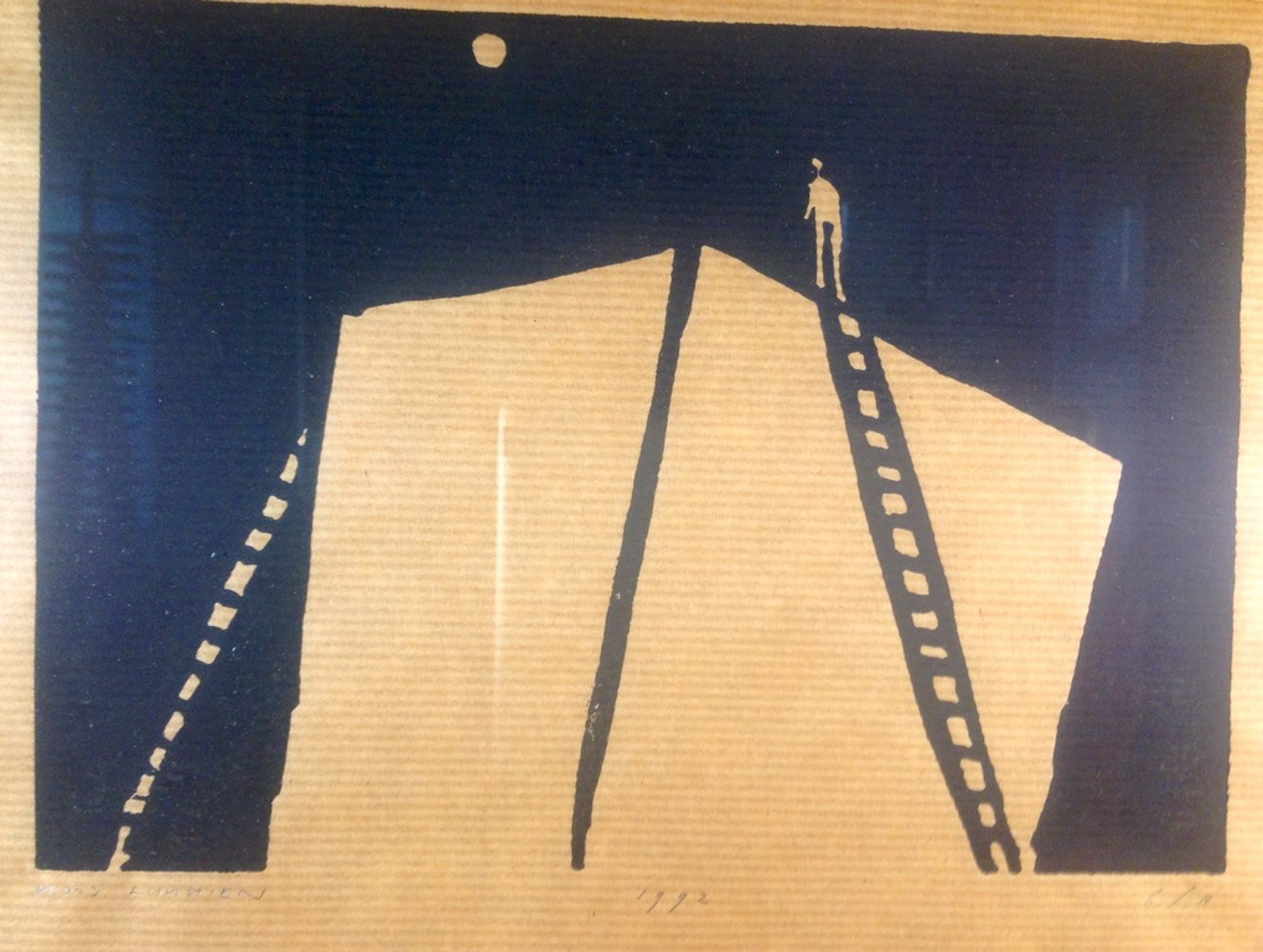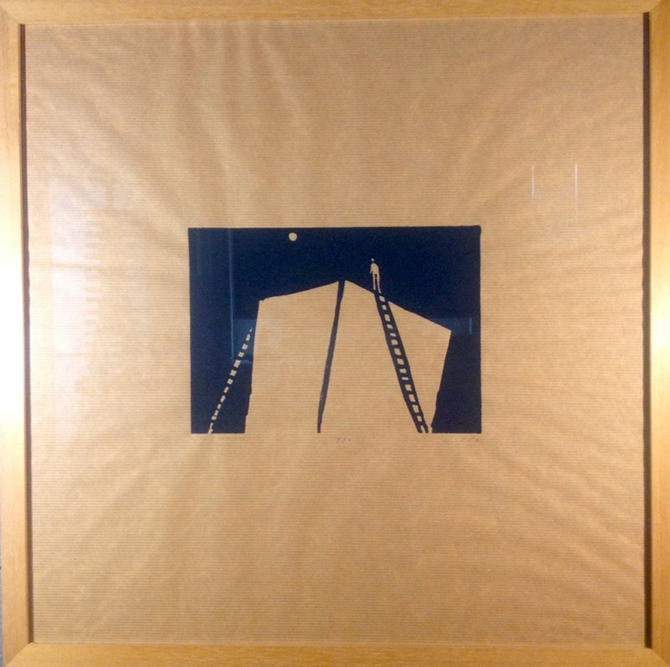 Hoort bij een serie van drie druksels (zeefdruk of hoogdruk) op pakpapier, ingelijst, formaat 53 x 53 cm. Door het glas is op de foto's enige spiegeling zichtbaar, maar de druk is zwart. Gesigneerd, 5/15, 1992.