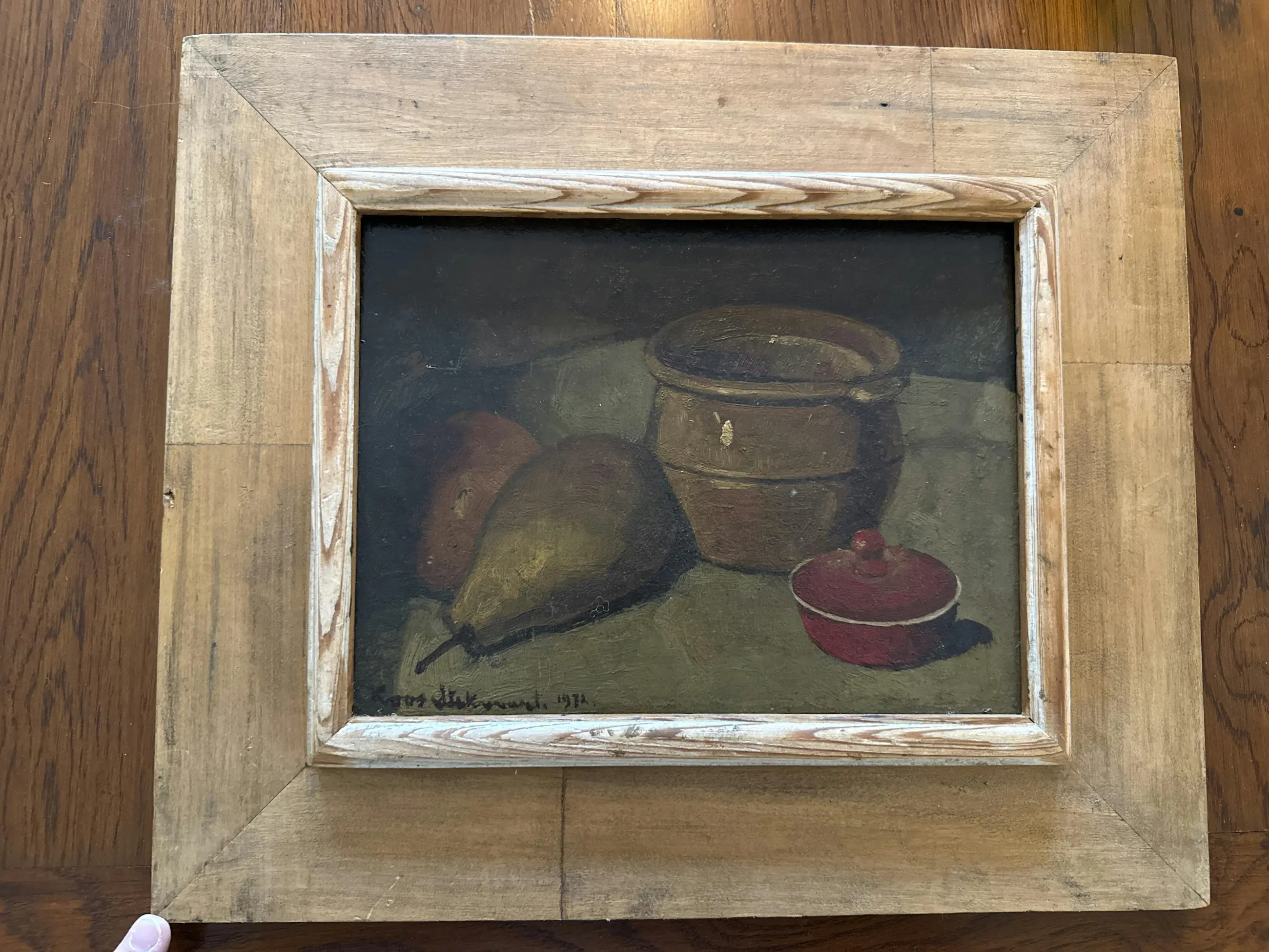 Werk van Koos Stokvoort uit 1972. Laat een tafereel uit de keuken zien; appel, peer, pot en schaaltje. In goede conditie.