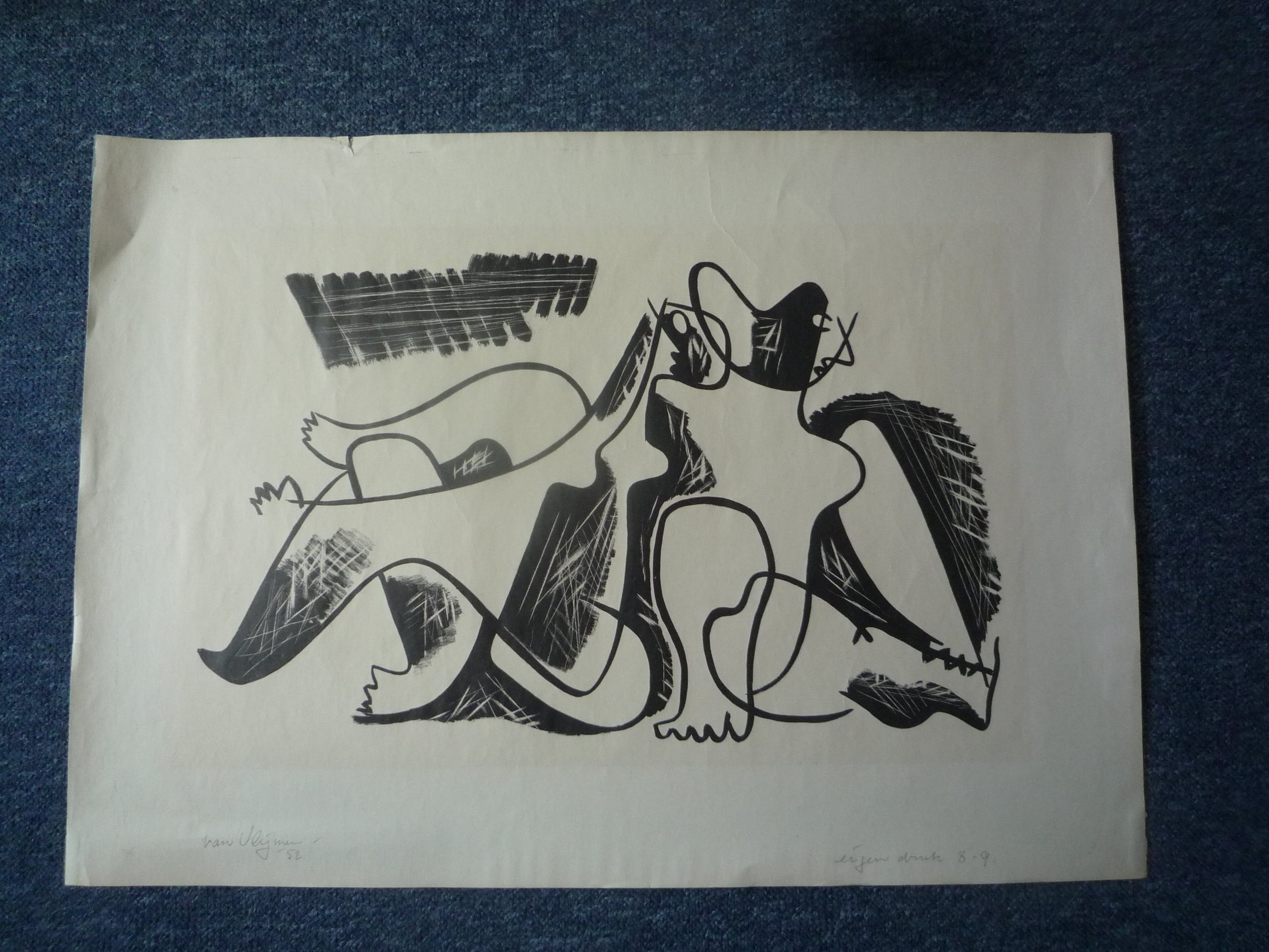 Zeldzame litho door Koos van Vlijmen. Dit is waarschijnlijk de enige litho van deze serie die nog over is. Waar ik ook op internet zoek ik kom hem nergens tegen.