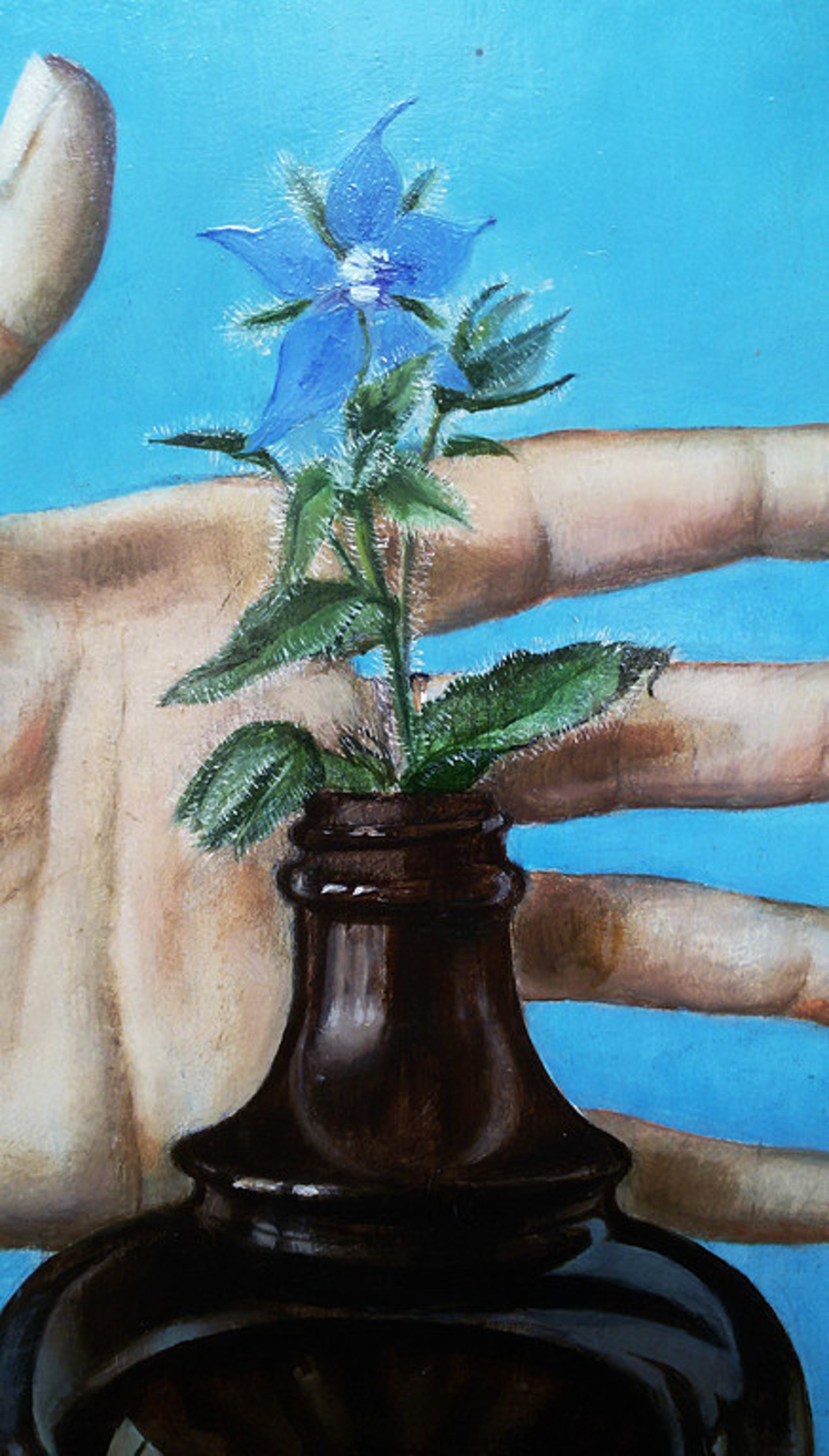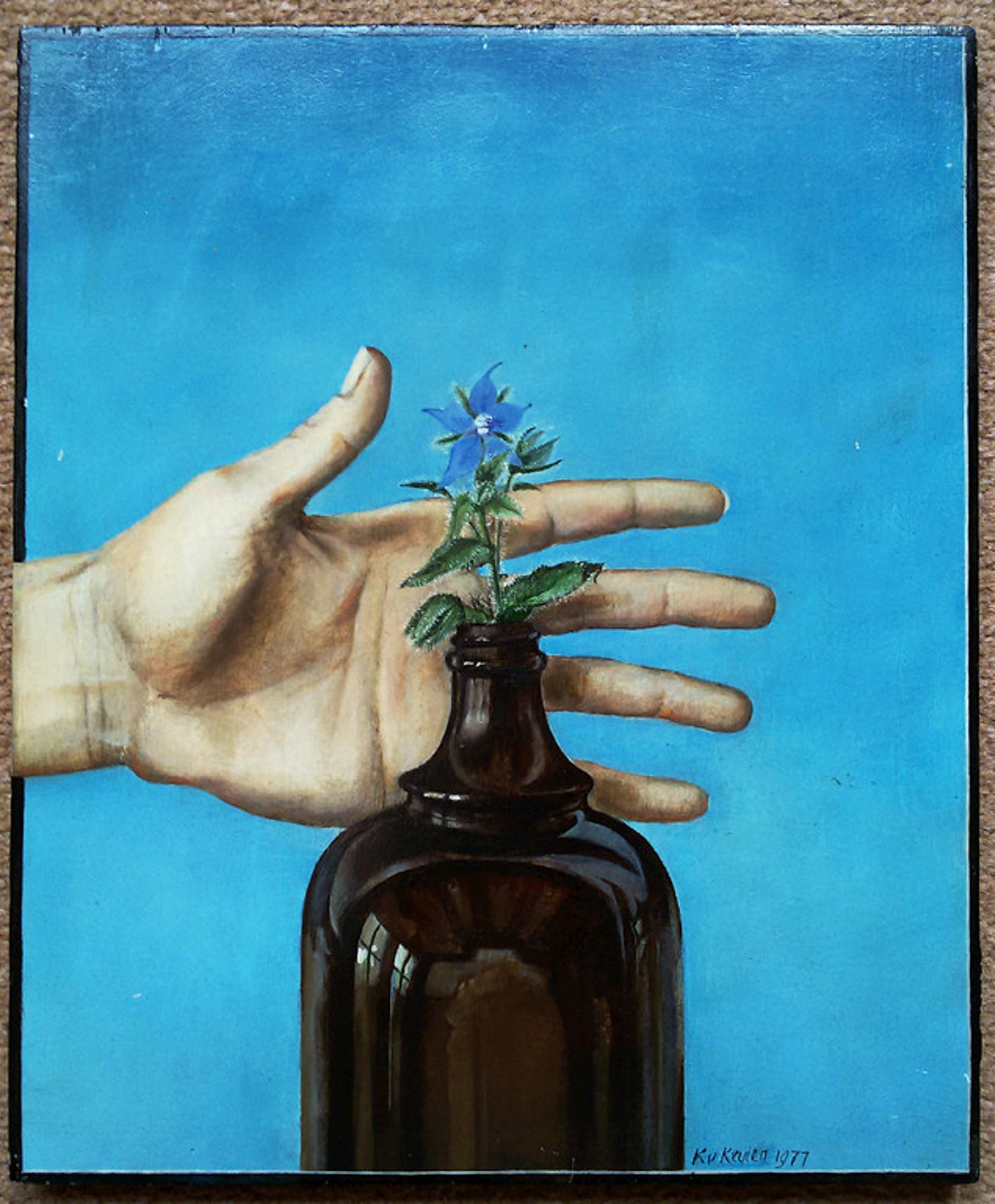 Schitterend, hyperrealistisch stilleven van Koosje van Keulen. Olieverf op paneel, gesigneerd en gedateerd (1977) rechtsonder. Werk moet niet ingelijst worden, het werk heeft namelijk ook een “trompe l’oeil” component; de lijst is een zwarte rand door Van Keulen zelf geschilderd en de hand is over deze lijst heen geschilderd (loopt ook door aan de zijkant). In zeer goede conditie.