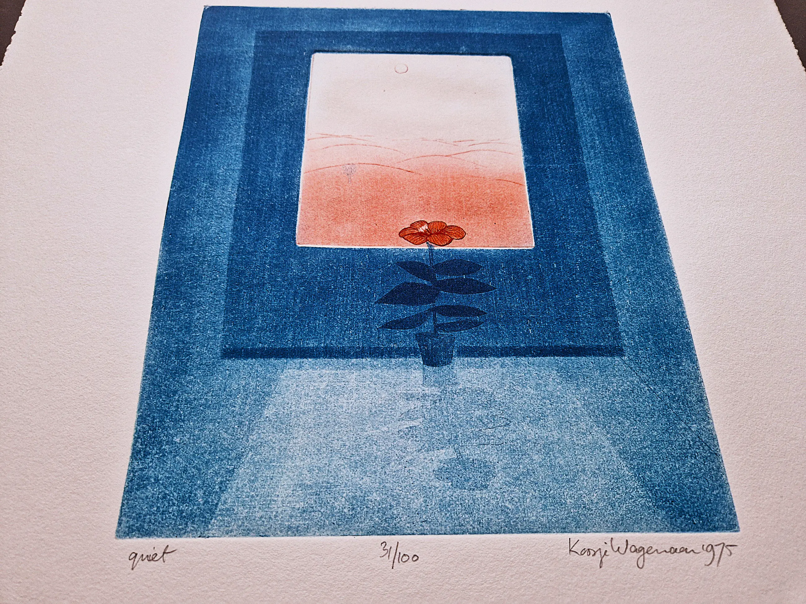 Despite a prolific career, limited information is found on the life of painter, printmaker, and designer Koosje Wagenaar. She was born in Utrecht, the Netherlands, in 1943, and studied graphic arts at the Reitvald Academy in Amsterdam, where she became a member of the Professional Association of Visual Artists BBK. She is best known for her etchings and aquatints of minimalist landscapes, interiors, and surreal scenes in layered, transparents inks. Her work is held in the collections of the Rijks Museum, the Stedelijk Museum, Haags Gemeentemuseum, and Museum Helmond among others, and commissioned large-scale works can be found in a municipal building of Zeewolde and a metro station in Rotterdam.