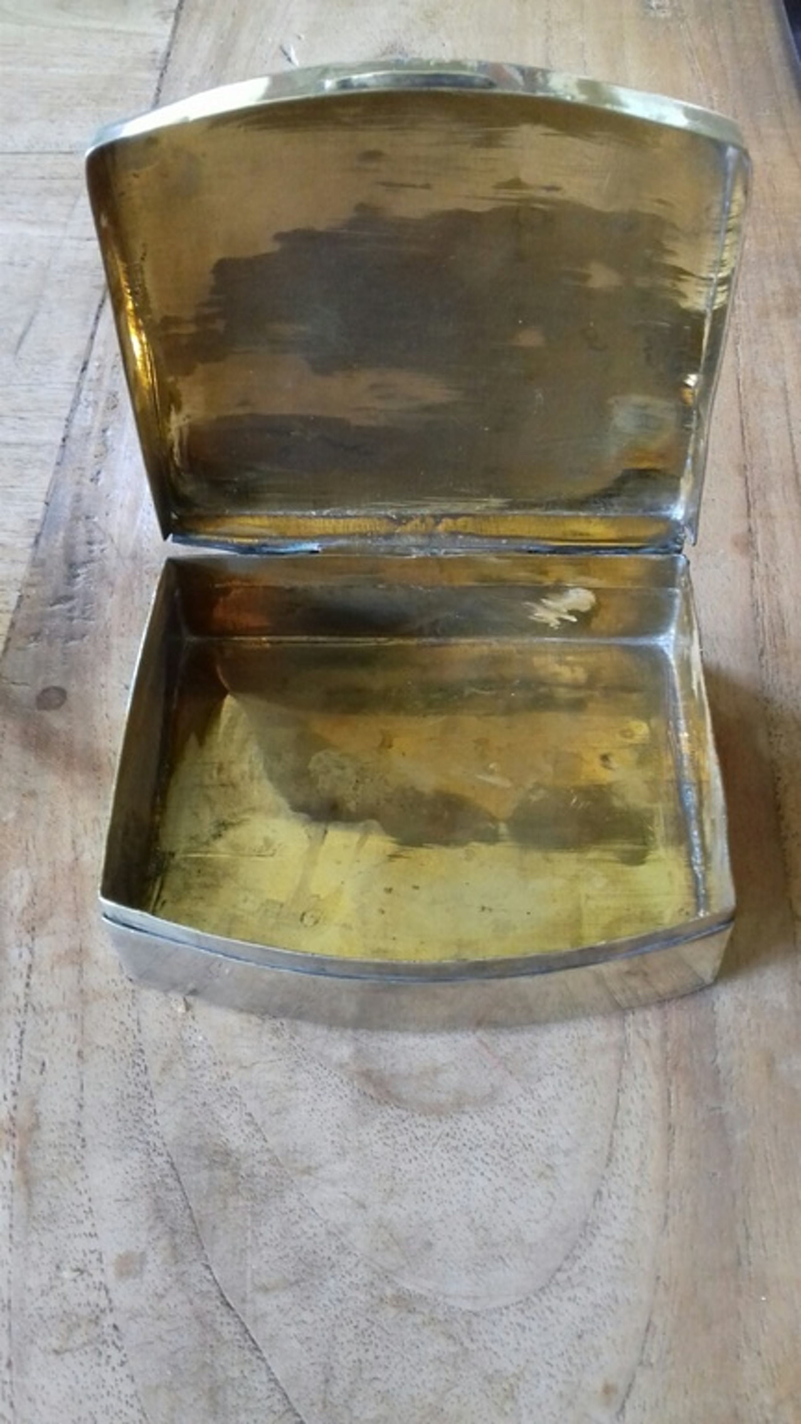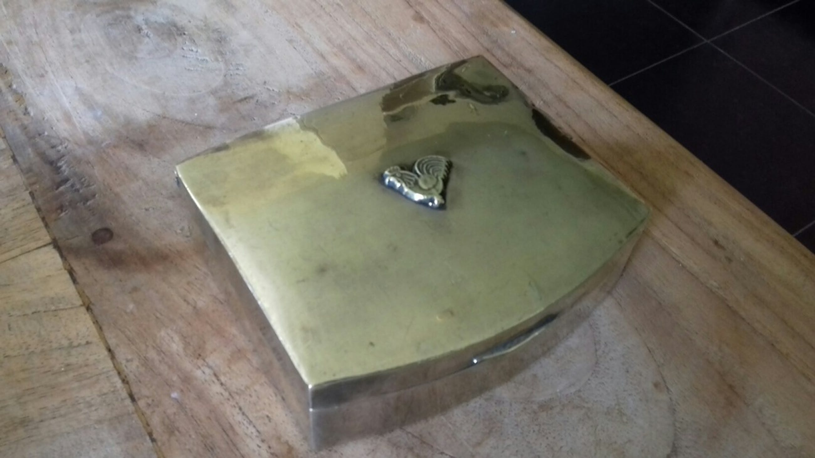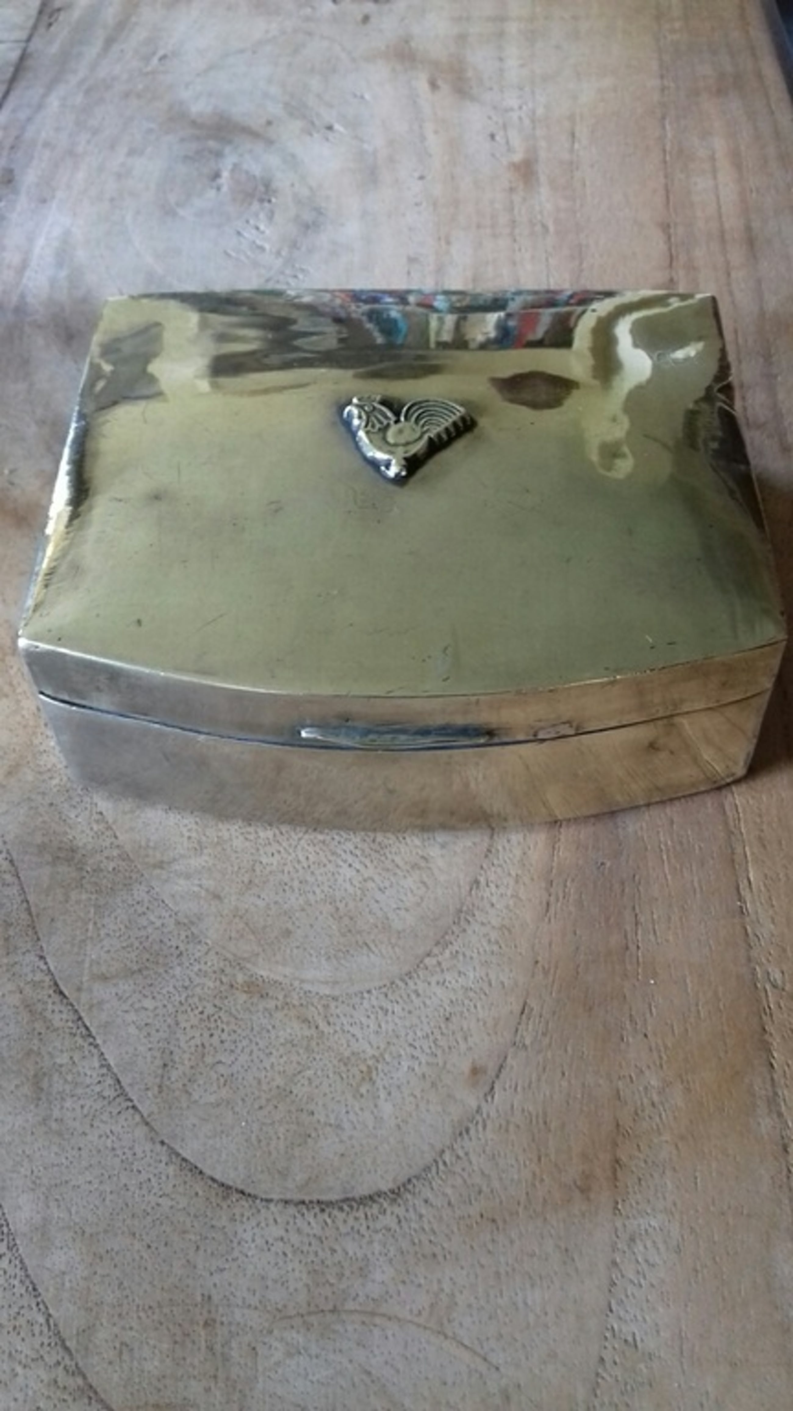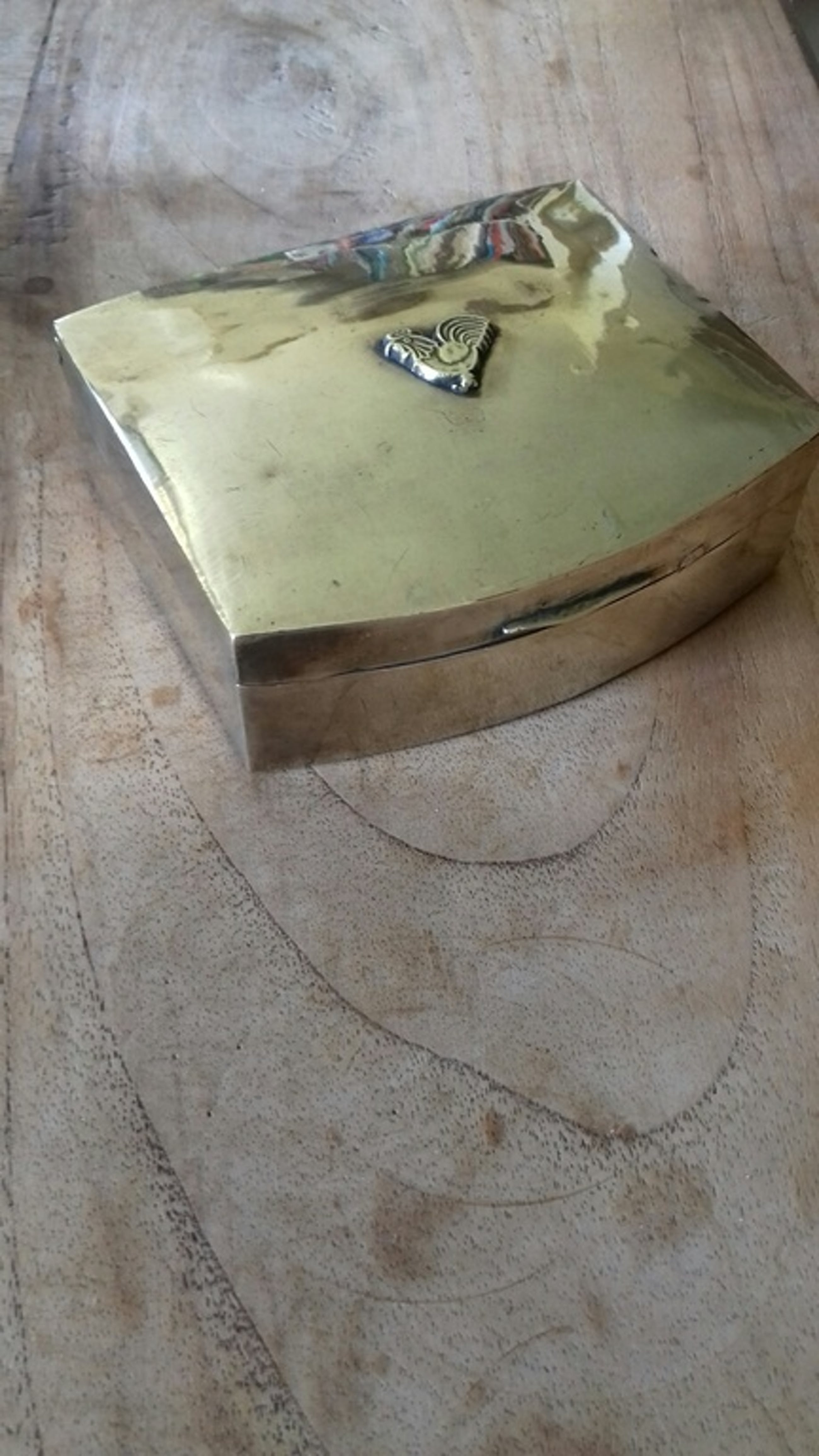 Mooi koperen snuifdoos met op de deksel een afbeelding van een haantje.