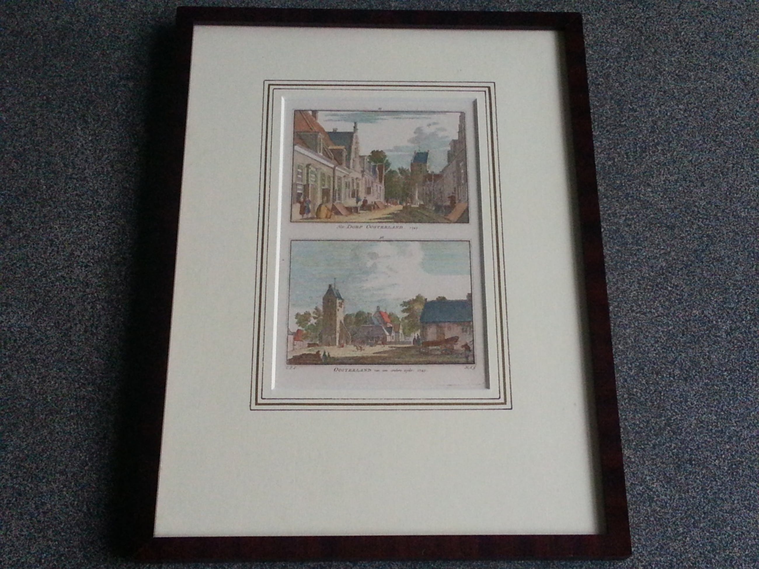 oude kopergravure: tekenaar, Cornelis Pronk, graveur, Hendrik Spilman. (handgekleurd) voorstelling: het dorp oosterland-oosterland van een andere zijde. 1745. gesigneerd llinksonder: C.P.F rechtsonder: H.S.F. deze gravure verkeert in perfecte staat met een notenhouten lijst en ophangmogelijkheid. afm totaal: 23 cm bij 30.5 cm. verzendkosten binnen nederland 6.75 euro.
