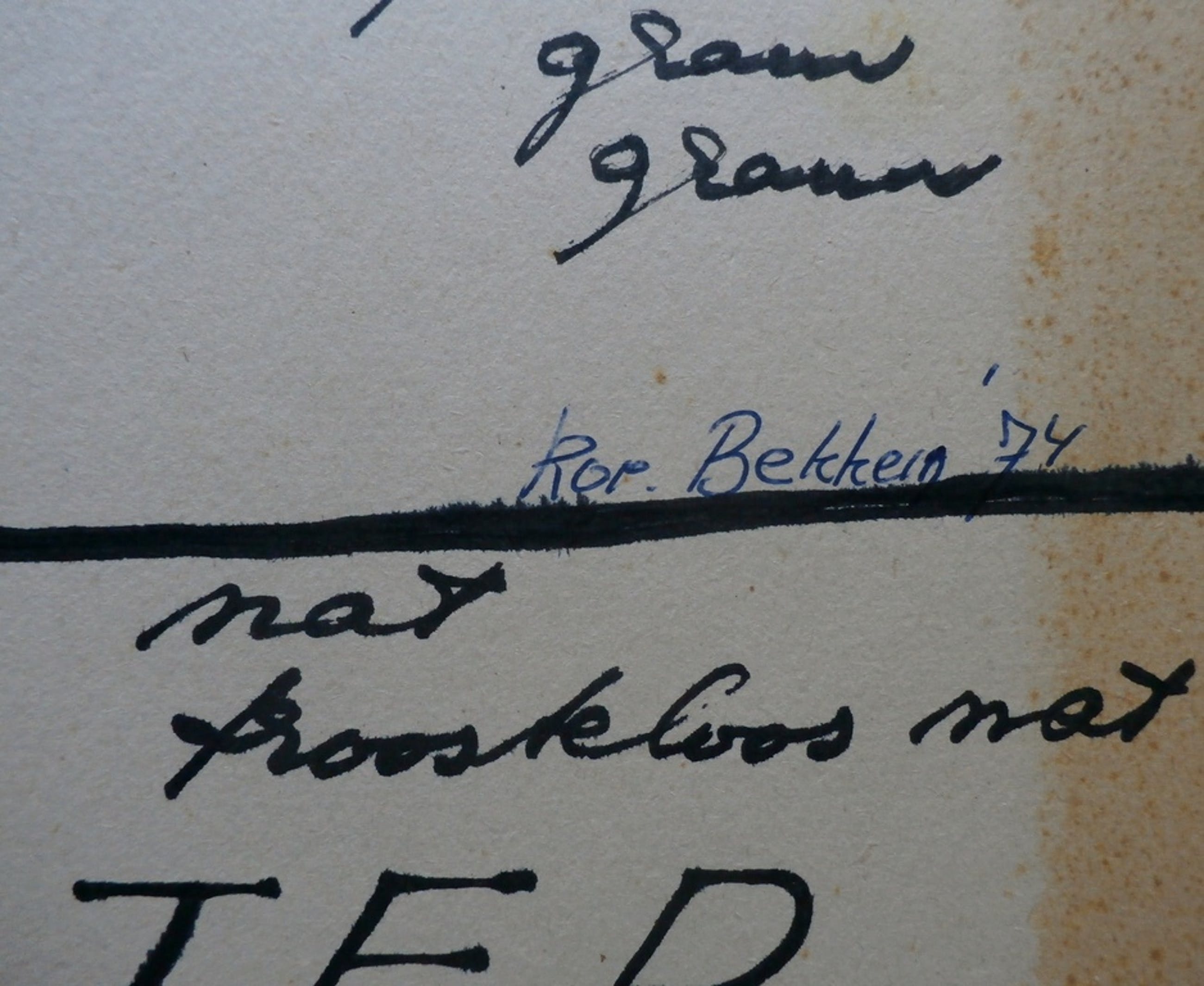 Stifttekening op karton van Kor Bekker uit 1974. Het werk is rechtsboven gesigneerd. Titel: watergras. Het werk lijkt geinspireerd op "de nul groep". Afmetingen blad: h50 x b40 cm. De authenticiteit van het aangeboden werk wordt voor 100% gegarandeerd. Een certificaat van echtheid kan, op aanvraag, worden meegestuurd. Conditie: in redelijke staat. De randen zijn vergeeld. In het werk zitten ook wat bruine plekjes.