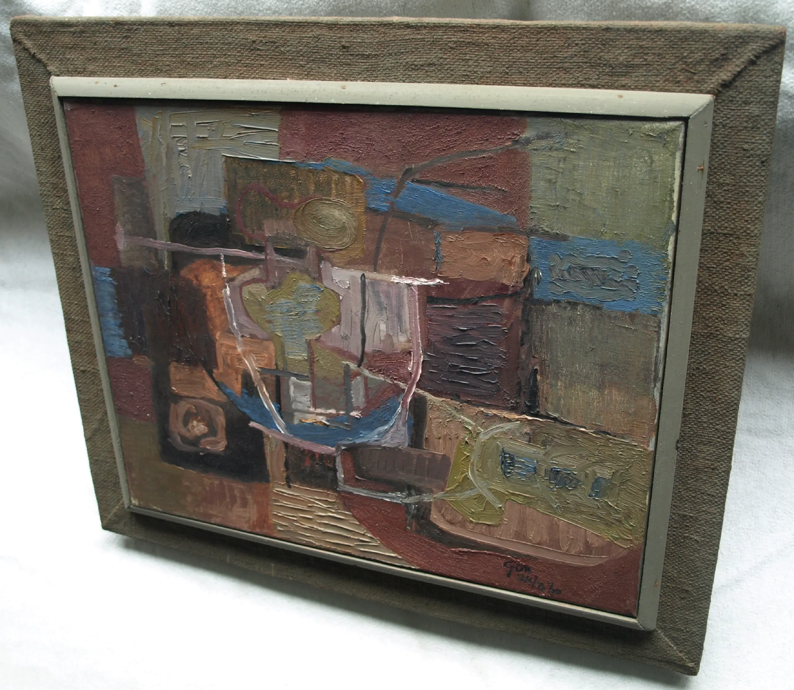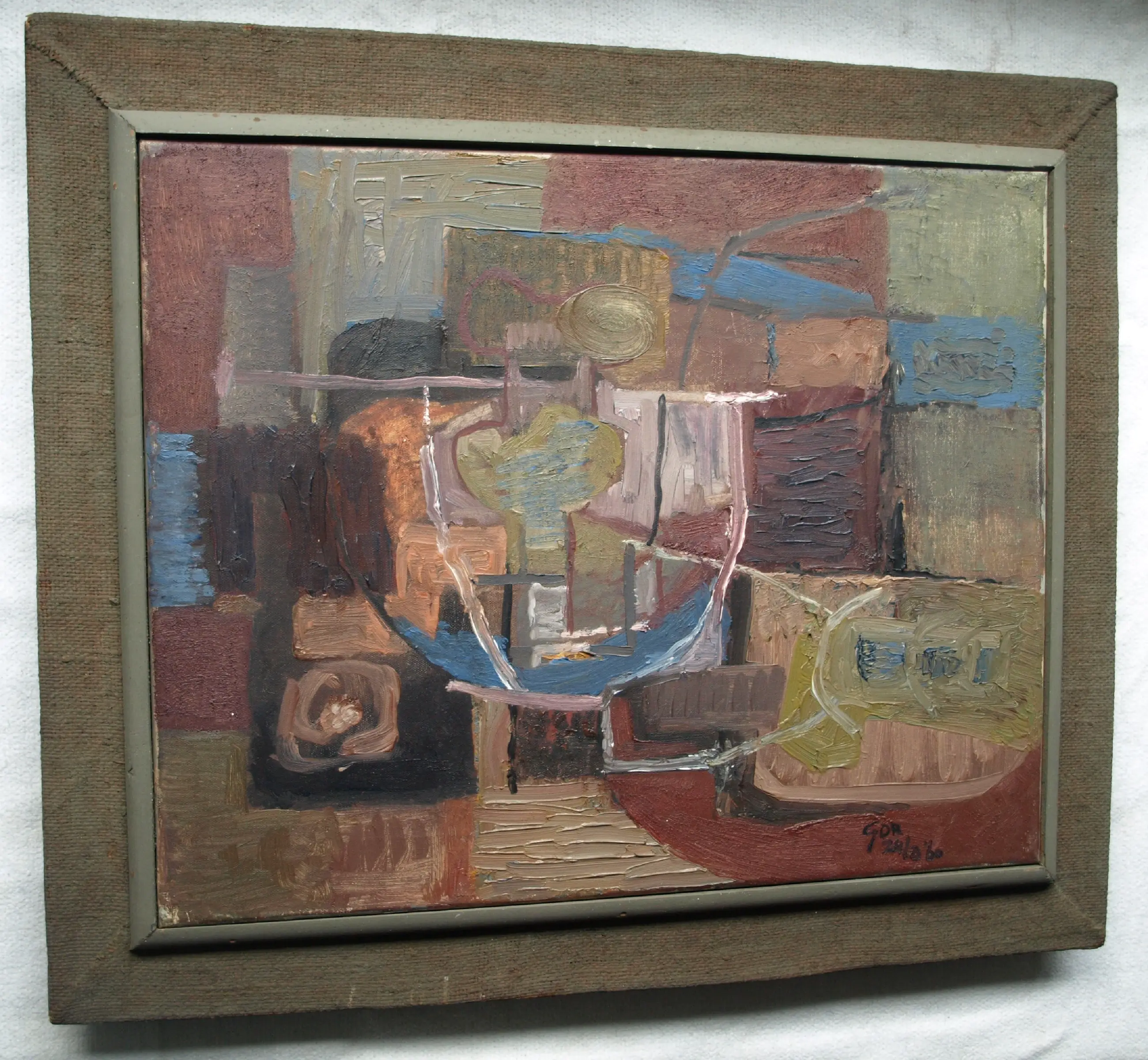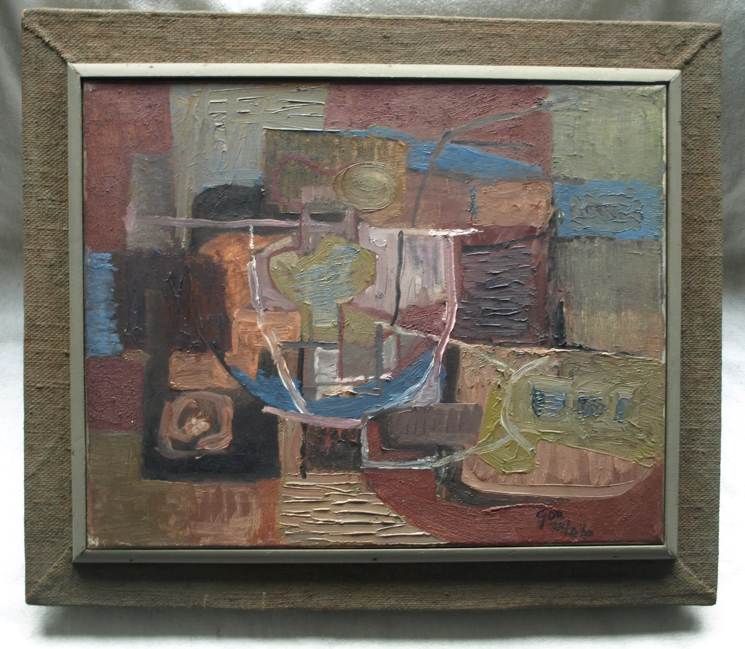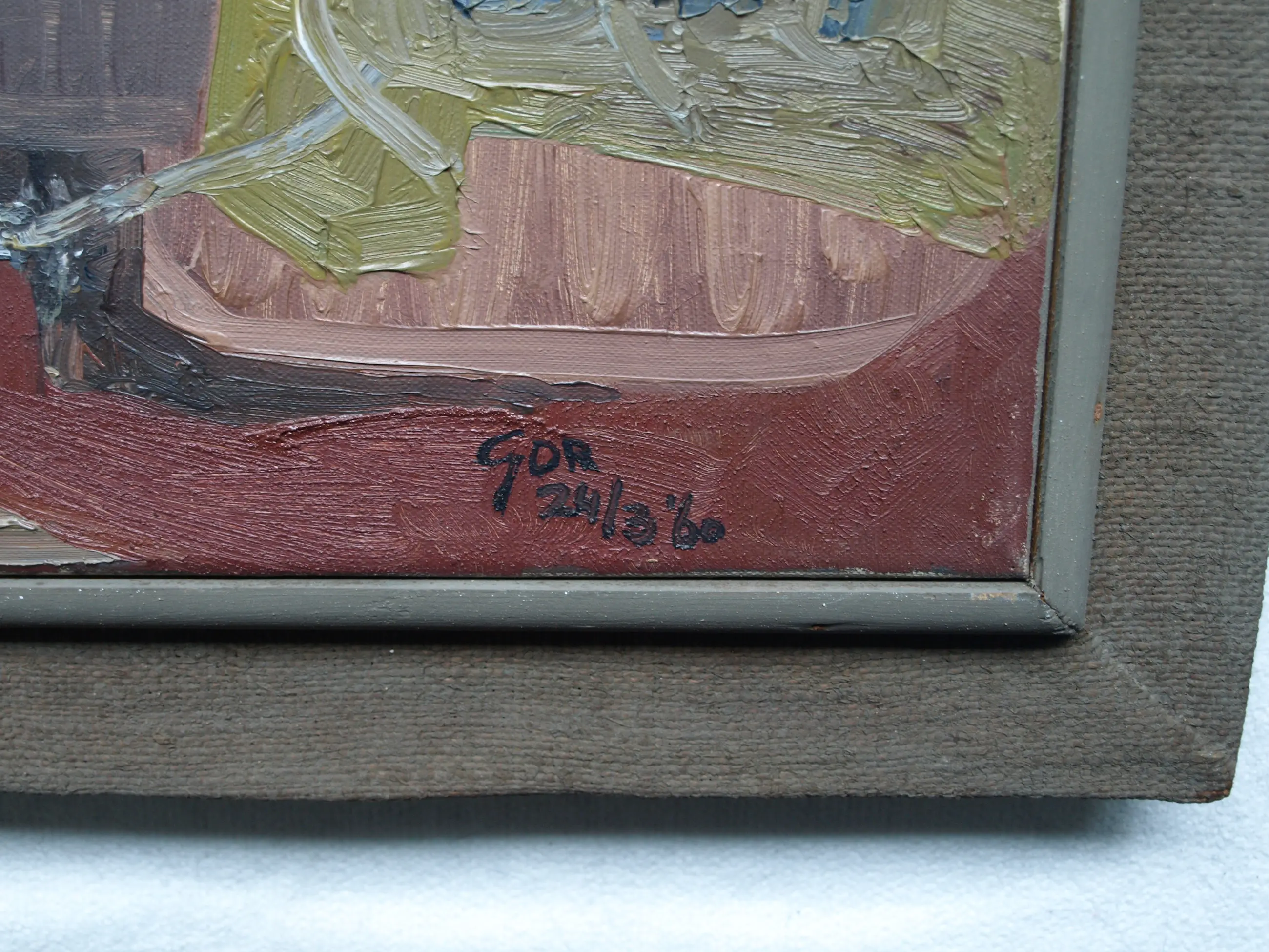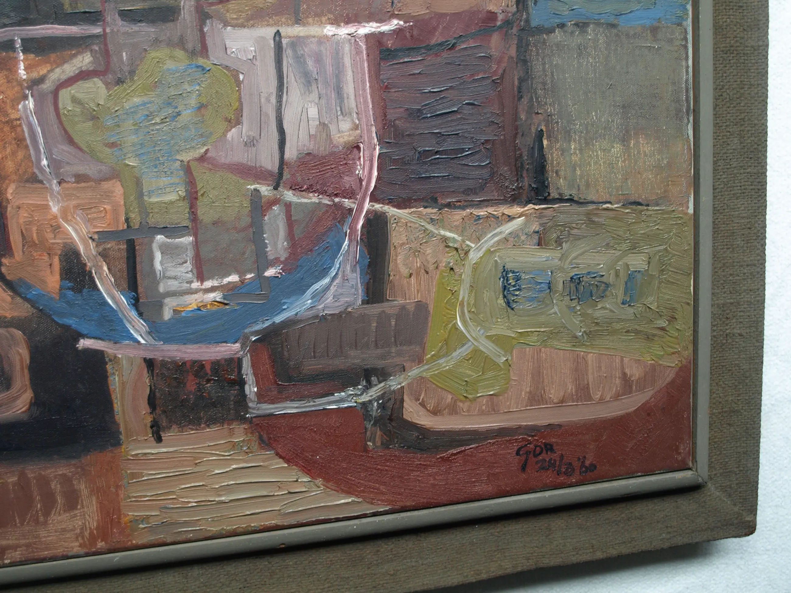 Een schilderij uit 1960 van de Nederlandse kunstenaar Kor Heemsbergen (1936-2005). -Gesigneerd en gedateerd (24-3-1960) rechtsonder. -Door de kunstenaar ingelijst in een ‘dubbele’ houten lijst met linnen buitenrand. Afmetingen: Lijst, 52 x 61 x 6 cm. Beeld, 40 x 50 cm. -Herkomst: Uit een inboedel met meerdere werken van deze kunstenaar. Conditie: In goede staat met ouderdomssporen. Zie ook de foto’s voor een eigen indruk.