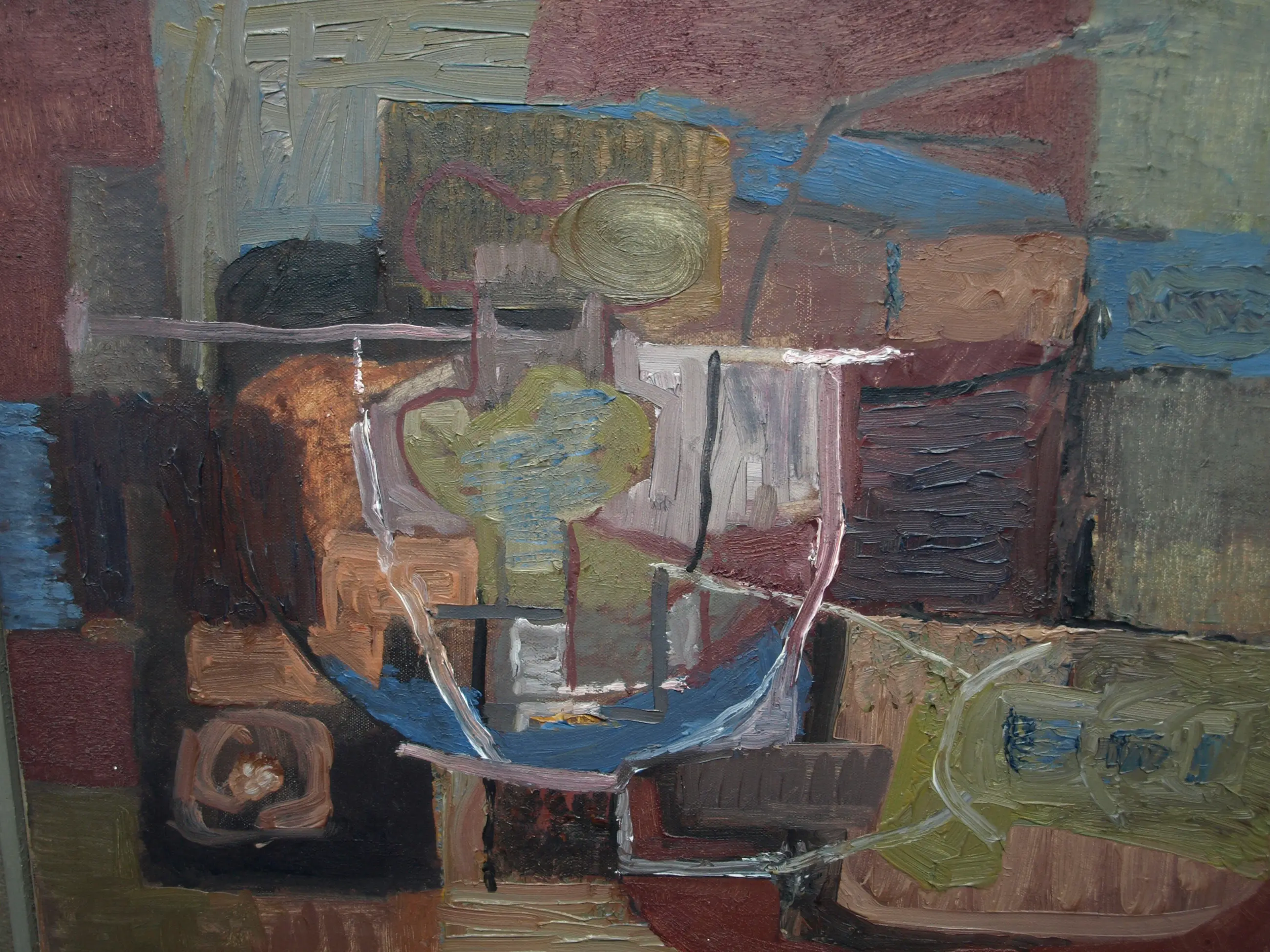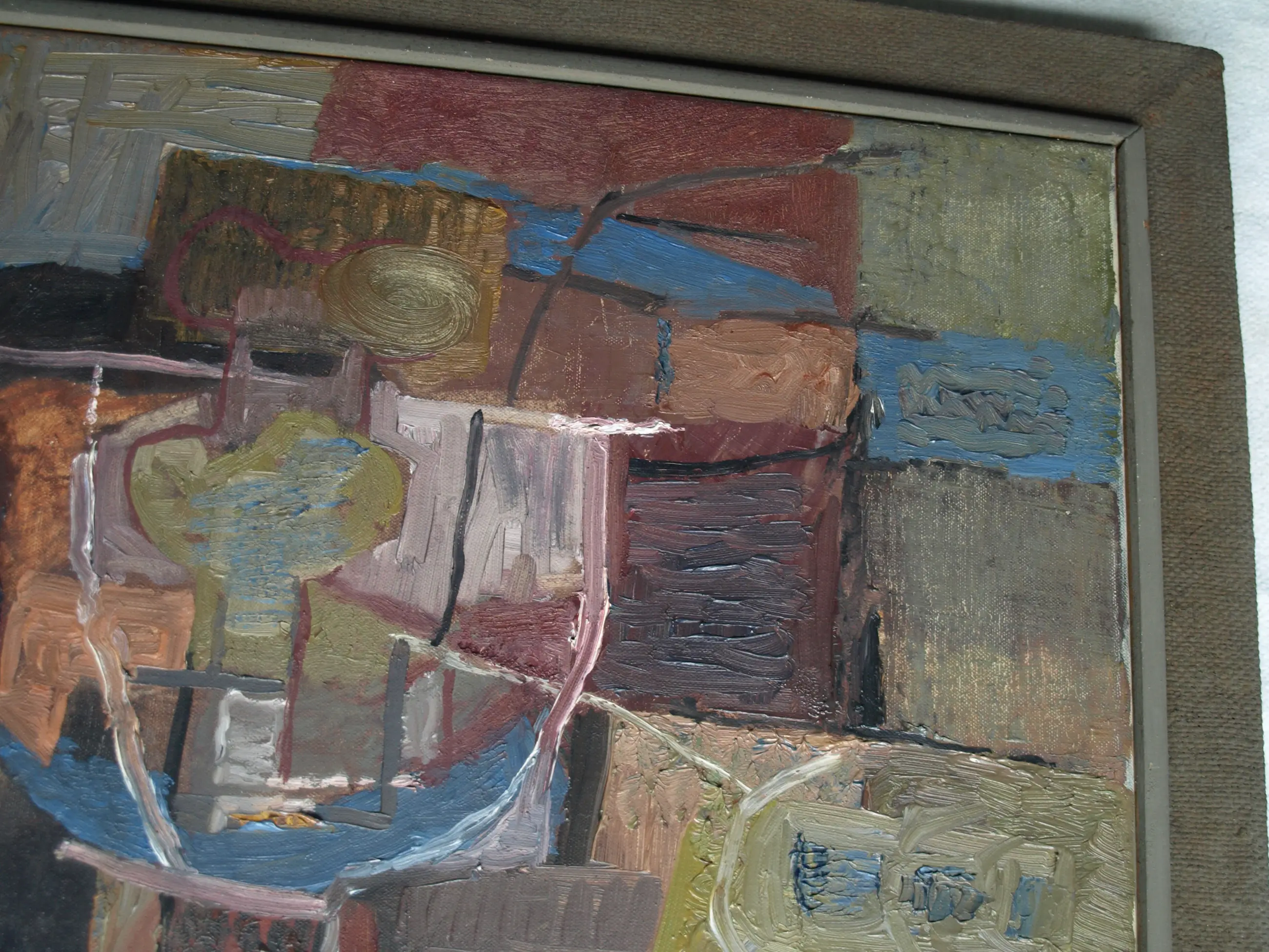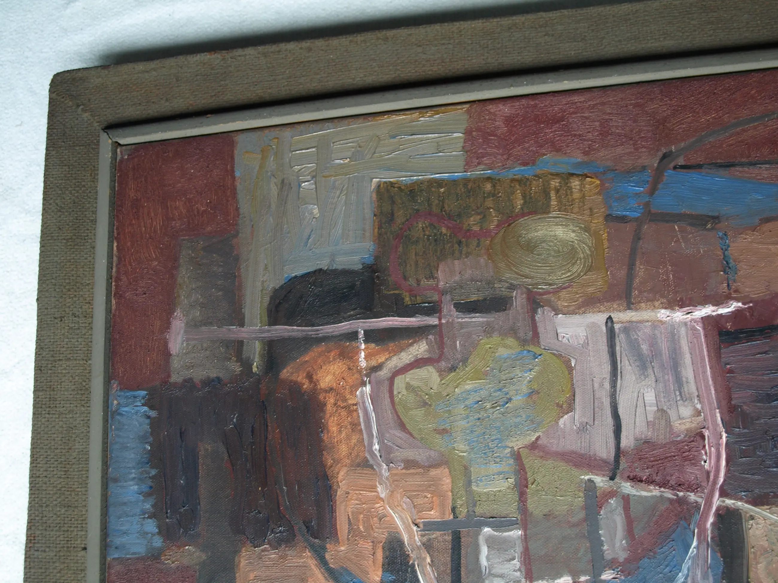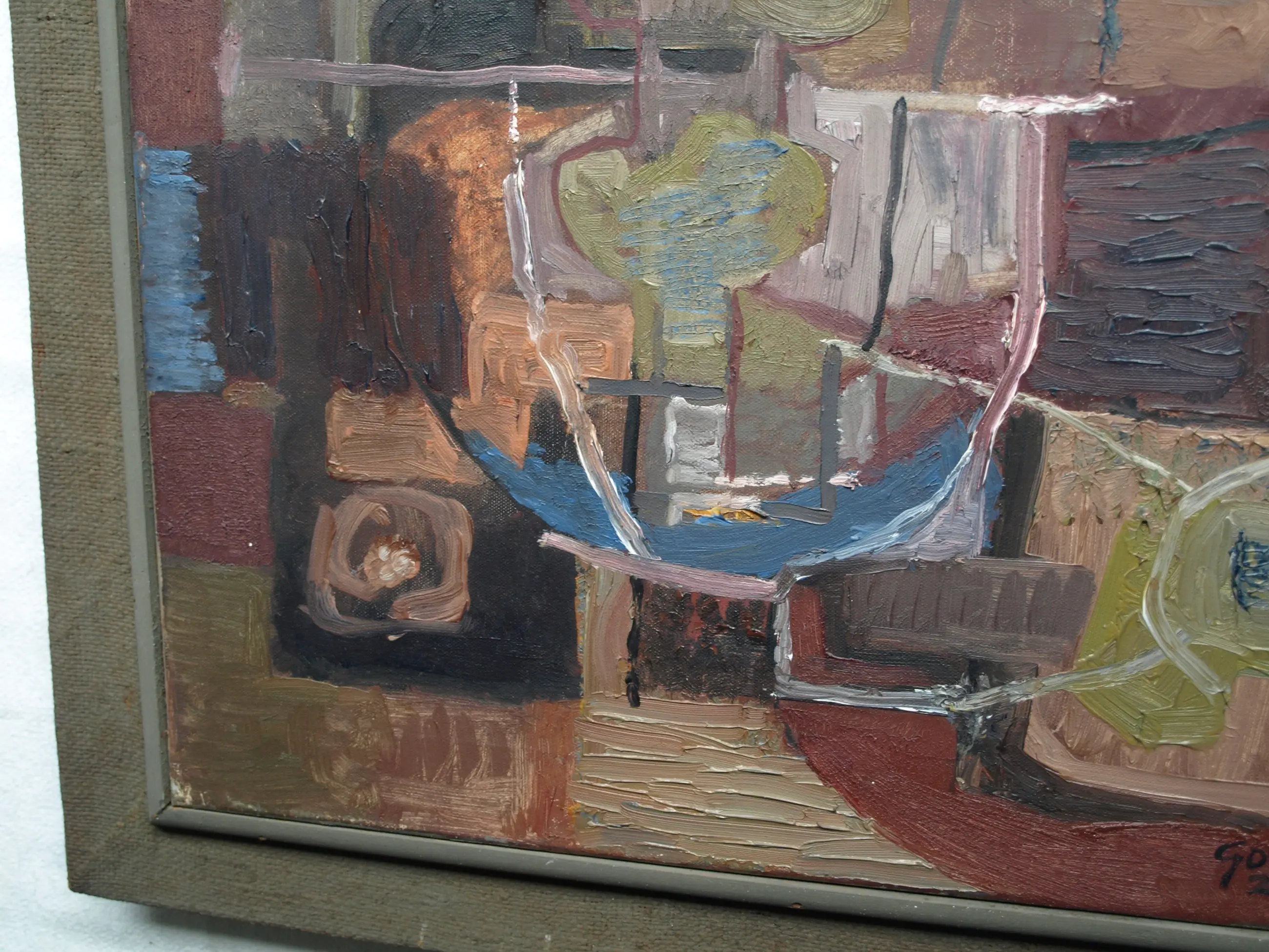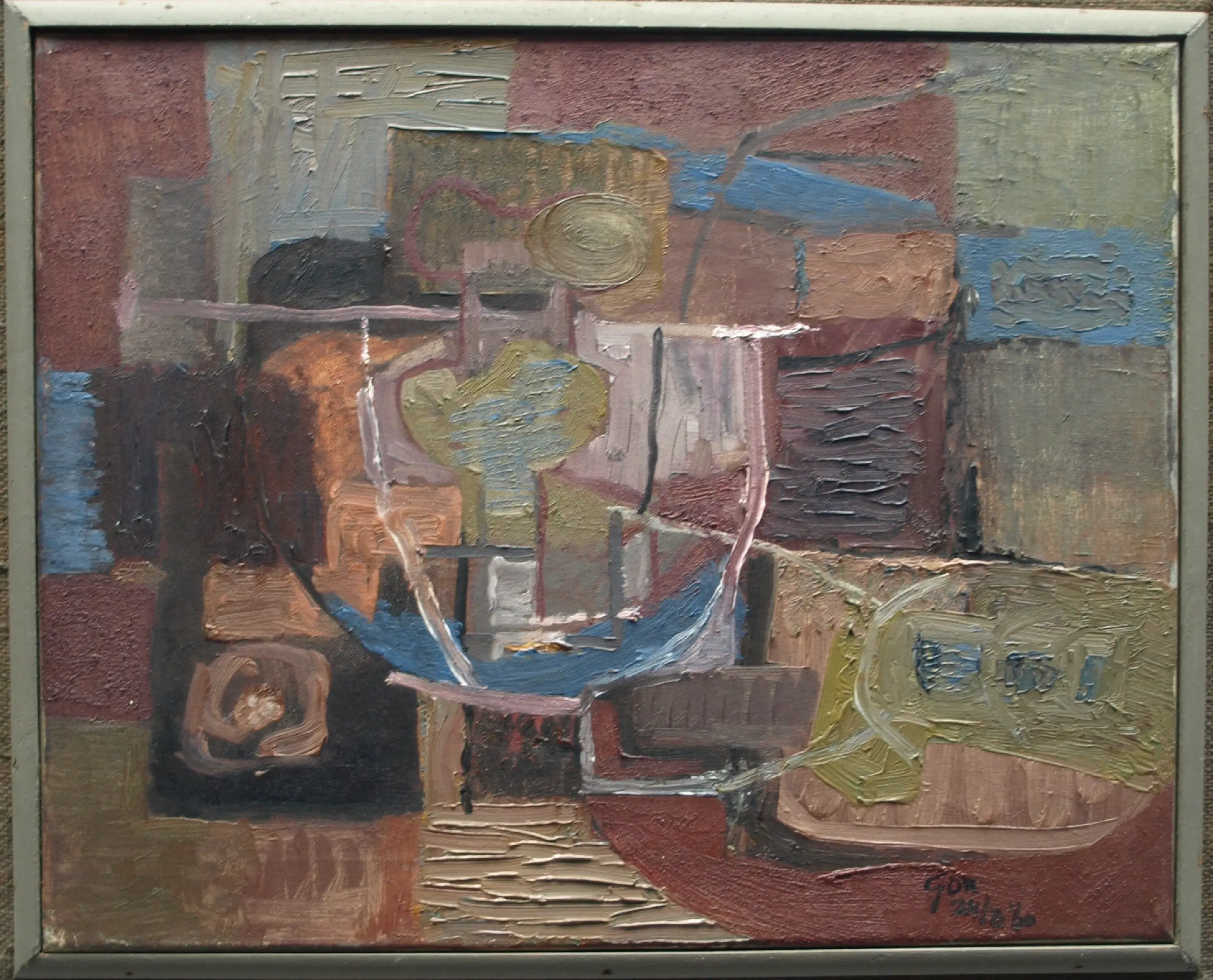 Een schilderij uit 1960 van de Nederlandse kunstenaar Kor Heemsbergen (1936-2005). -Gesigneerd en gedateerd (24-3-1960) rechtsonder. -Door de kunstenaar ingelijst in een ‘dubbele’ houten lijst met linnen buitenrand. Afmetingen: Lijst, 52 x 61 x 6 cm. Beeld, 40 x 50 cm. -Herkomst: Uit een inboedel met meerdere werken van deze kunstenaar. Conditie: In goede staat met ouderdomssporen. Zie ook de foto’s voor een eigen indruk.