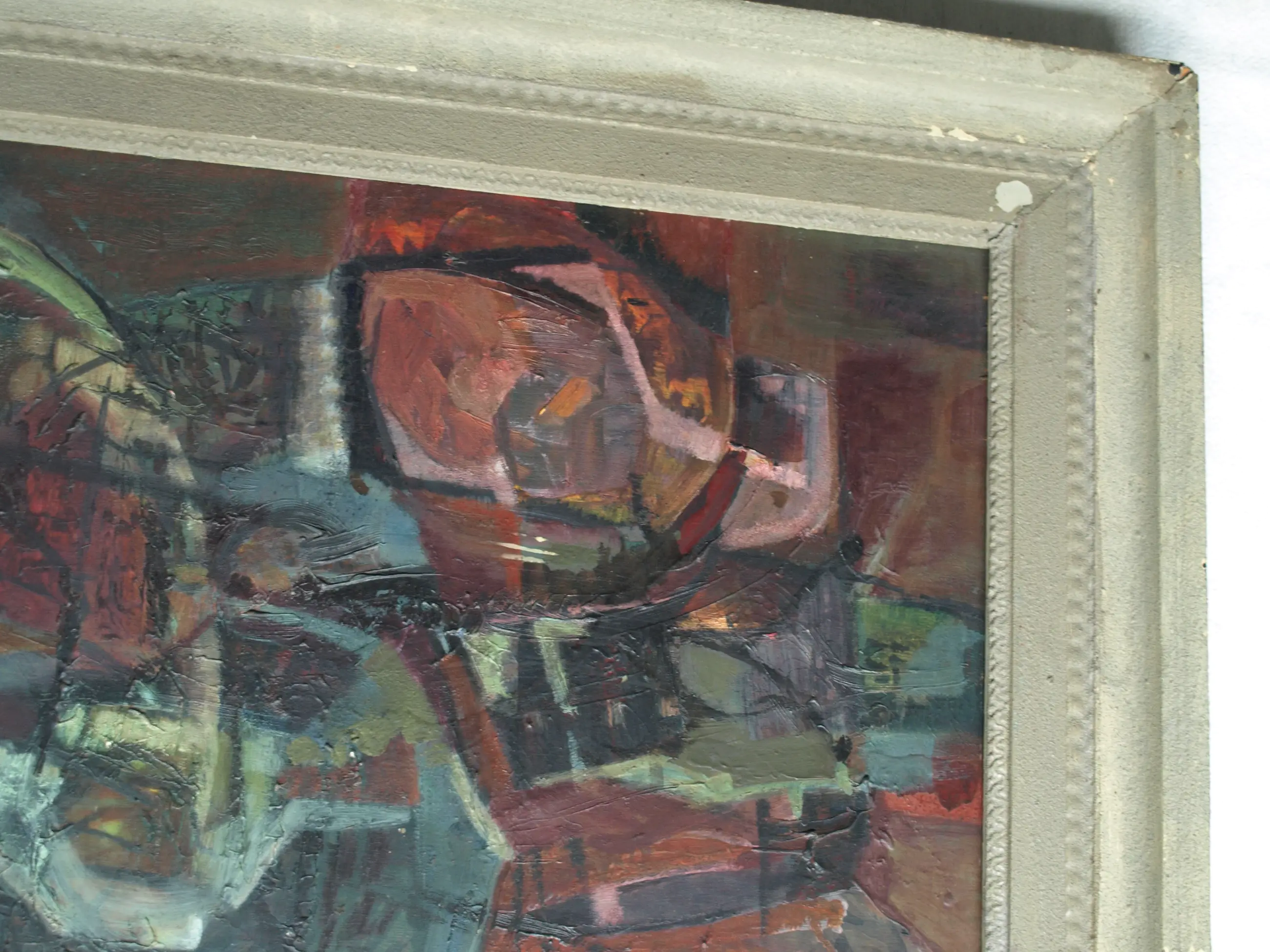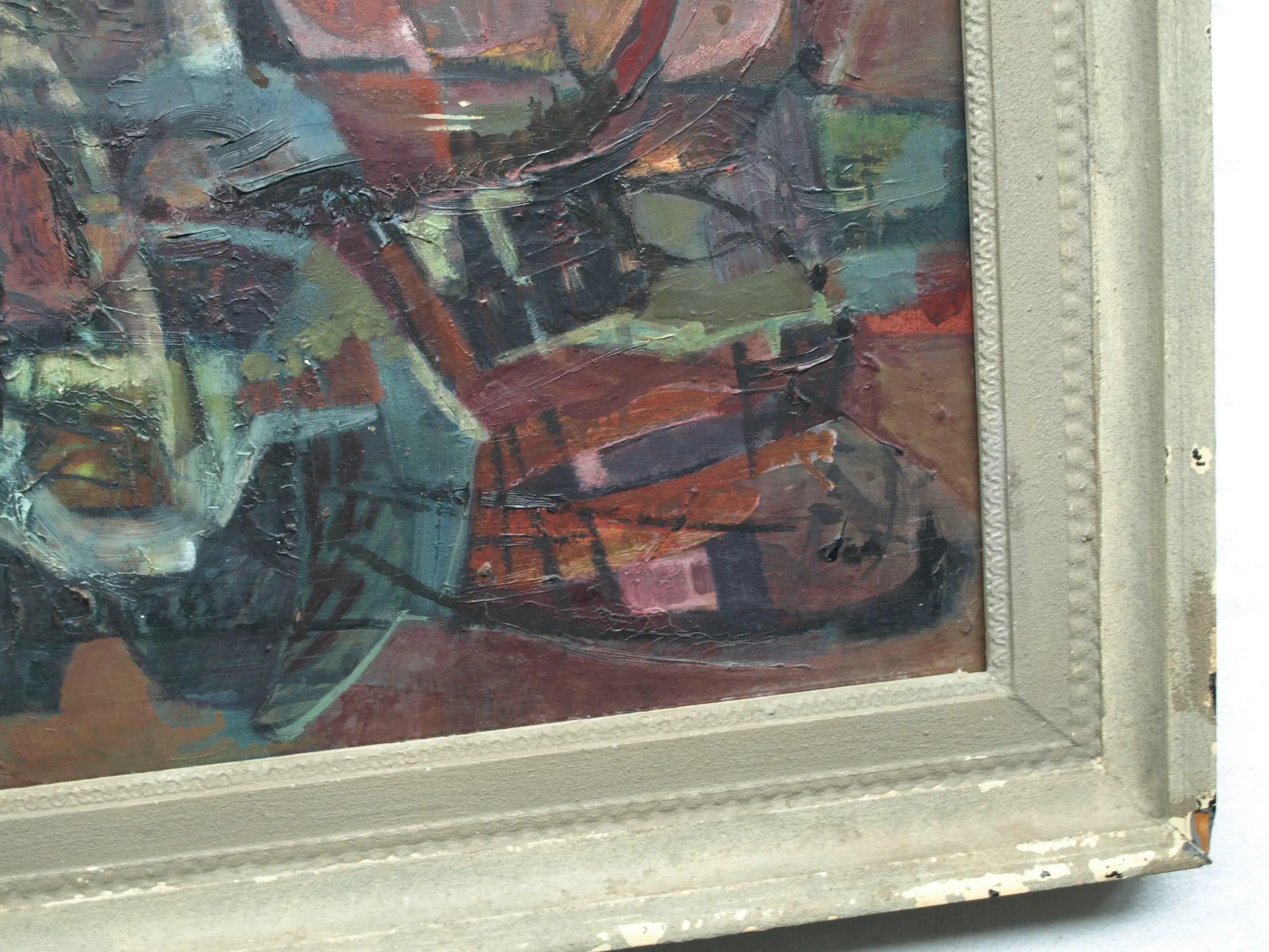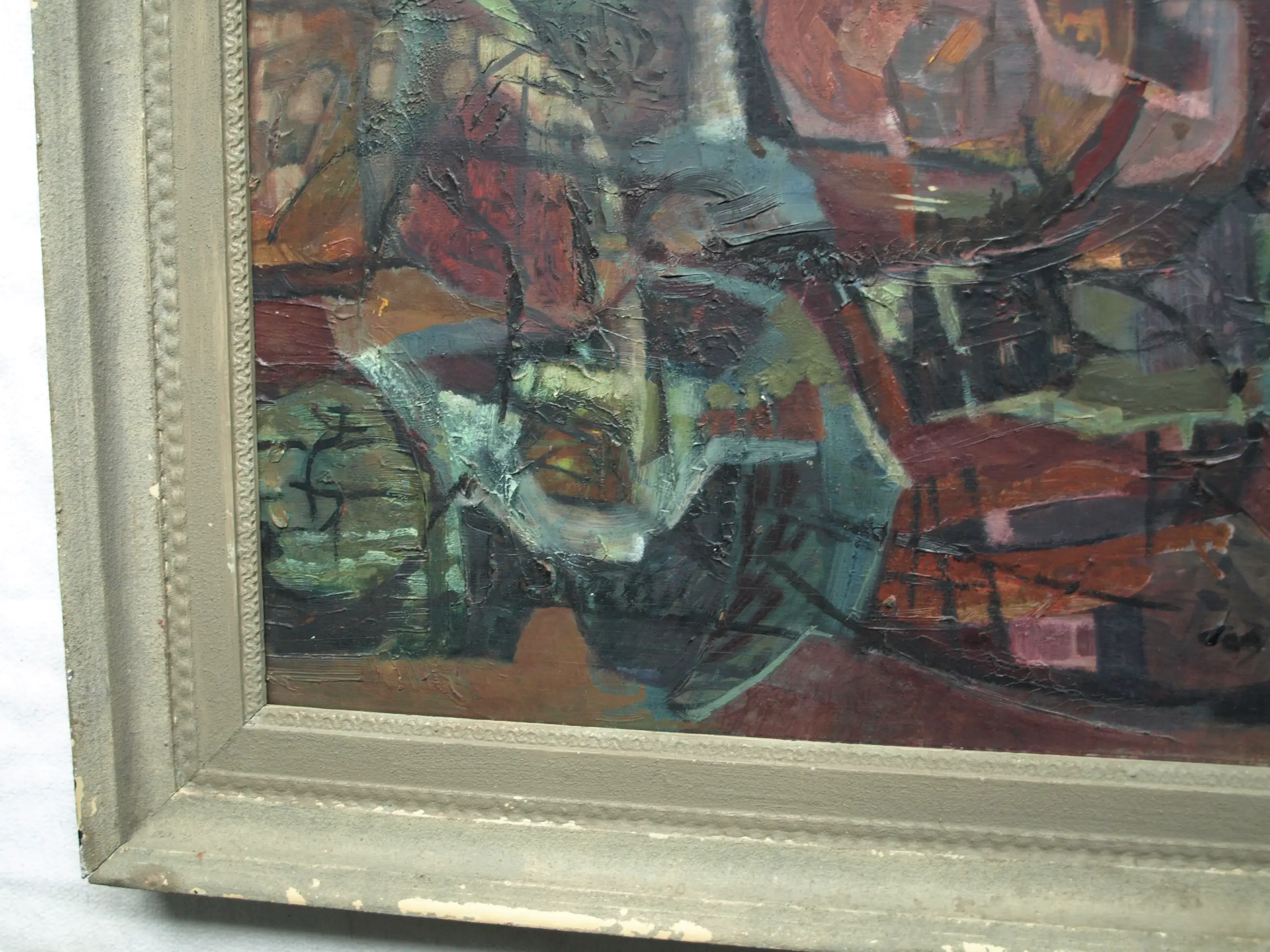 In goede staat met ouderdomssporen (slijtplekjes en oppervlaktevuil). De lijst heeft slijtplekken en beschadigingen. Zie ook de foto’s voor een eigen indruk.