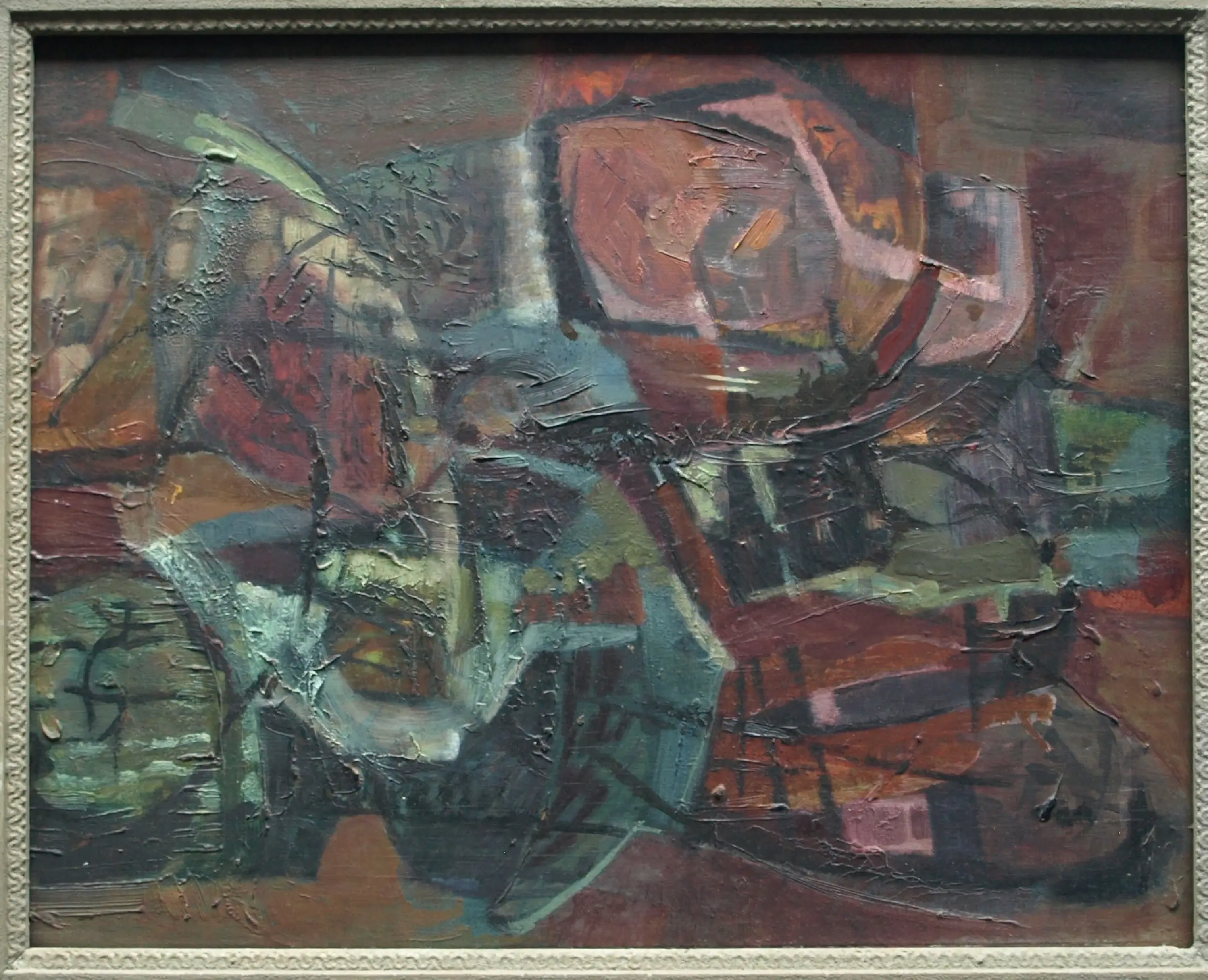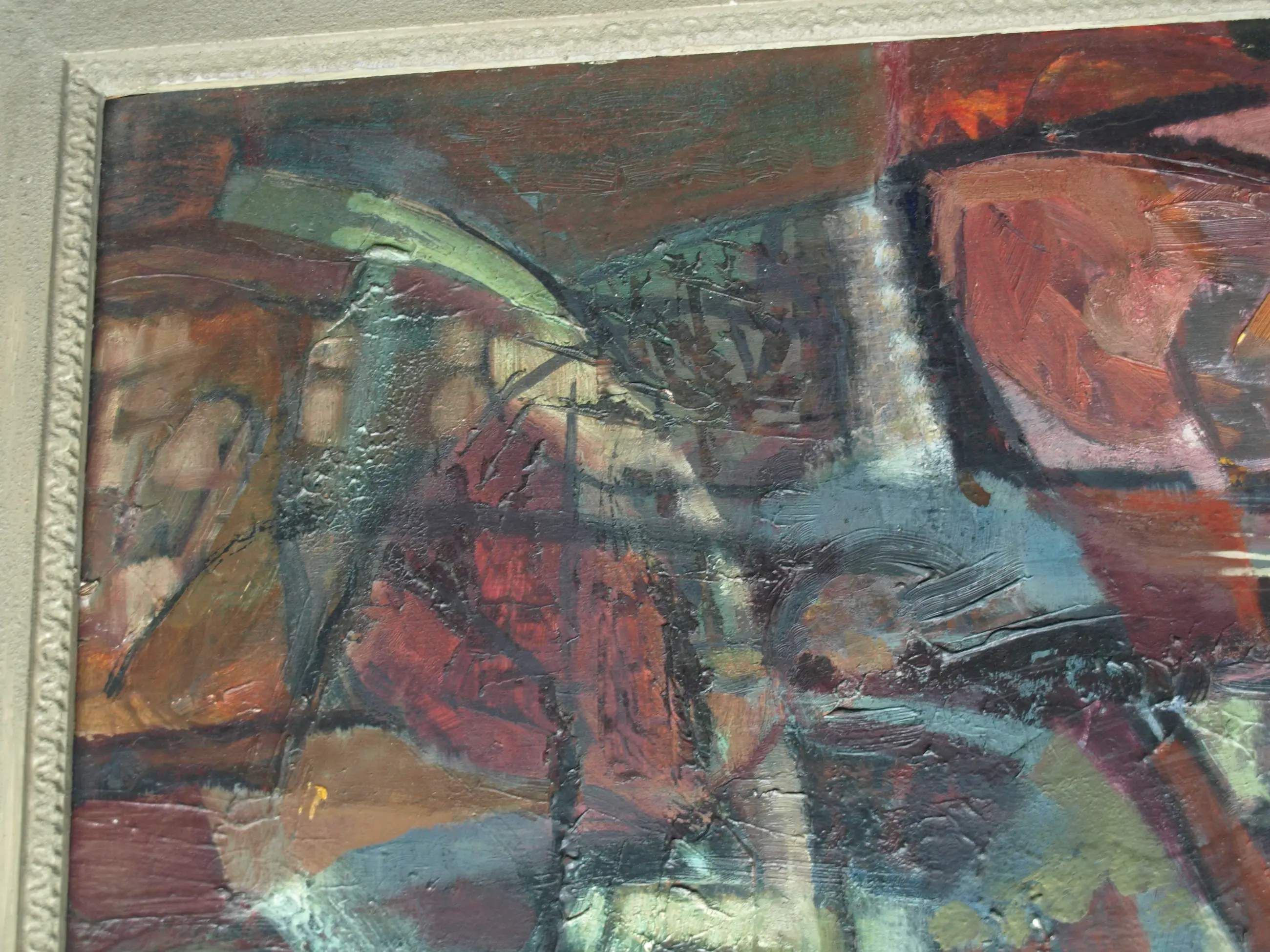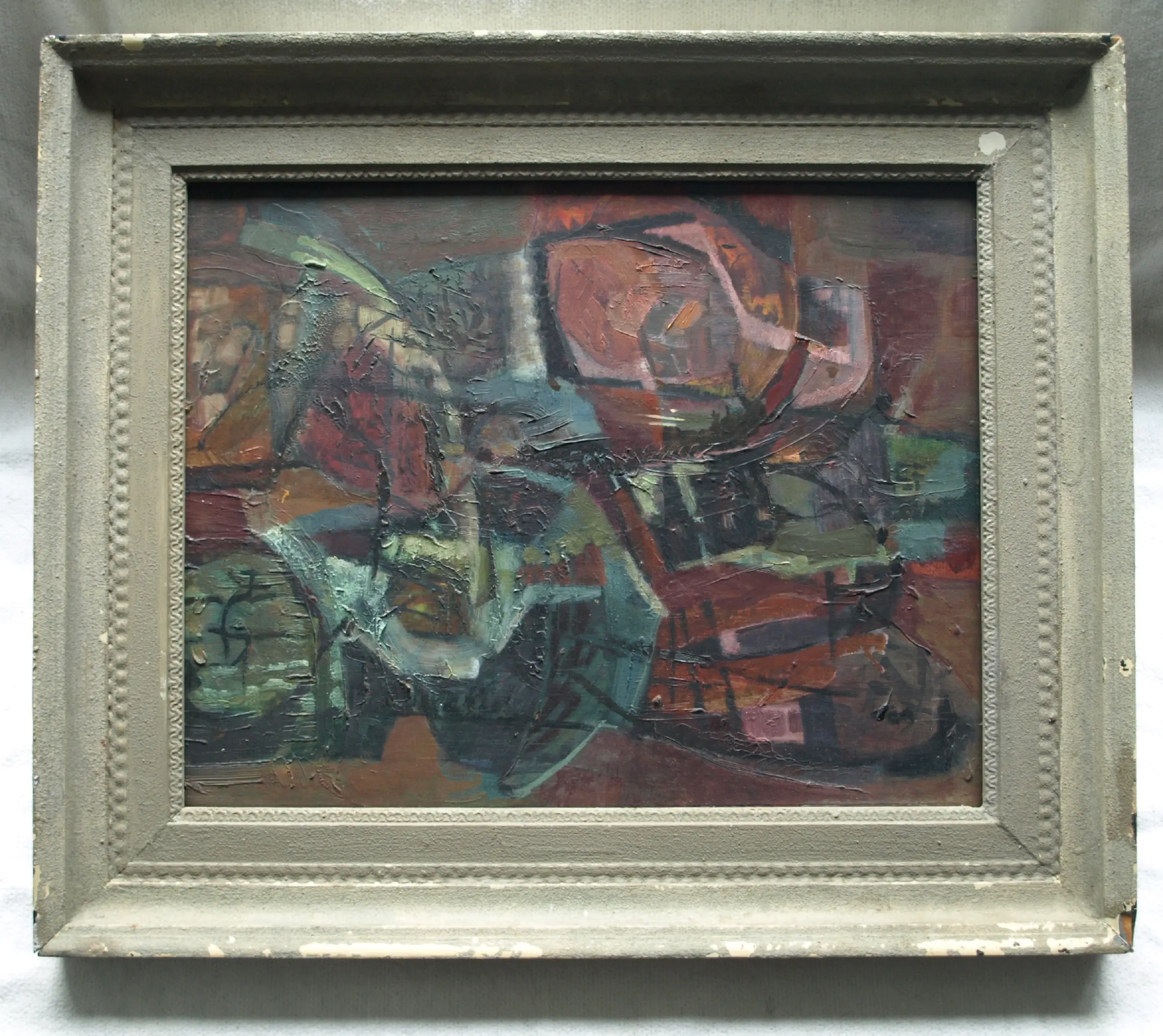 Een schilderij uit ca. 1960 van de Nederlandse kunstenaar Kor Heemsbergen (1936-2005). -Ongesigneerd, maar met naamsvermelding op een sticker op de achterkant van de lijst. De oorspronkelijke prijs was F 400,-. -Ingelijst in de originele houten lijst. Afmetingen: Lijst, 53 x 63 x 4,5 cm. Paneel. 38 x 49 cm. Beeld, 37,5 x 47,5 cm. -Herkomst: Uit een inboedel met meerdere werken van deze kunstenaar. Conditie: In goede staat met ouderdomssporen (slijtplekjes en oppervlaktevuil). De lijst heeft slijtplekken en beschadigingen. Zie ook de foto’s voor een eigen indruk.