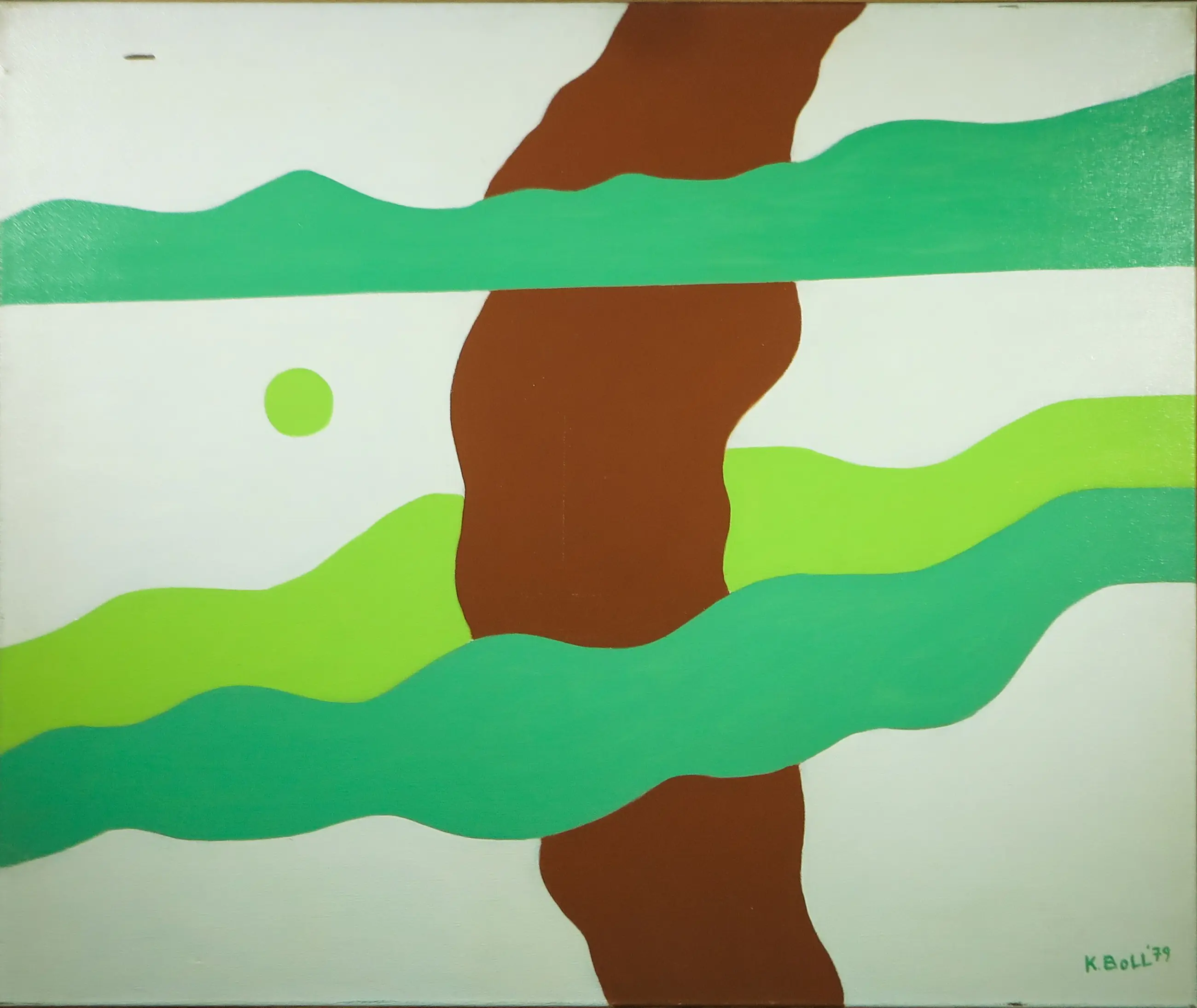 Jugendstill V (1979) van Kornelis Boll is een modern en minimalistisch landschap, uitgevoerd in olieverf. Het werk kenmerkt zich door een verstilde compositie waarin vormen zijn teruggebracht tot hun essentie. Met een psychedelisch kleurenpalet met felle kleurvlakken roept Boll een bijna meditatieve sfeer op. De subtiele overgangen en het spaarzame gebruik van detail geven het schilderij een tijdloos en contemplatief karakter.