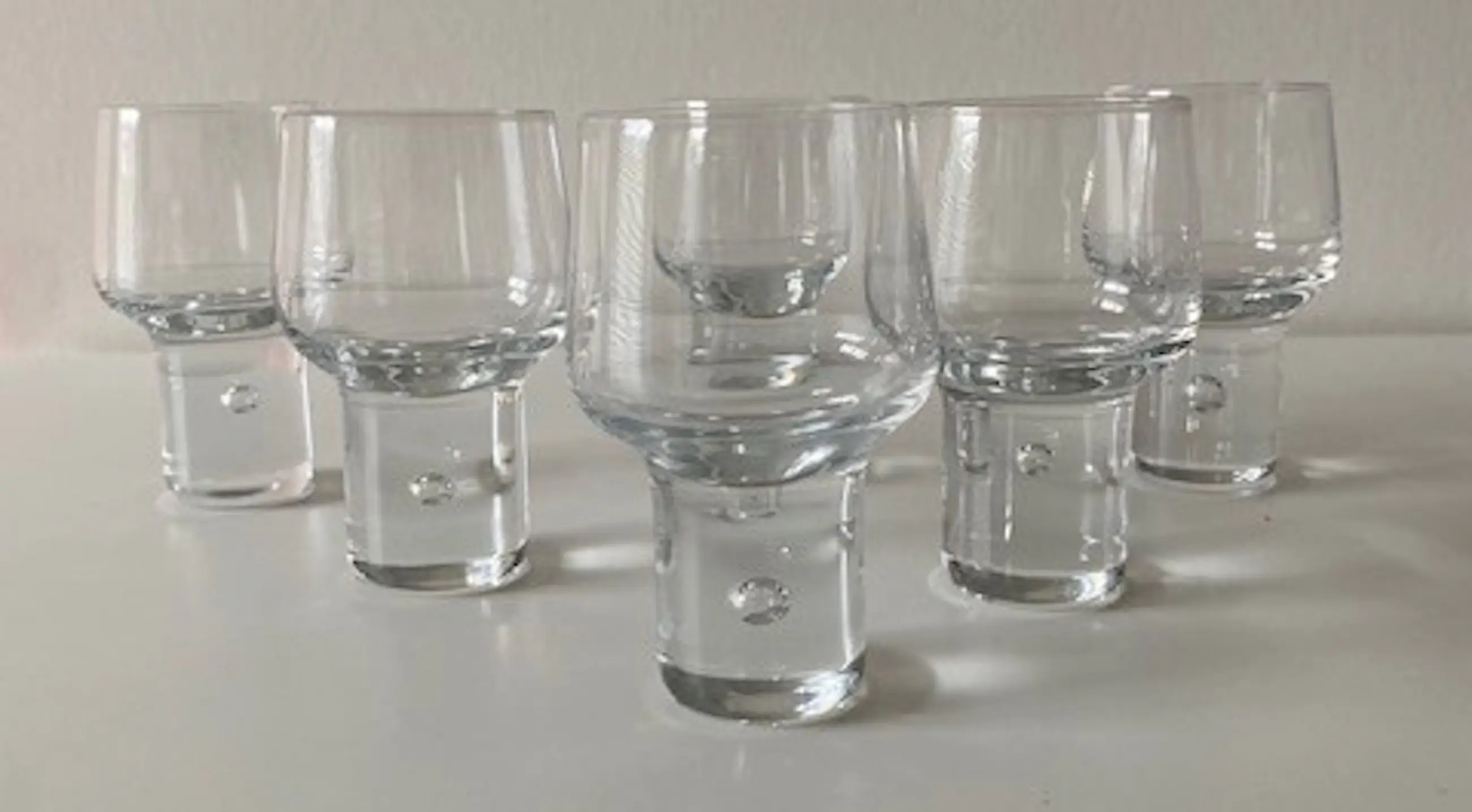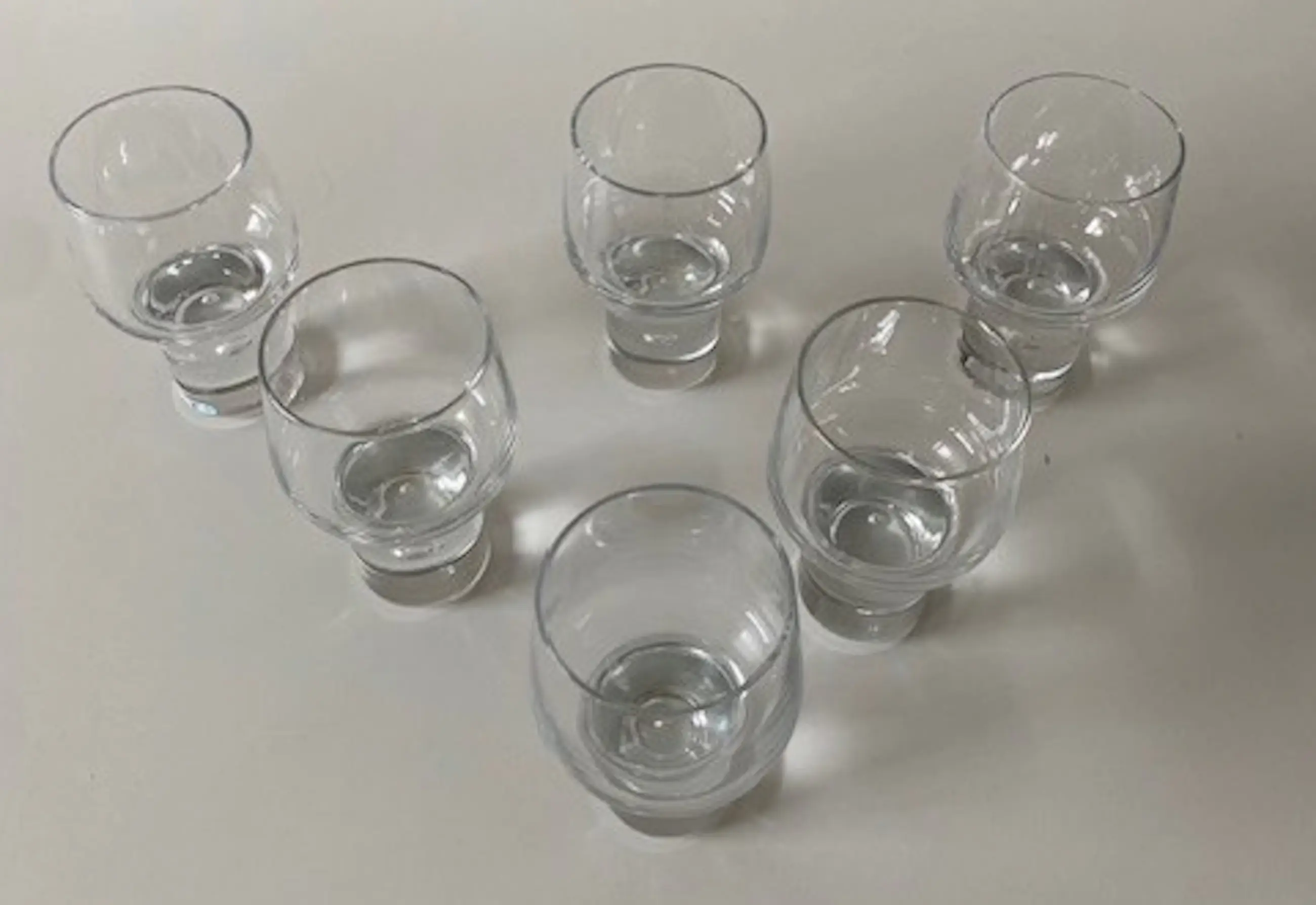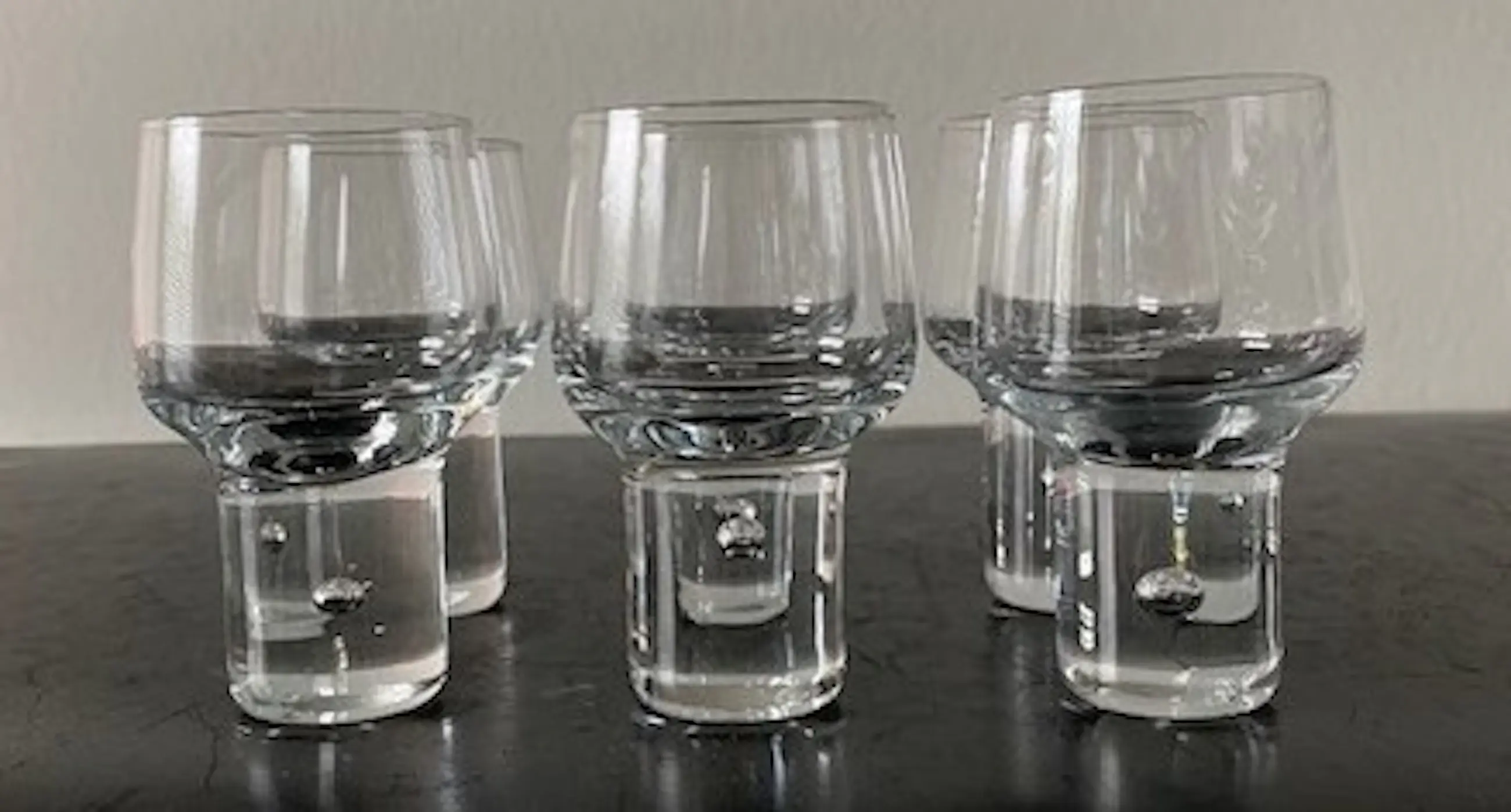 6 stijlvolle midcentury sherryglazen "Mambo" (stam met luchtbel) Ontwerp Vicke Lindstrand 1960's Uitvoering Kosta Sweden Handcrafted waardoor luchtbel verschillend qua positie, vorm en grootte. Fraaie glazen. Enkel glas is gebruikt. Hoogte 9 cm; diameter top 4,5 cm.