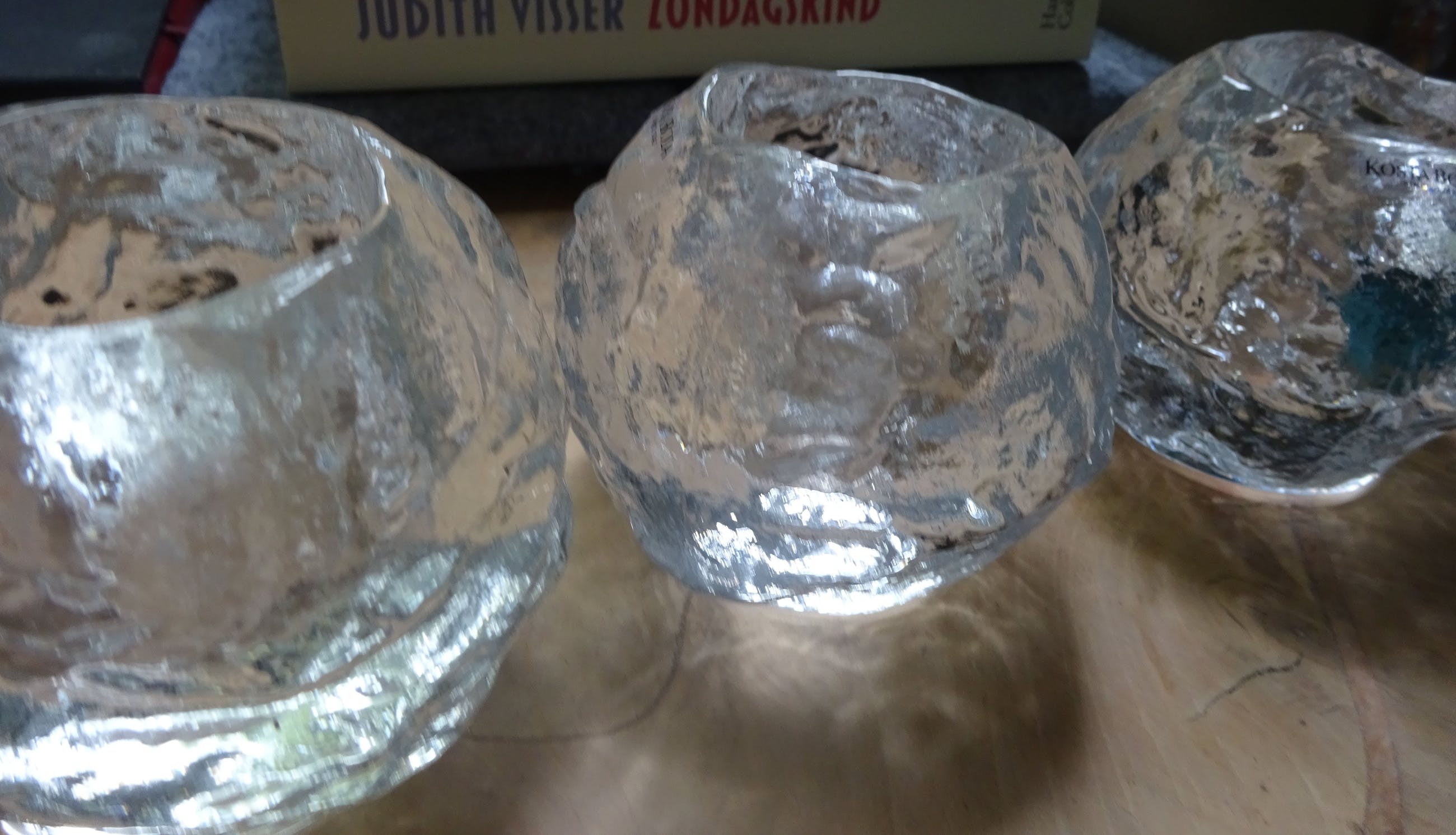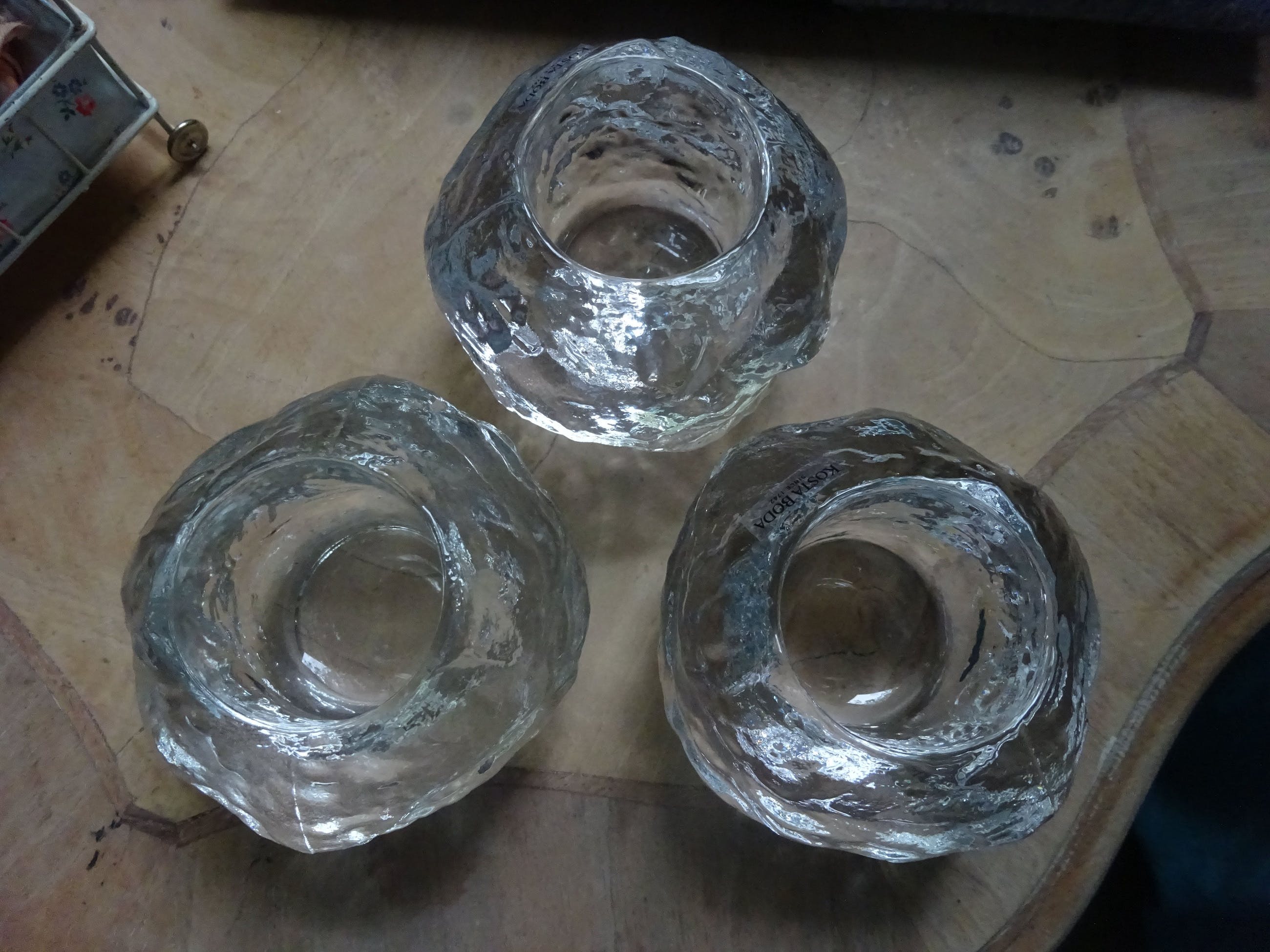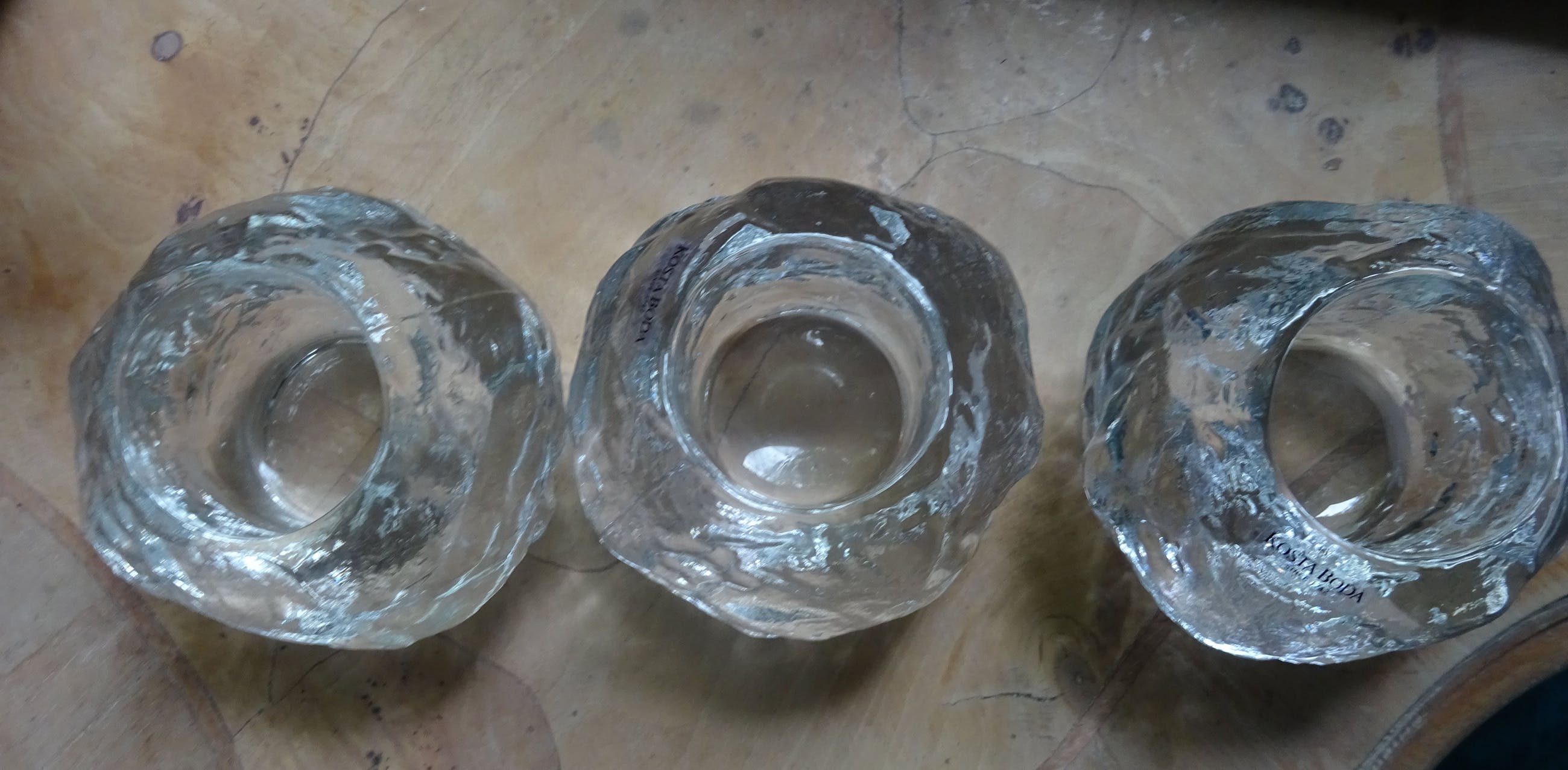 Een snowball-sneeuwbal als waxine lichtje Ontwerp: Ann Wärff Jaar: 1973 Uitvoering: Kosta Boda Sticker: Kosta Boda op een van de ballen Land: Zweden Diameter: 9 cm Aantal: 3 x Conditie: nieuwstaat