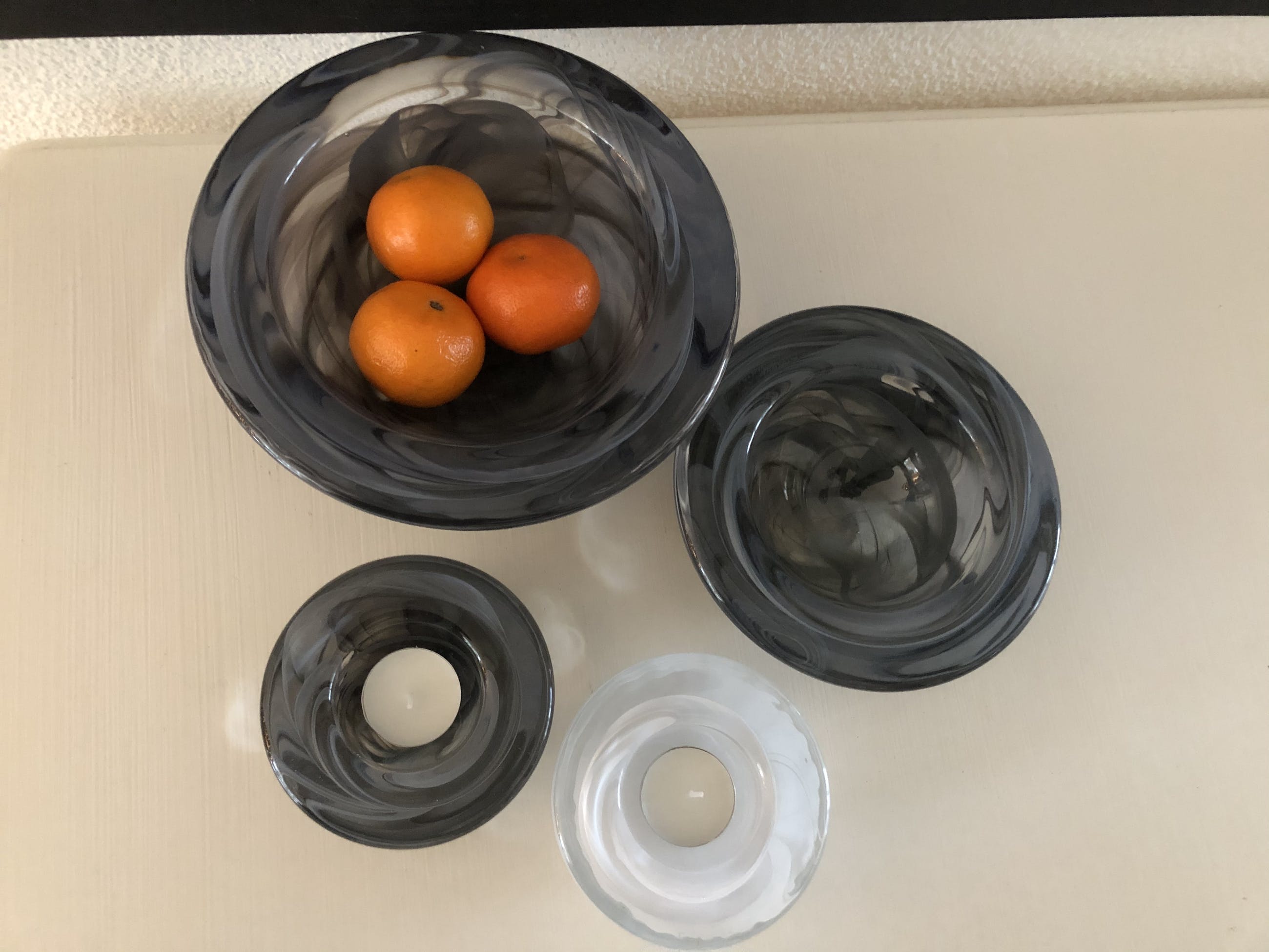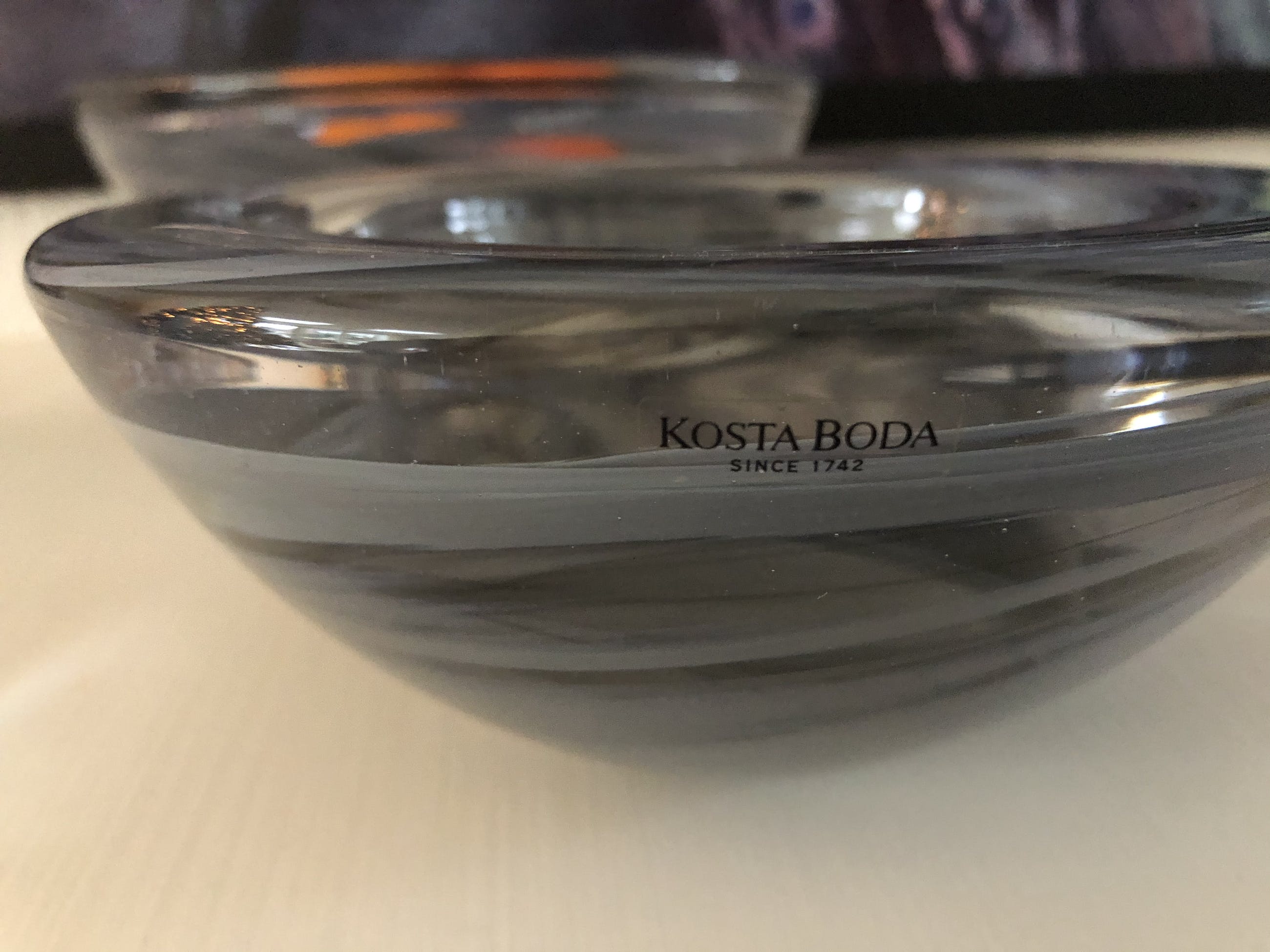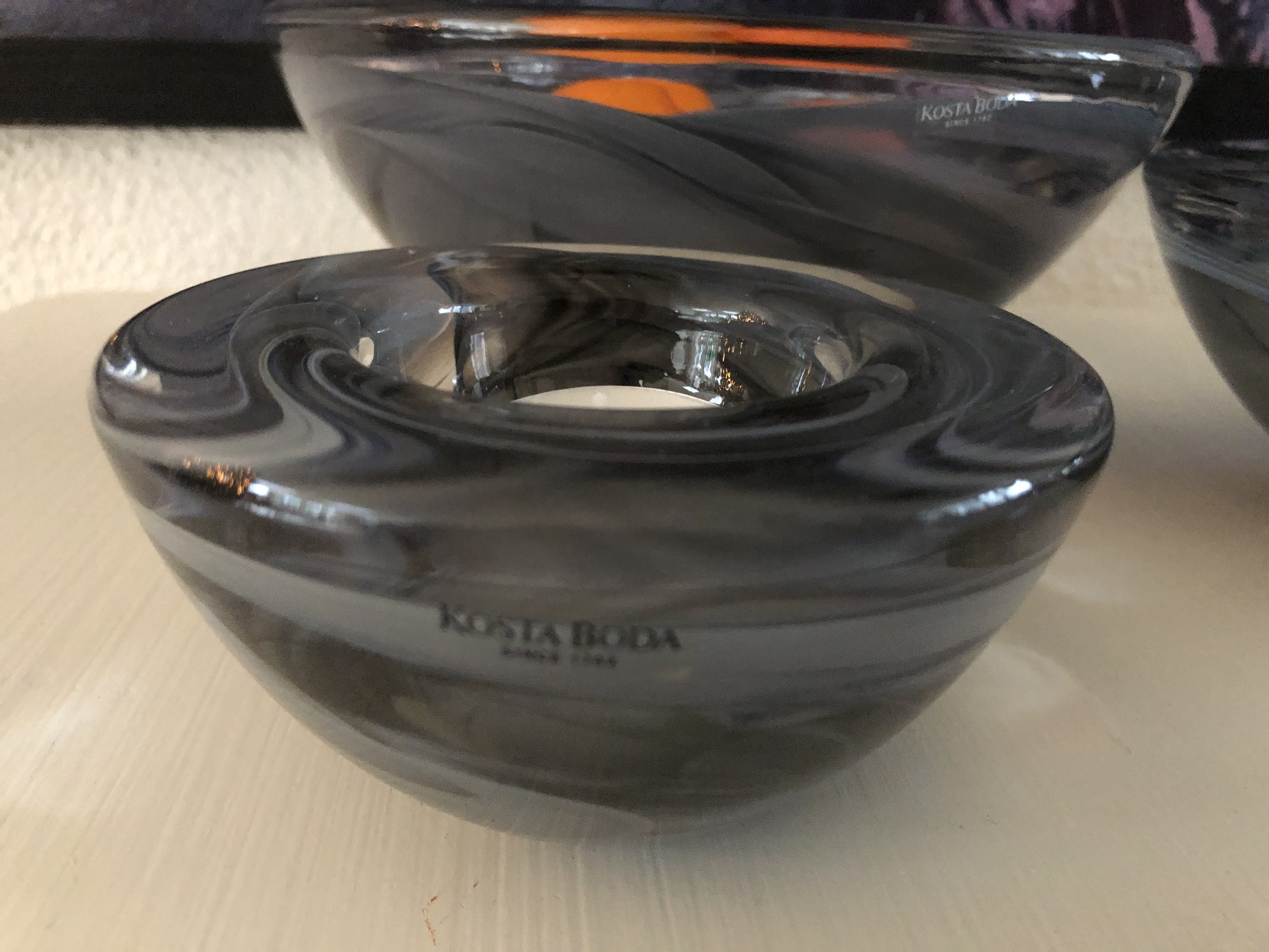 2 Prachtige schalen en 2 theelichthouders van Kosta Boda . De ontwerpster is Anna Ehrner uit Zweden. De set van 3 is gemerkt aan de onderzijde , alle 4 zijn voorzien van het Kosta Boda label. Grootste schaal: H 9 cm Doorsnede: 22 cm Gewicht : 3849 gr Middelste: H: 7 cm Doorsnede: 17 cm Gewicht : 1965 gr Kleinste: H: 6 cm Doorsnede; 11,5 cm Gewicht : 896 gr