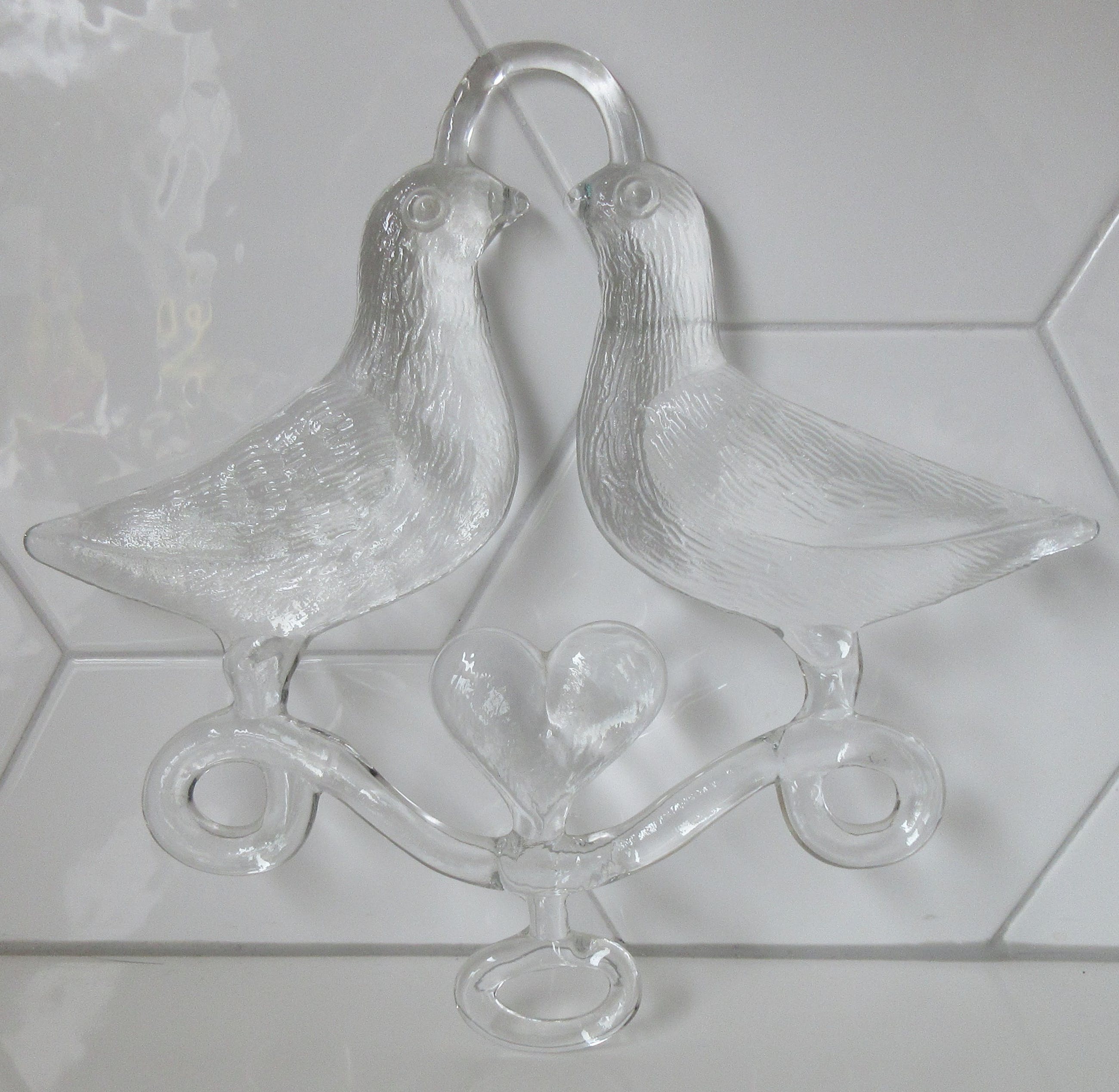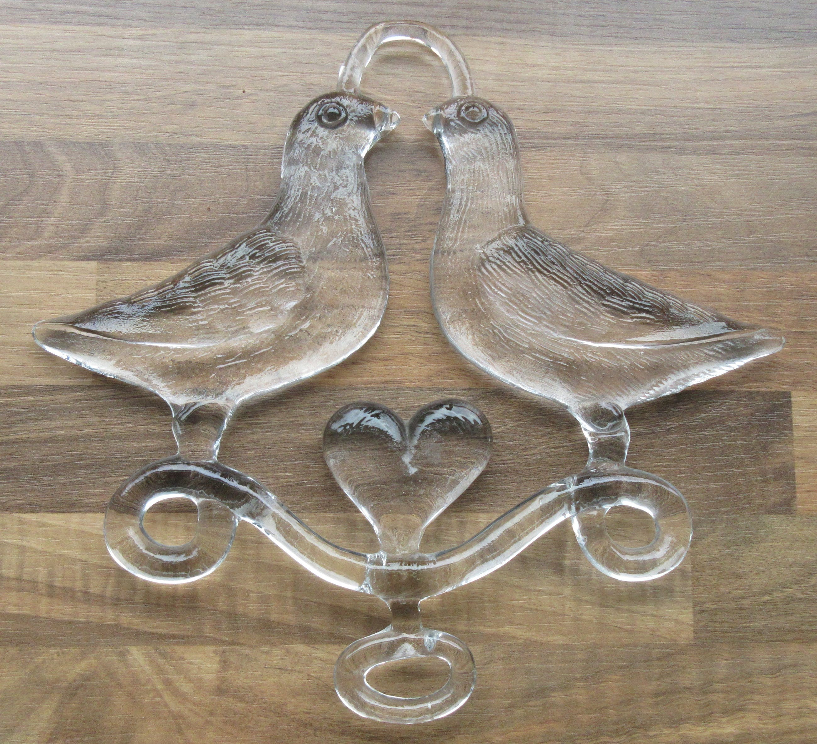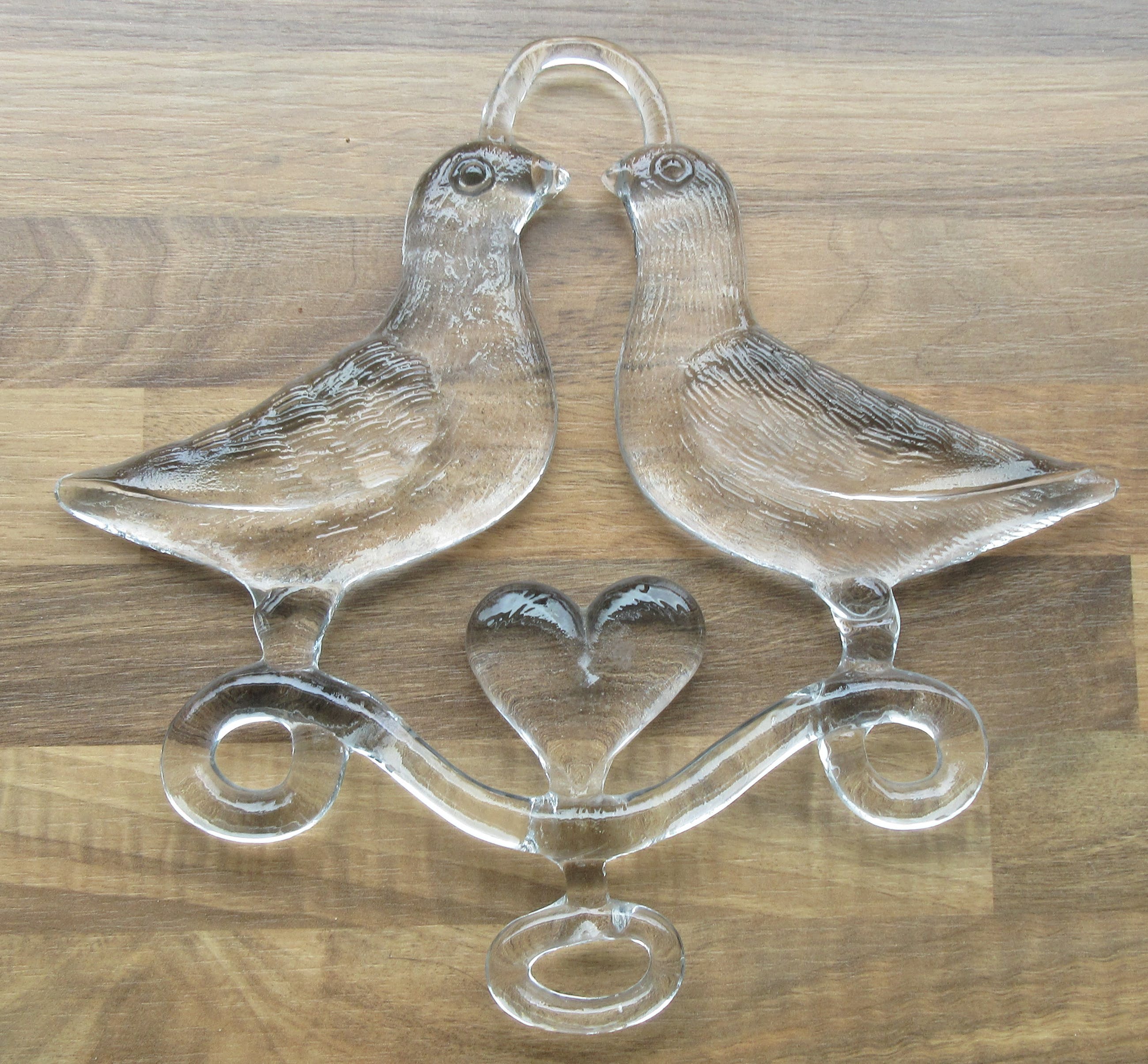 Blank glazen Raamhanger "Two birds in love" ontwerp Bertil Vallien. In prima conditie, bovenaan twee oneffenheden welke afkomstig zijn uit de glasmal. Niet gemerkt, but signed all over.
