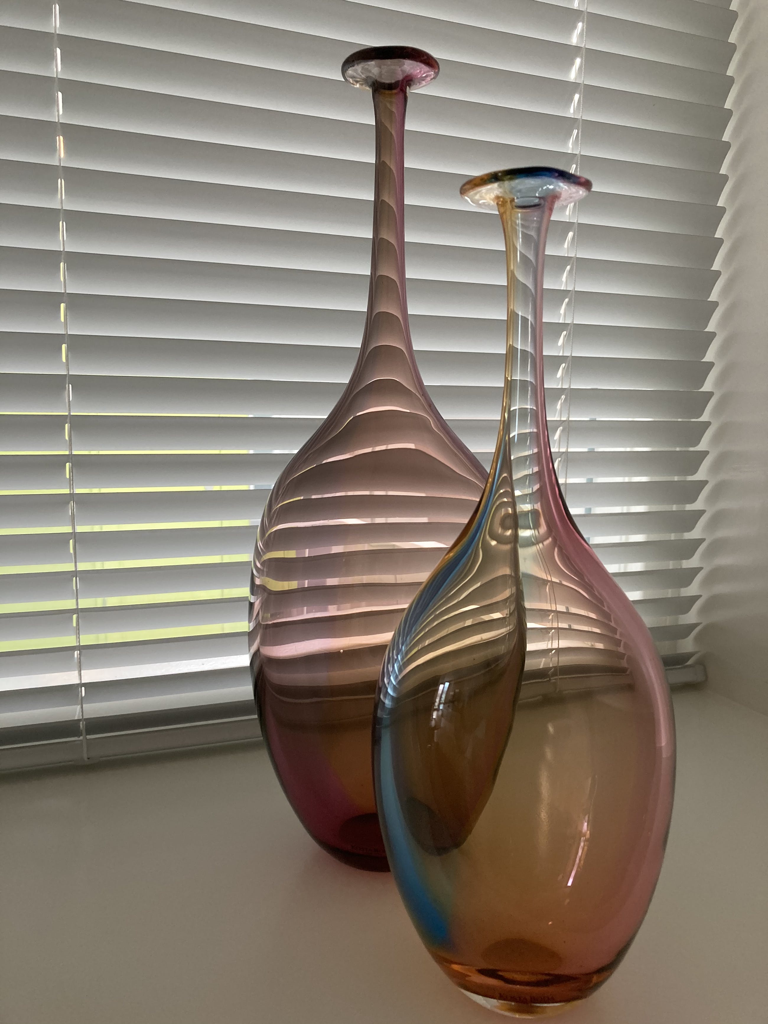 Aangeboden uit de serie fidji van kosta boda de small en de medium uitvoering gesigneerd op de bodem door Kjell Engman en tevens fabriek sticker van kosta boda op de flessen zelf In goede staat met minimale krasjes en gebruikssporen Er bevinden zich wat stofrestjes op de bodem van de flessen niet storend Alleen als set te koop aangeboden minimale bod voor beiden flessen 90 €