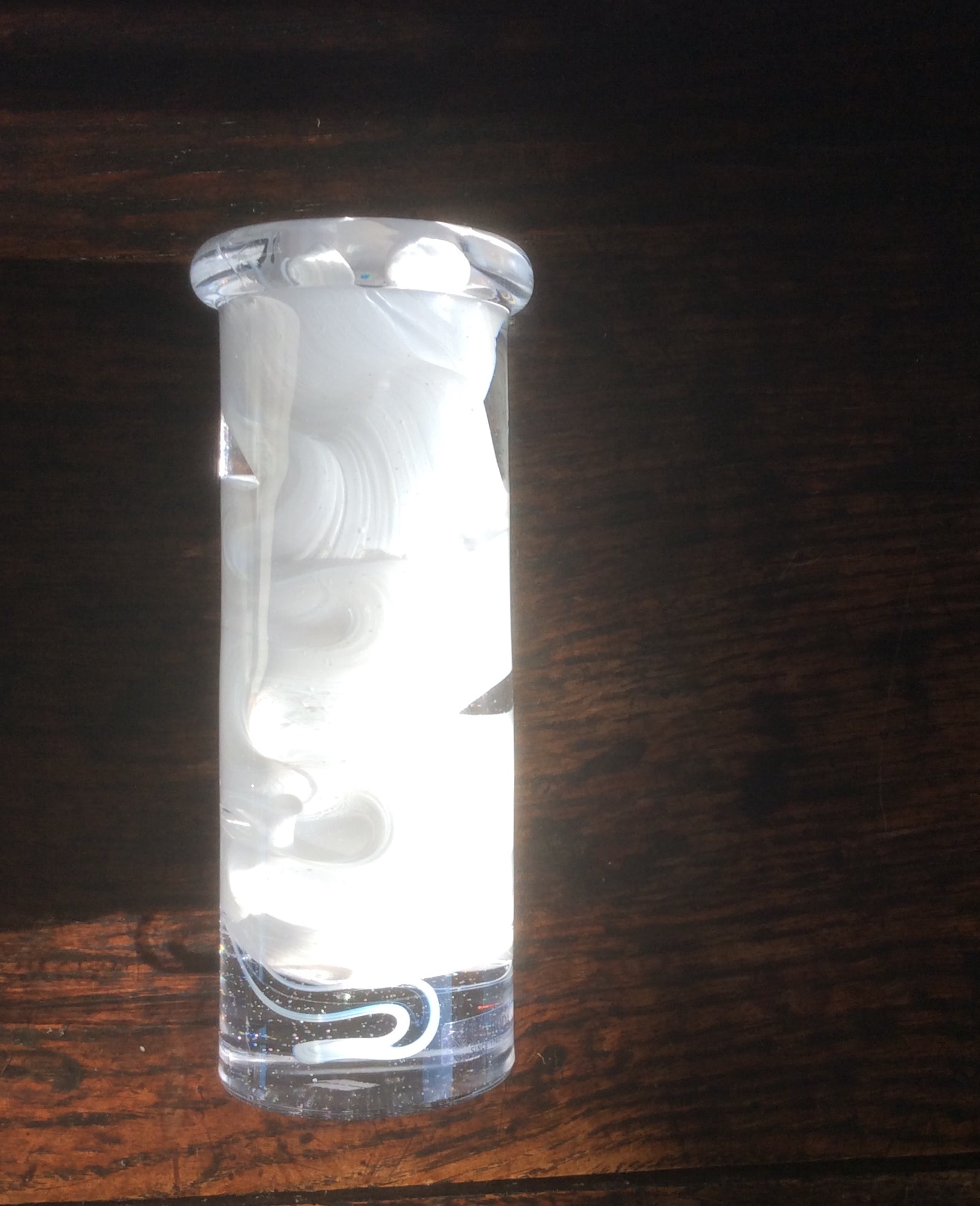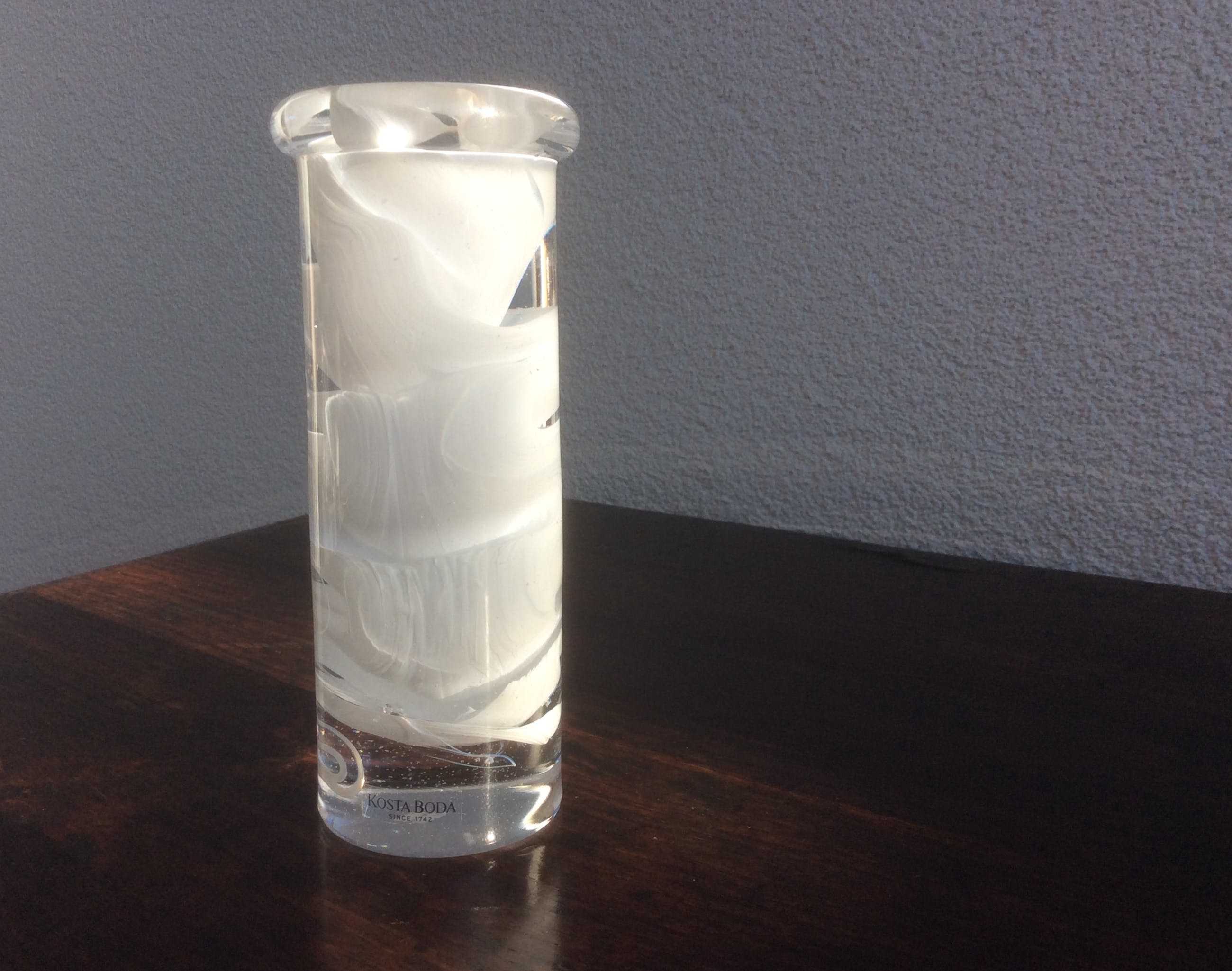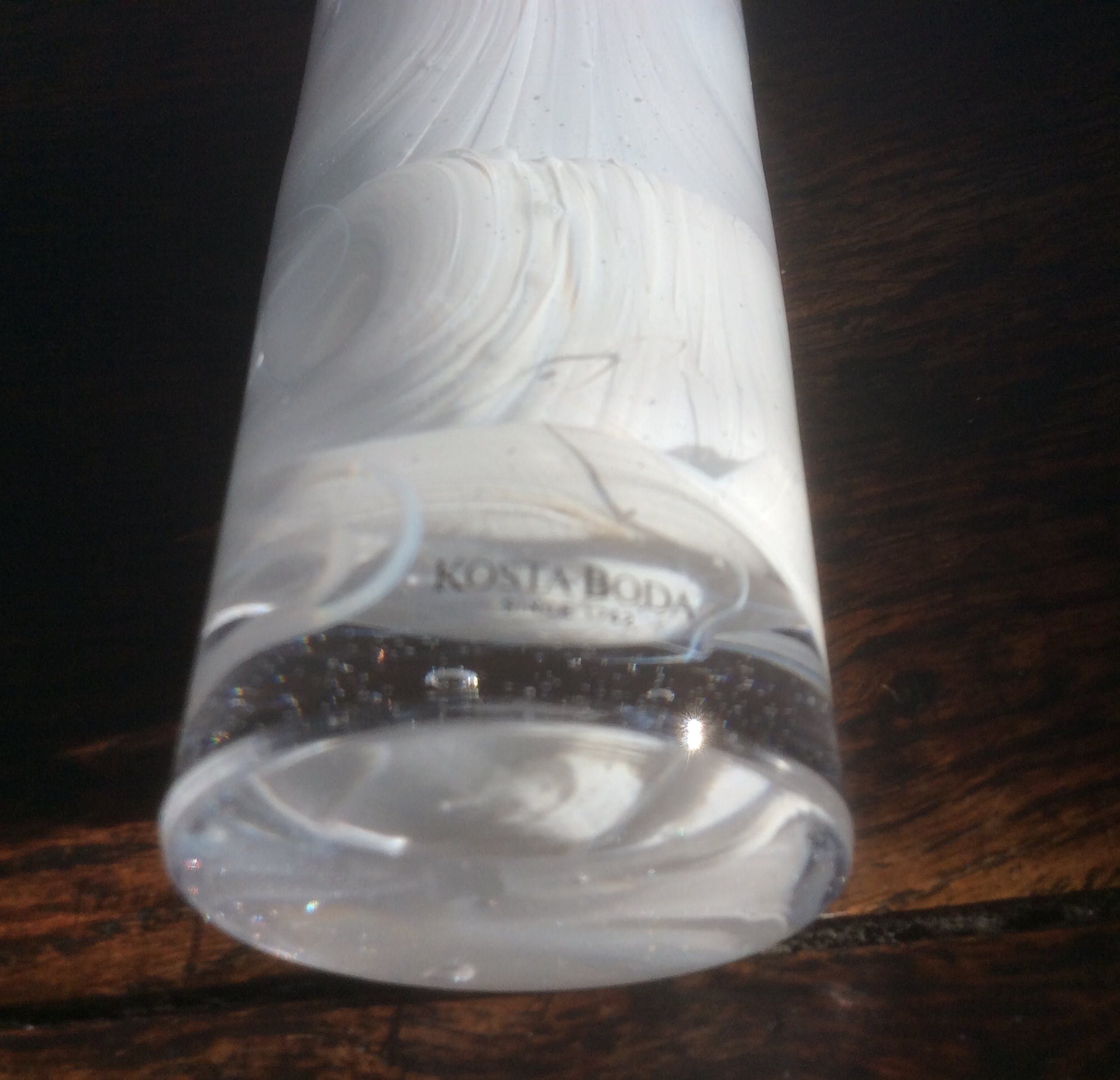 Een massief witgewolkte glazen kaarsenhouder met sticker “Kosta Boda since 1742”. Op de onderzijde staat Kosta Boda gegraveerd.