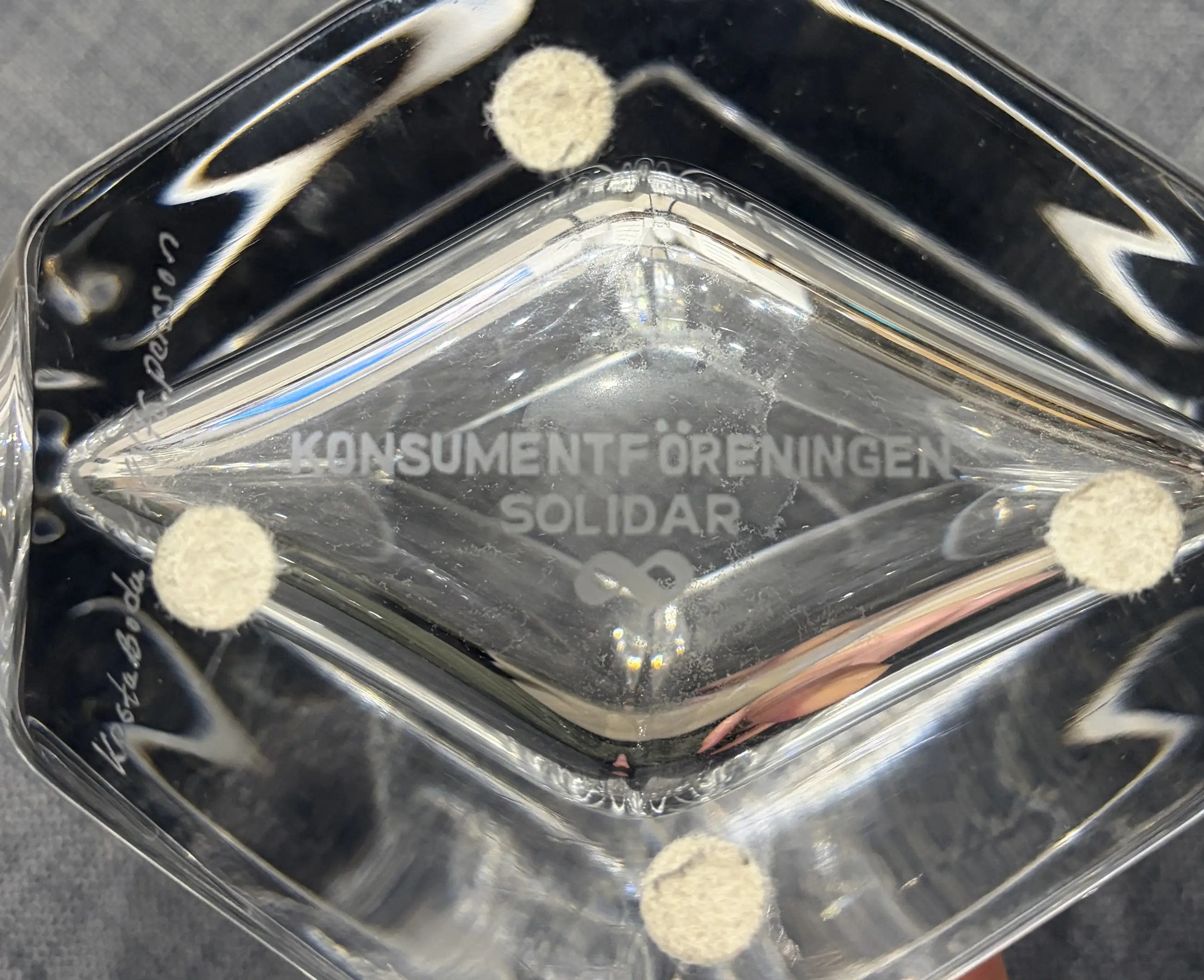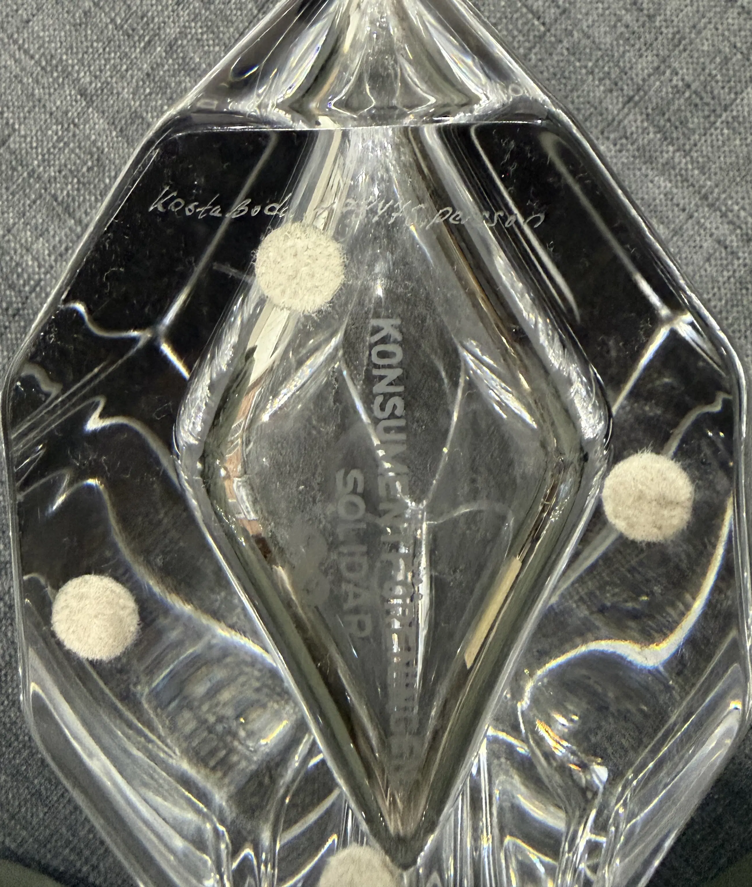 Het sieraad heeft nog steeds het originele Kosta Boda-label: "Volledig loodkristal – Handgemaakt – Zweden."