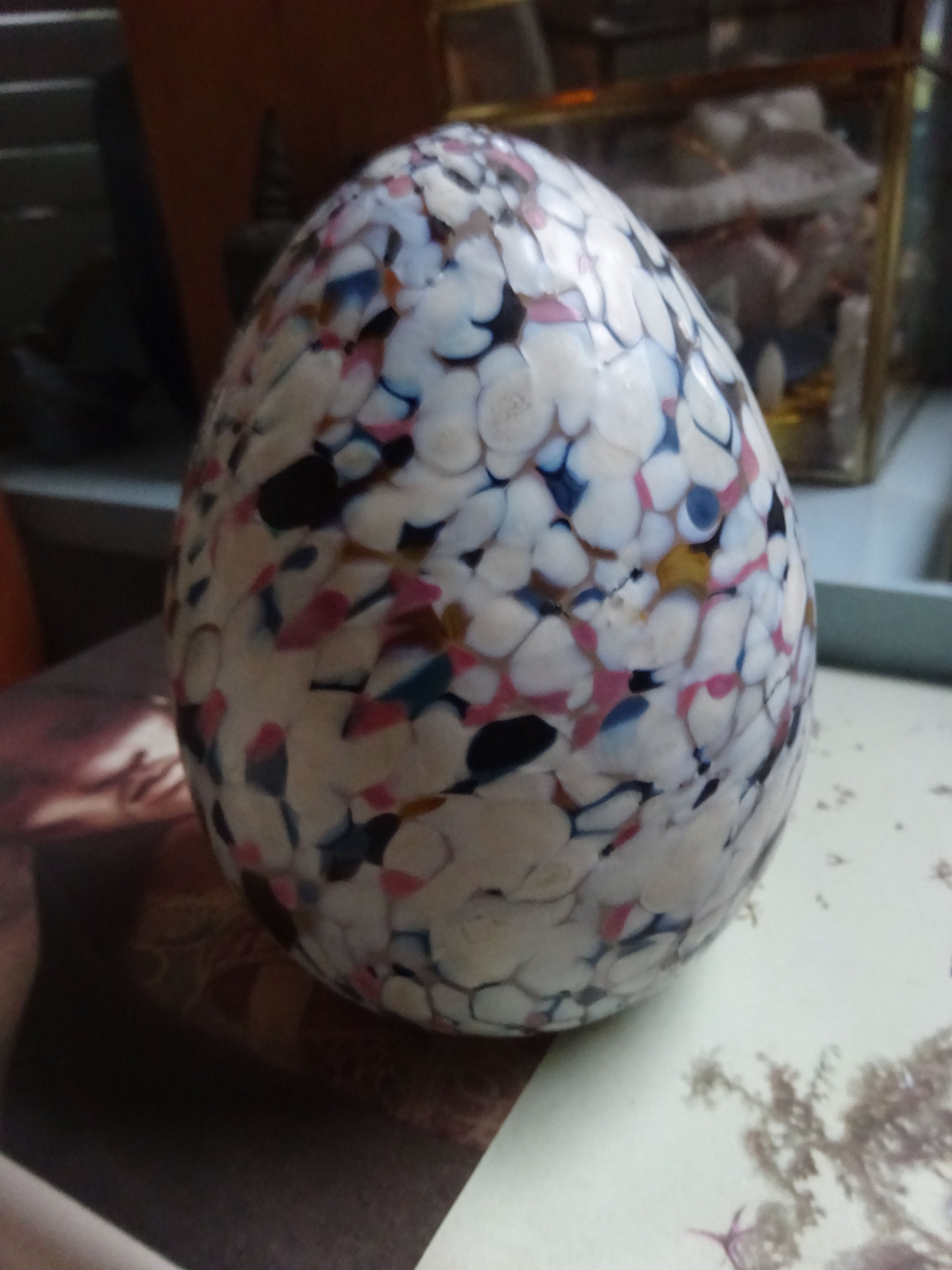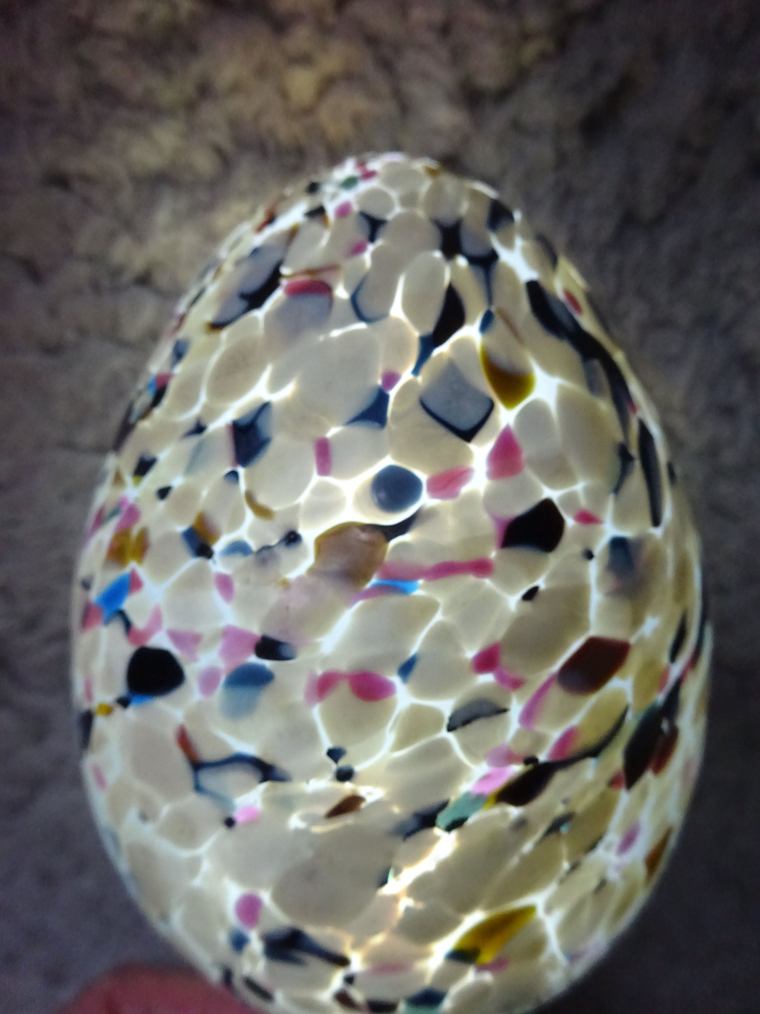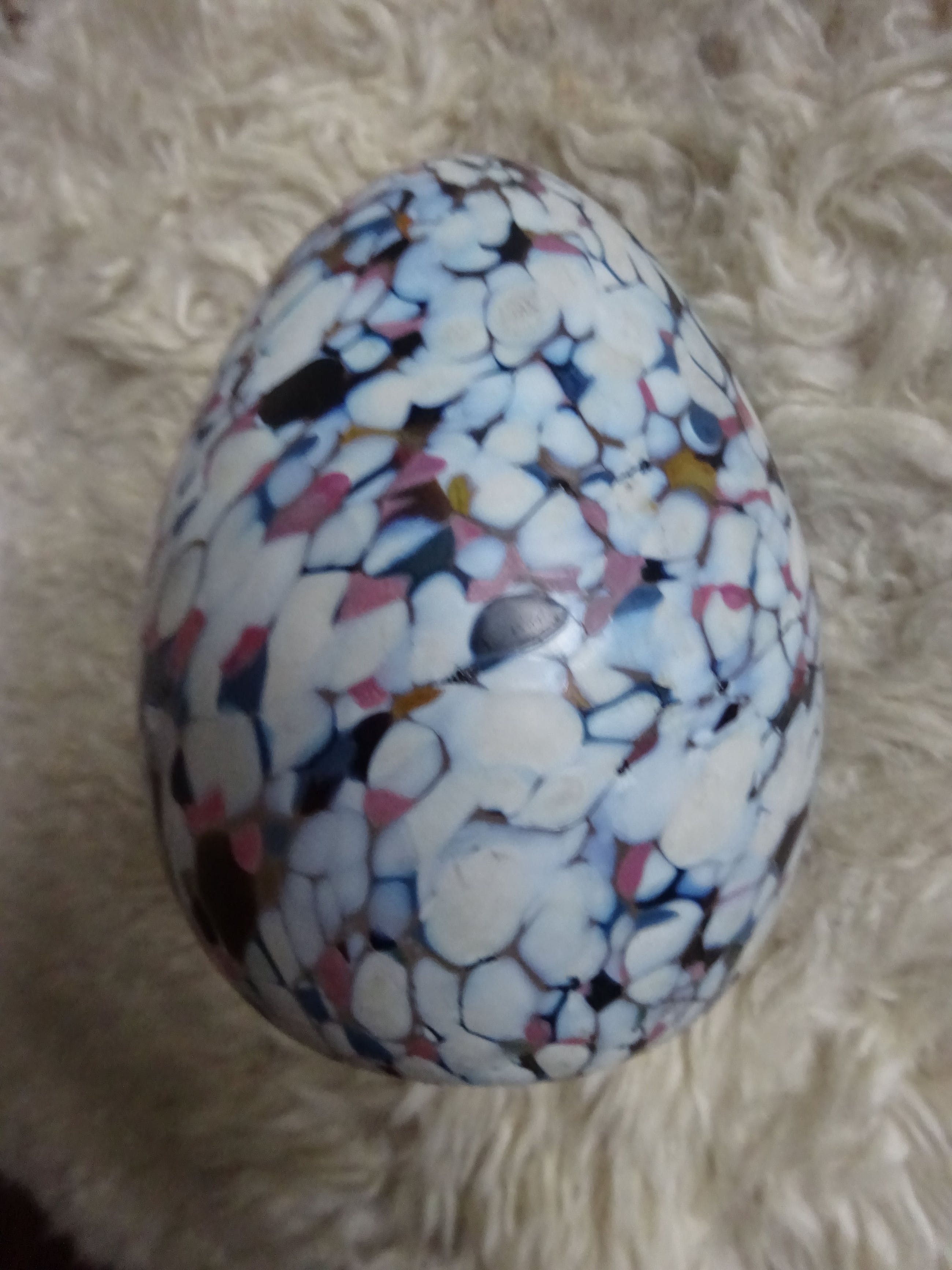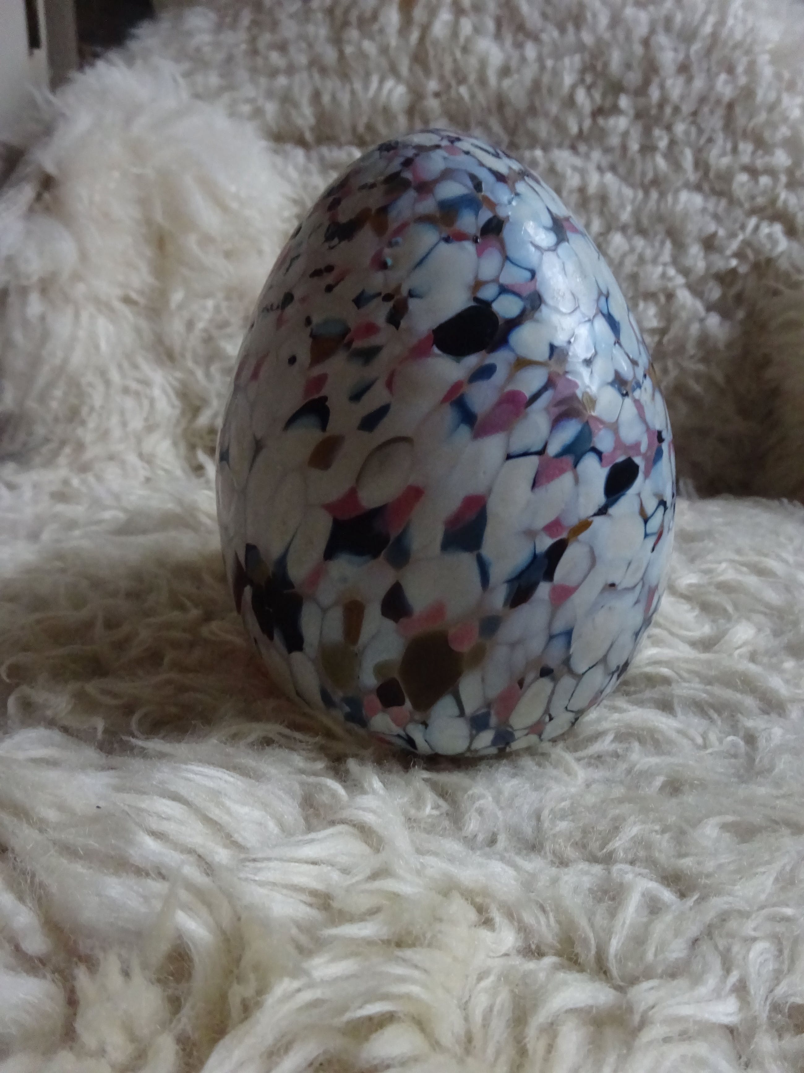 Fors glazen ei met gekleurde vlokken. Het ei is een glasobject en staat zelfstandig. Er kan ook een lichtje in gemaakt worden, dan komen de kleuren nog beter uit. Ik heb zelf de foto's gemaakt met een kleine zaklamp er in.